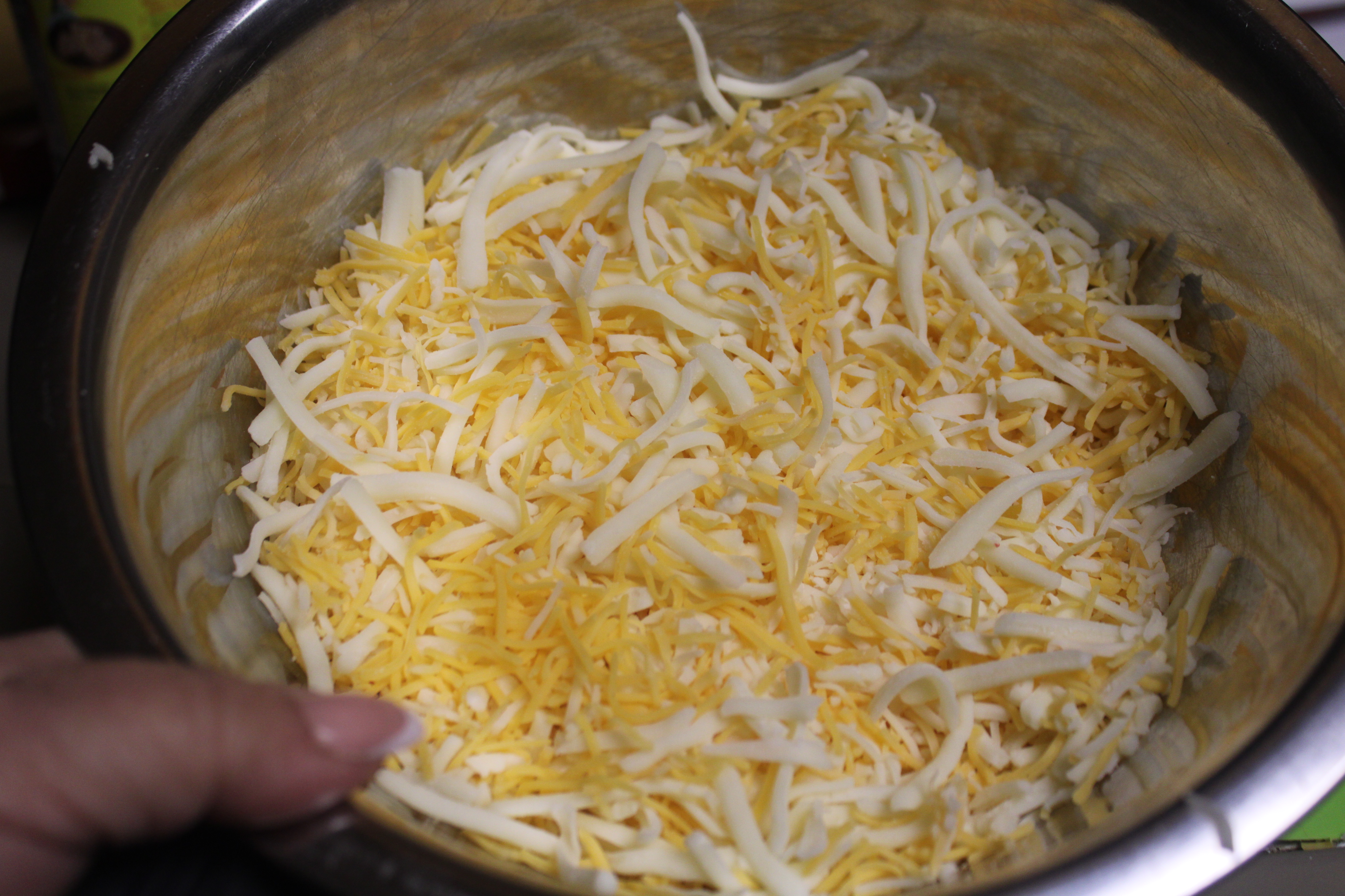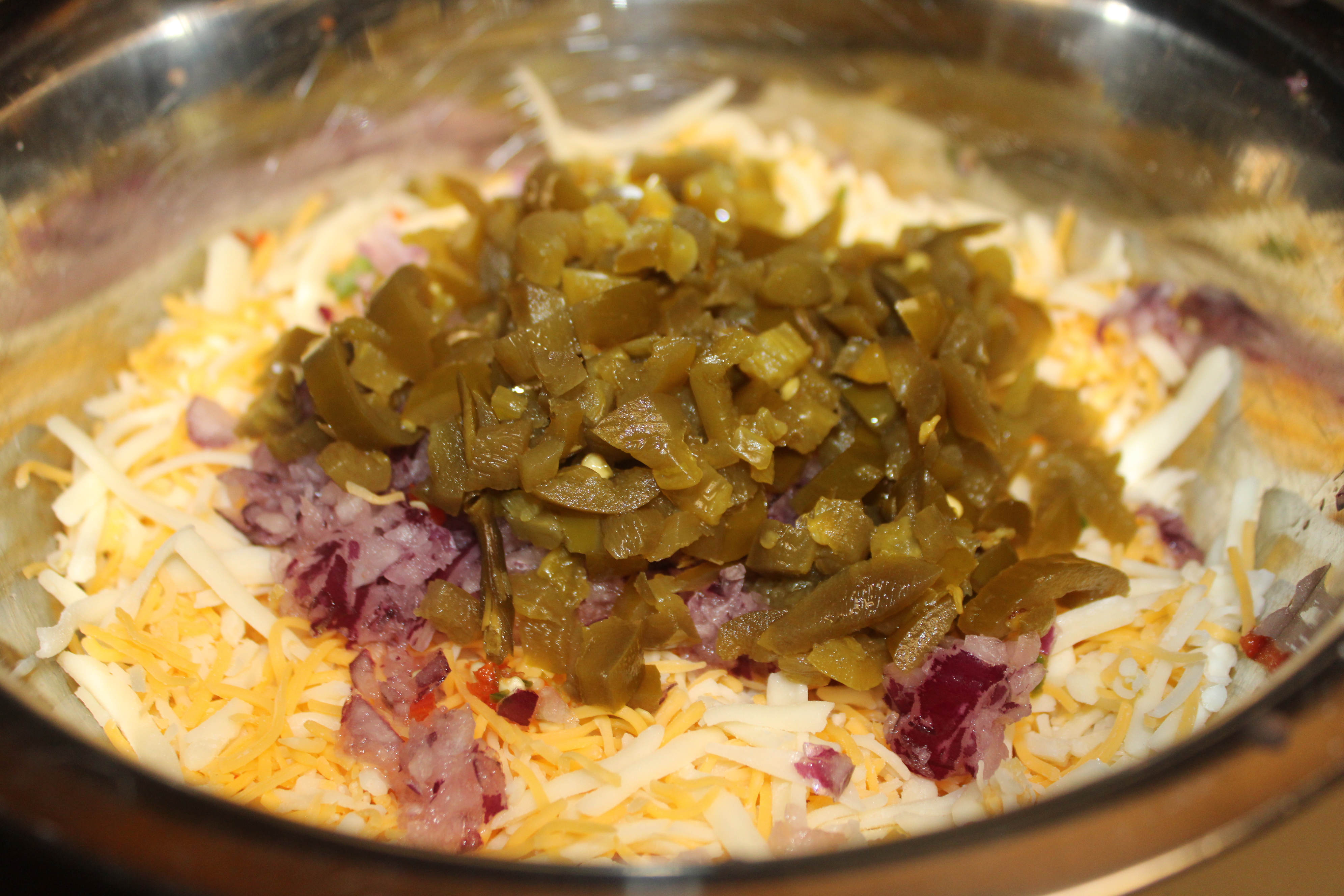In a bowl mix all of the Colby, Cheddar and Pepper Jack Cheese cheeses along with a cup of melting cheese, remaining can of diced chilies, onion and peppers. Set aside.