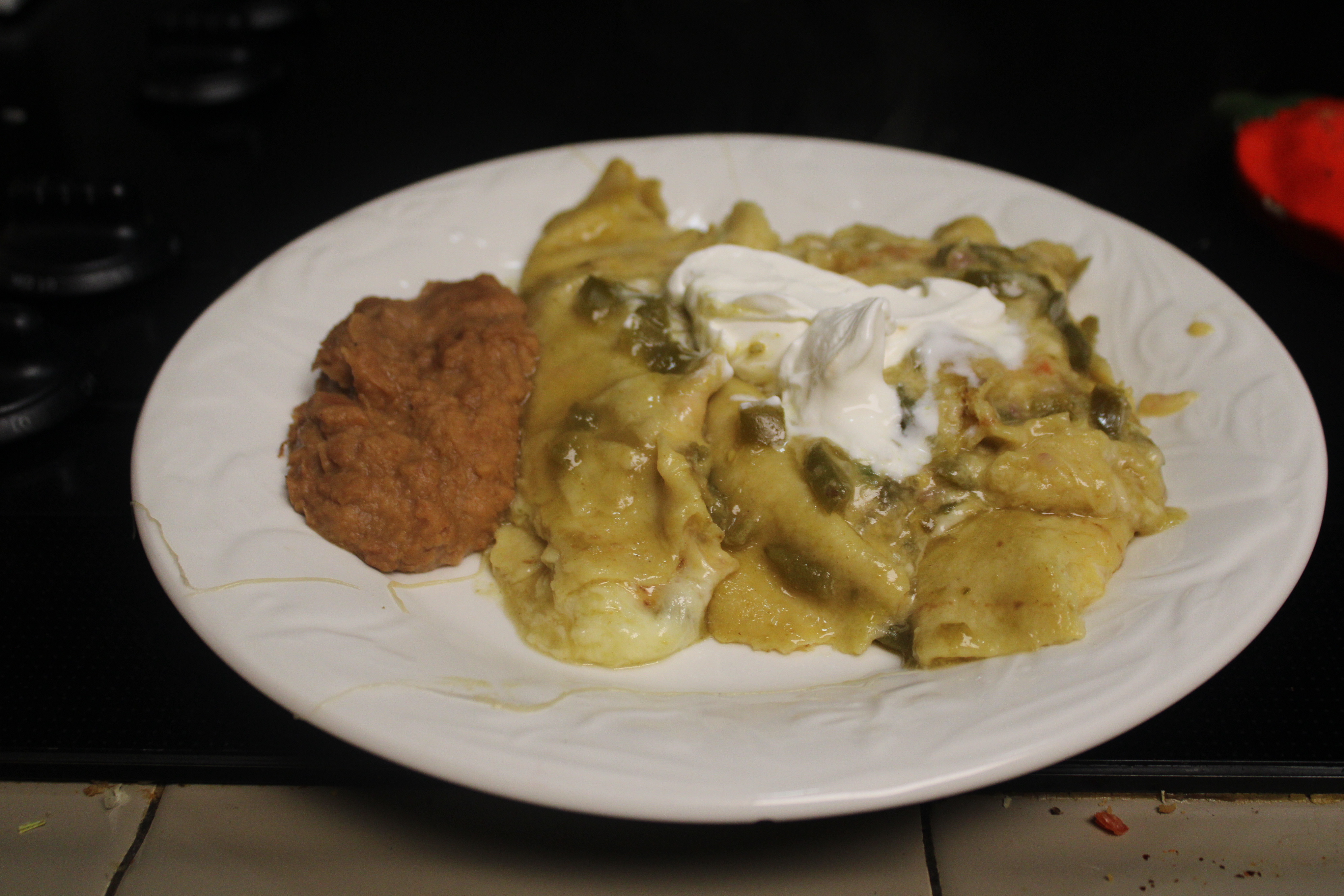 Serve garnished with sour cream as desired. Enjoy with refried beans and margaritas.