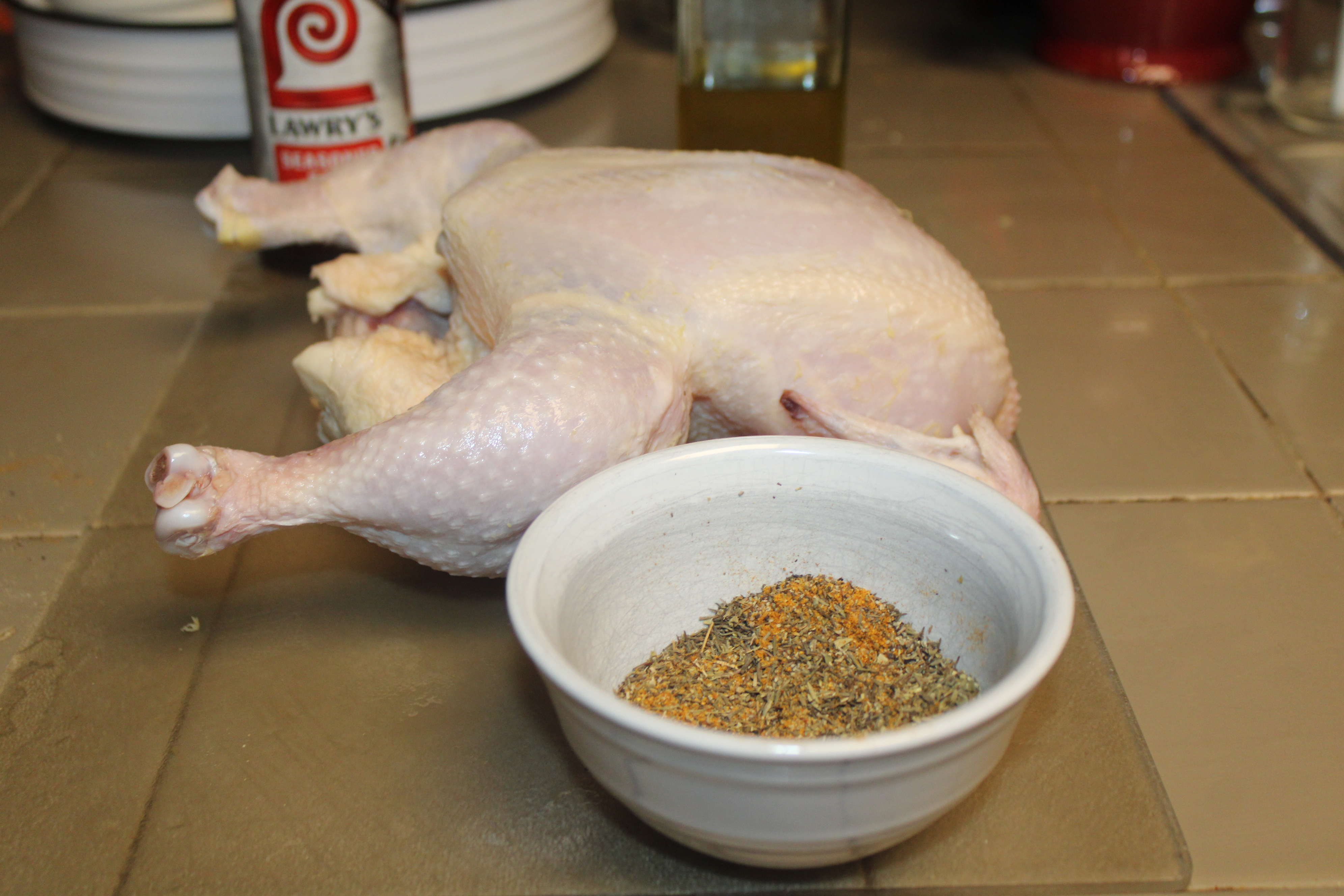 Rinse chicken and cavity with cold water, pat dry with paper towel. Once dry oil the outside of the chicken well with olive oil. Sprinkle seasoning salt inside and out, set bird aside.