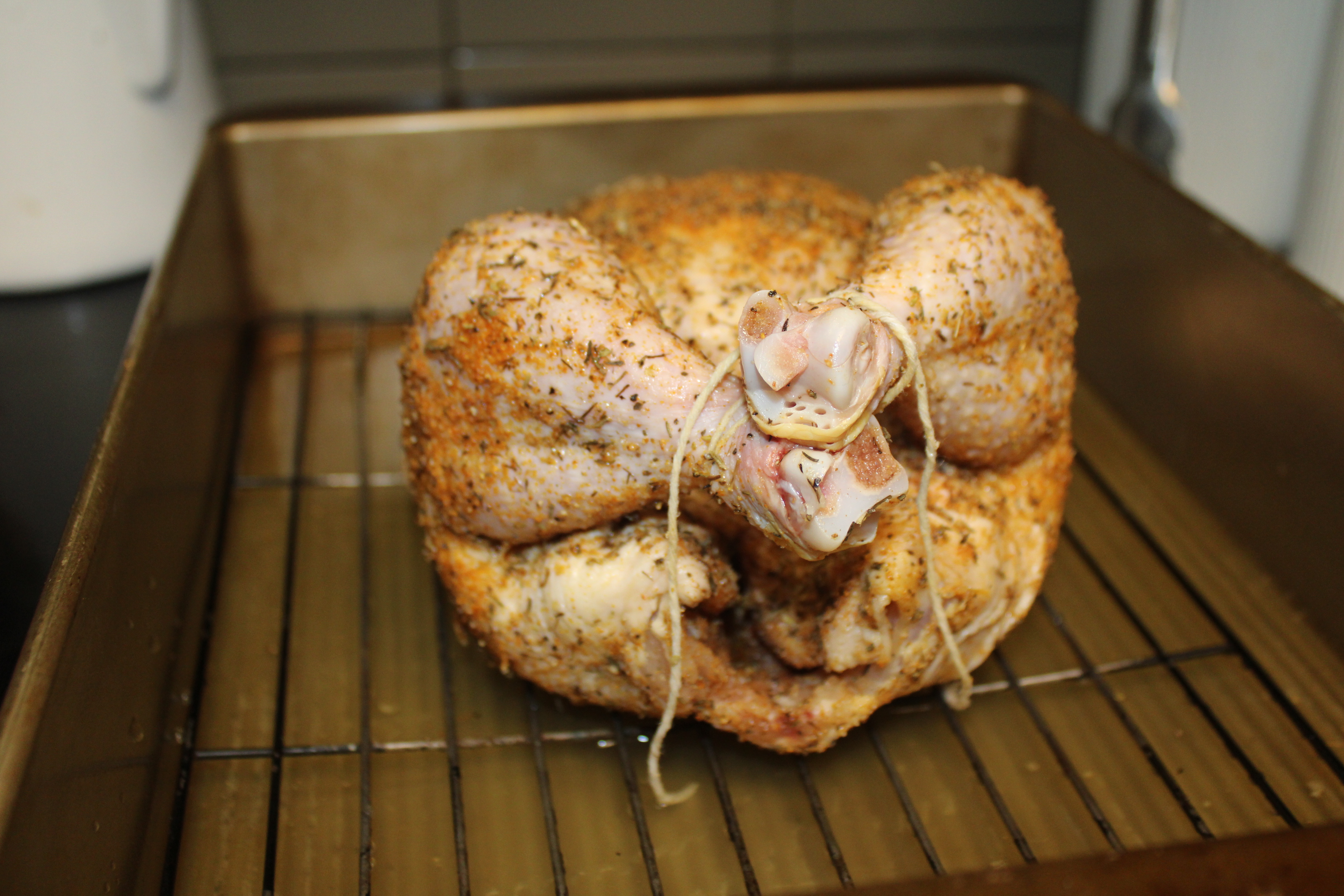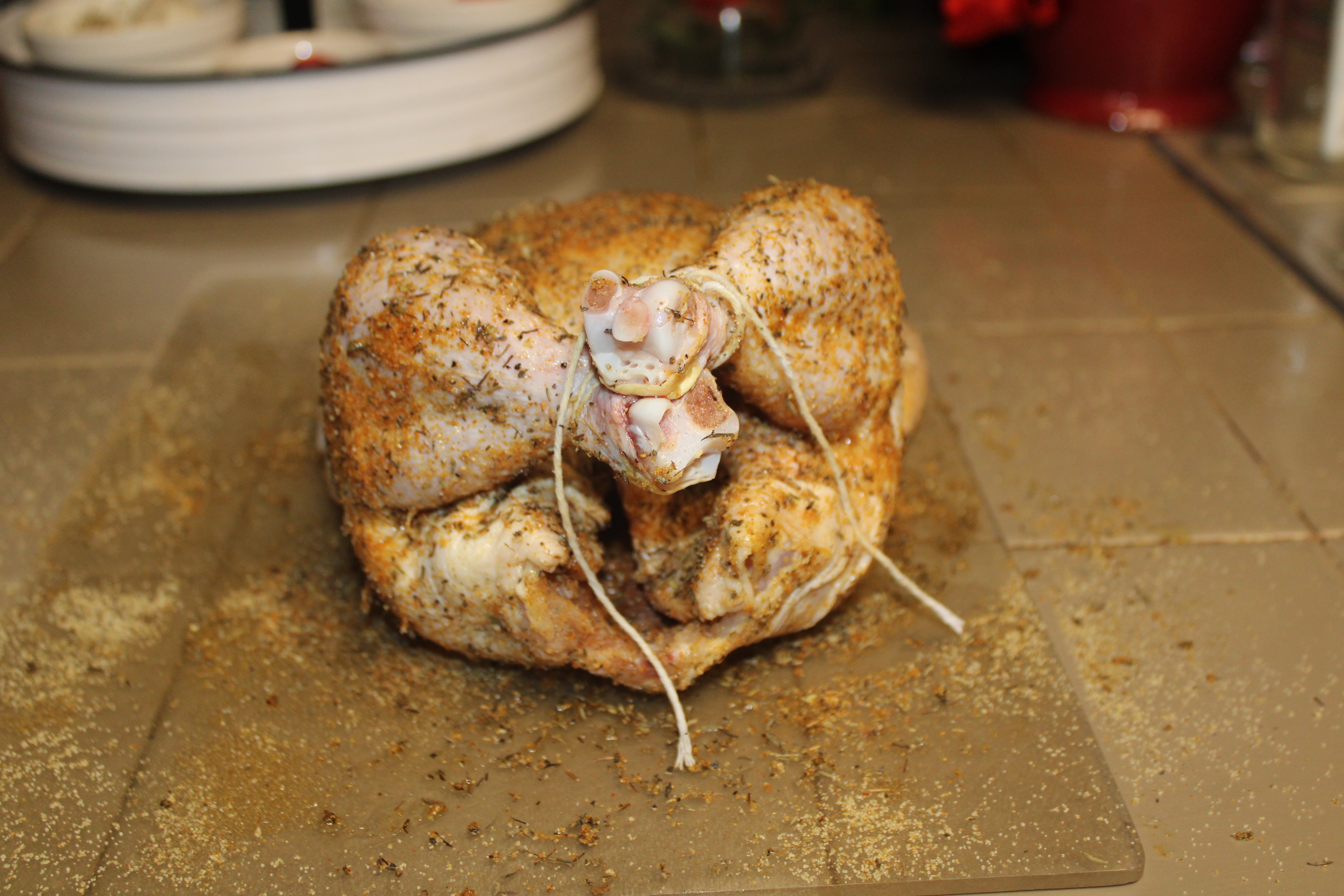 In a small bowl whisk together paprika, garlic powder, dried thyme, Italian seasoning blend and coarse black pepper. Sprinkle spice-herb mixture evenly over the outside of the chicken. Tie legs together, tuck wings under the breast.