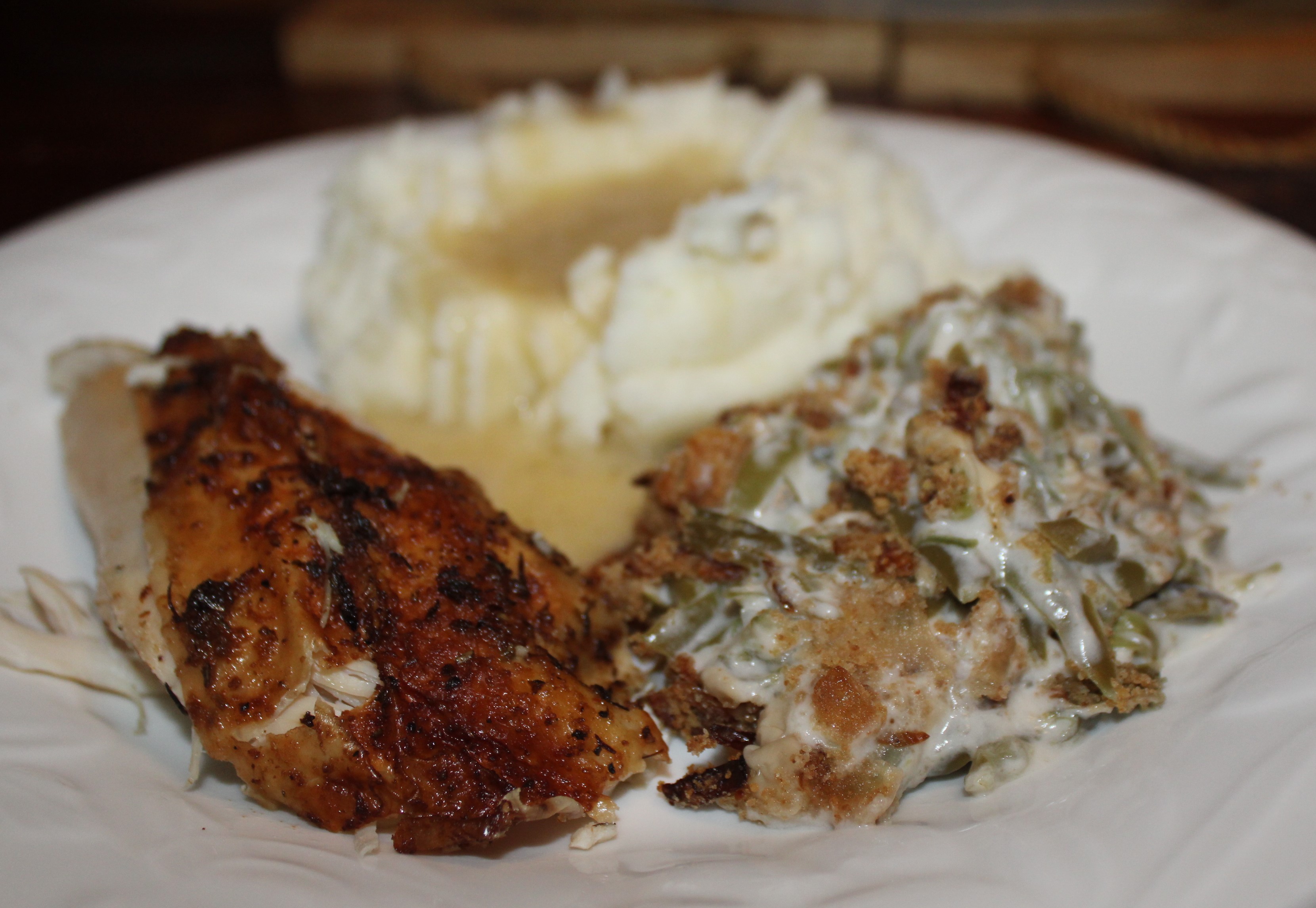Note: If there is not enough room in the oven for the green bean casserole and the chicken, and there is no second oven available the chicken can be cooked in a large Electric Roasting Pan.