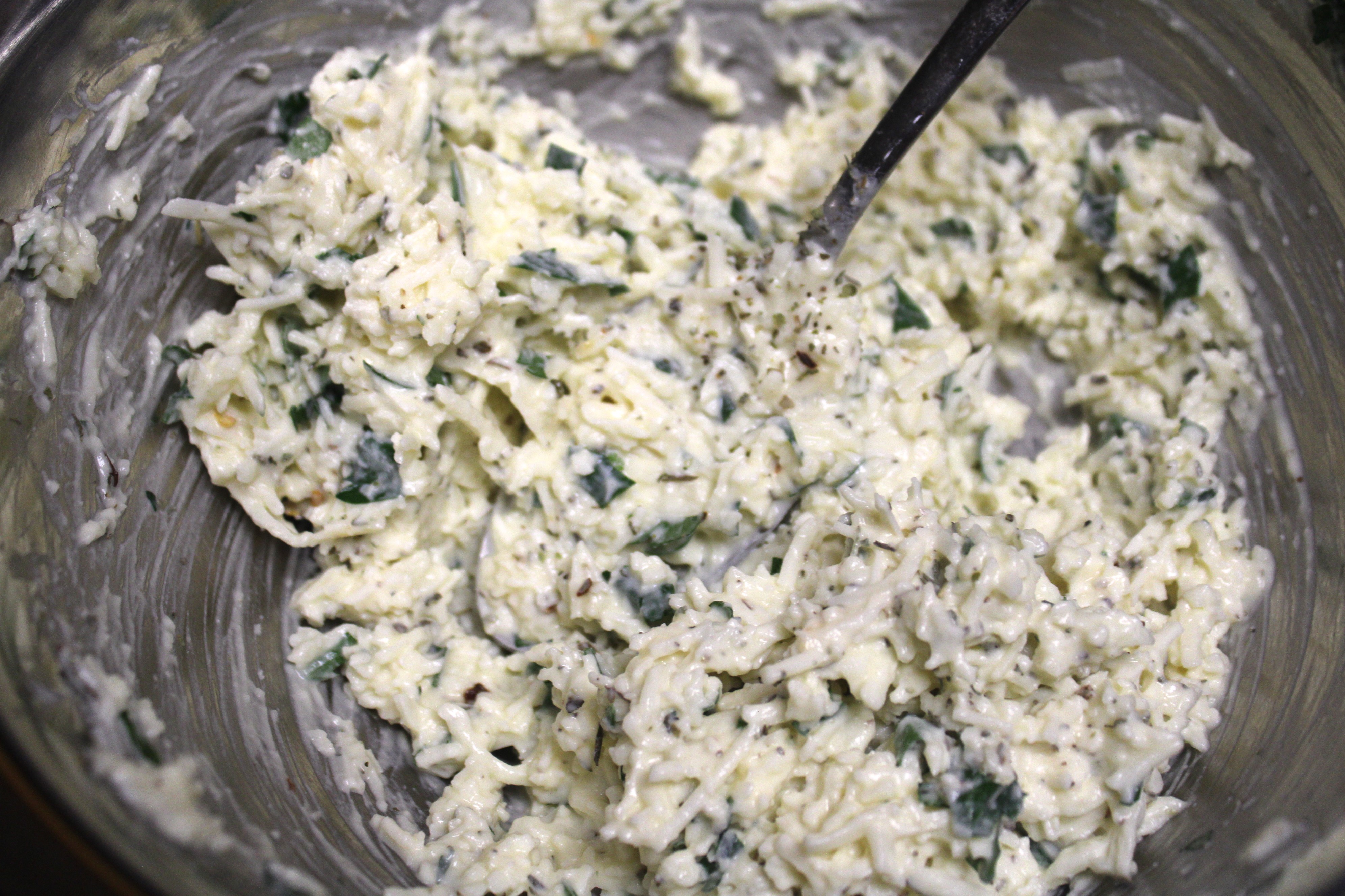 In a bowl, combine Ricotta, Parmesan, and Mozzarella cheeses together with the egg. Season with a pinch of Spicy Italian Seasoning. Add parsley, mix to blend.