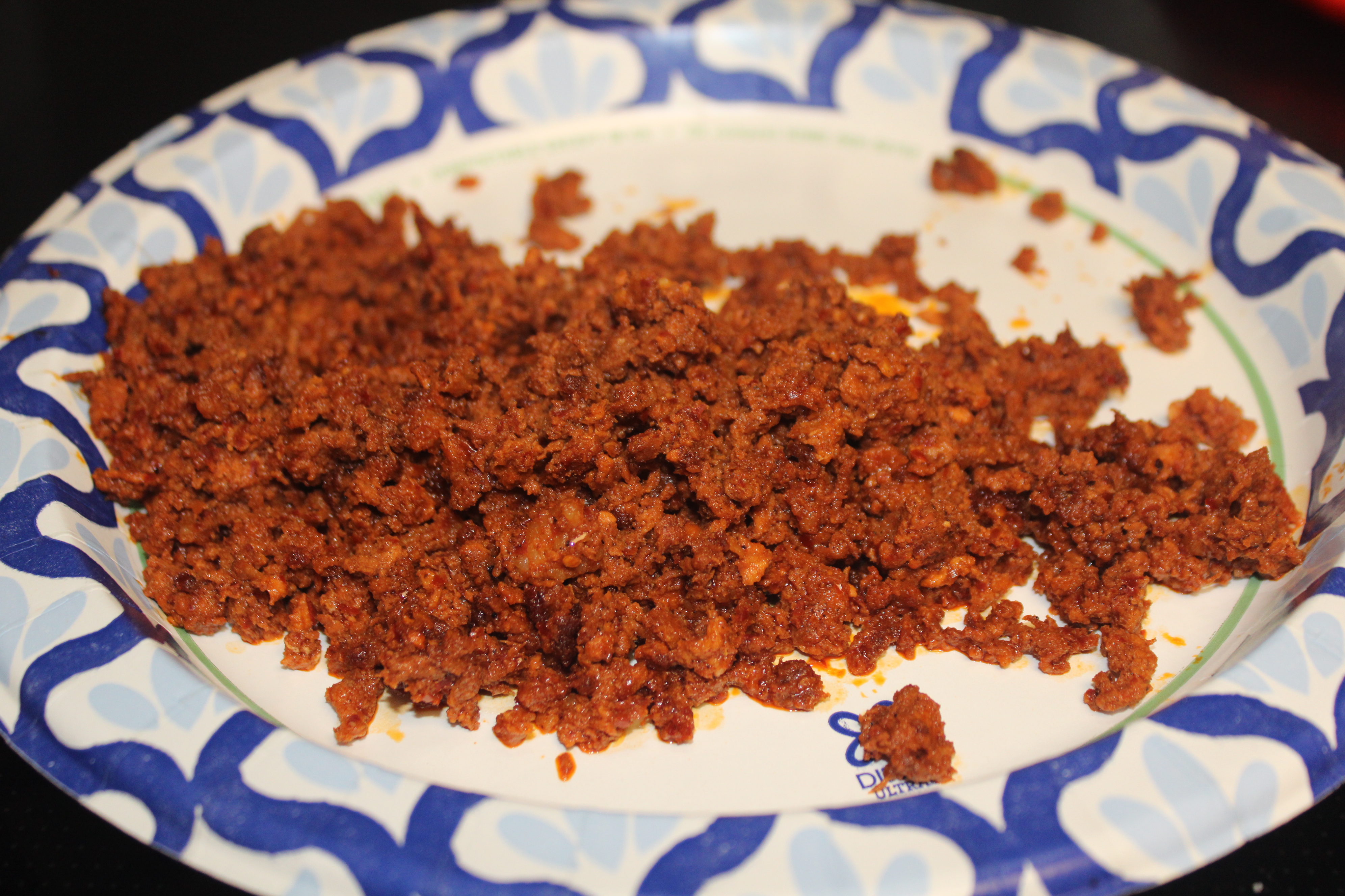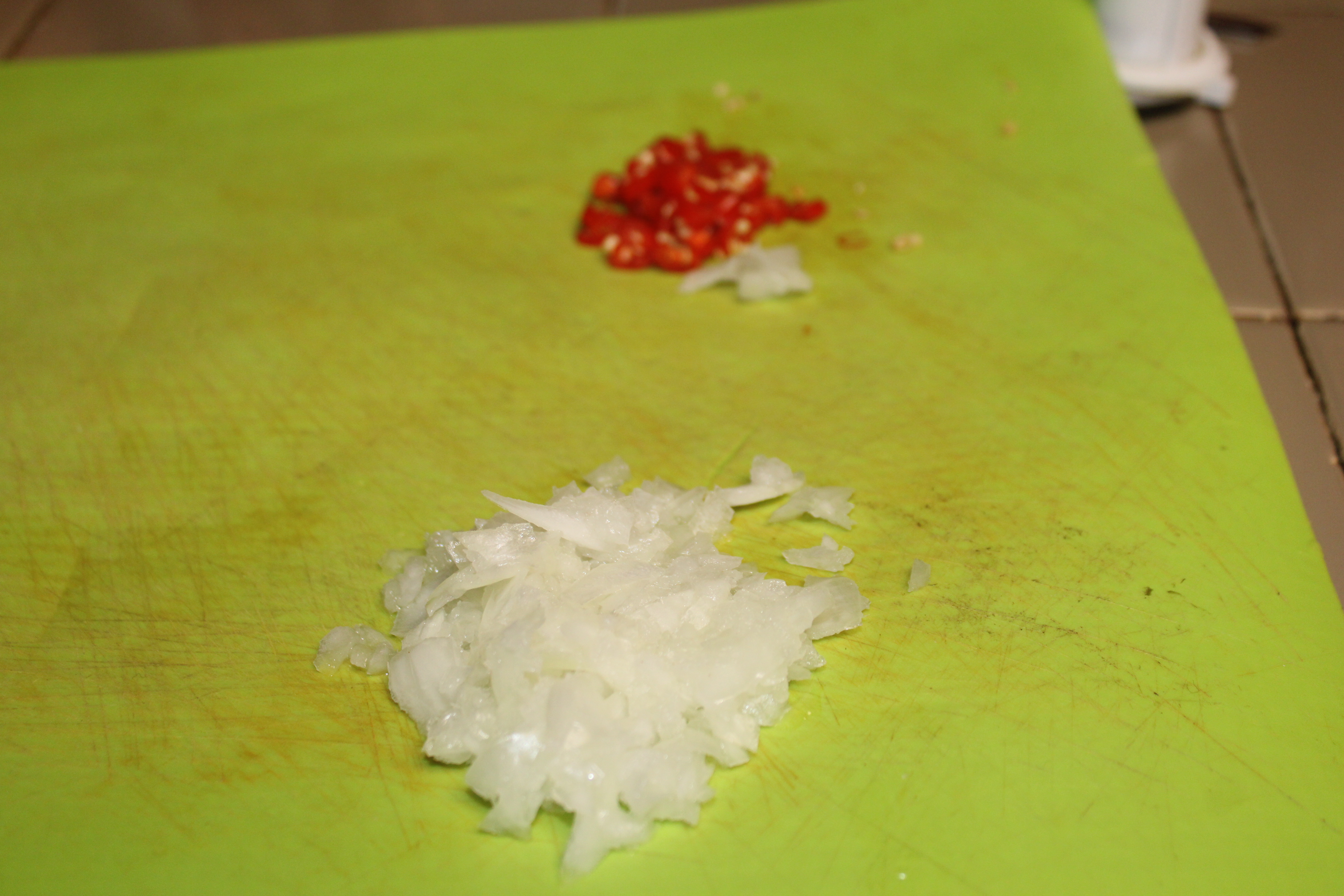 While the chorizo cooks, stem and chop Serrano peppers, set aside. Quarter onion, peel 1/4, dice and set aside.