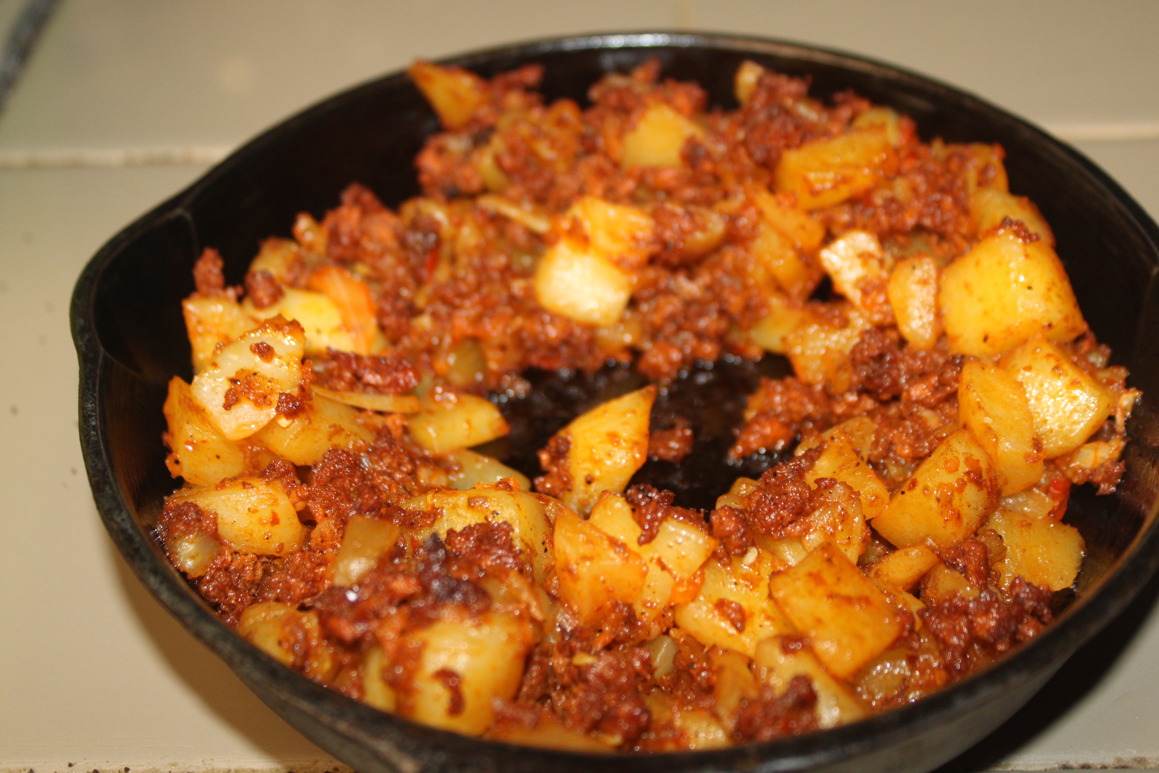 Melt bacon grease in the now empty skillet over medium to medium-high heat. Add diced potatoes and cook, stirring occasionally, for 10 minutes. Add diced onion and Serrano peppers and continue cooking and stirring until potatoes are fork-tender, onion is translucent, and Serrano peppers are soft, about 6 more minutes. Add chorizo back into skillet and stir until heated through.