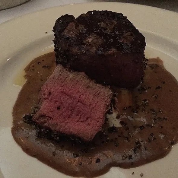 Place 3 squares of potato shingles on each plate. Top each potato square a steak. Pour black peppercorn sauce over 1 steak on each plate, pour pink peppercorn sauce over another steak on each plate and the green peppercorn sauce over remaining steak on each plate.