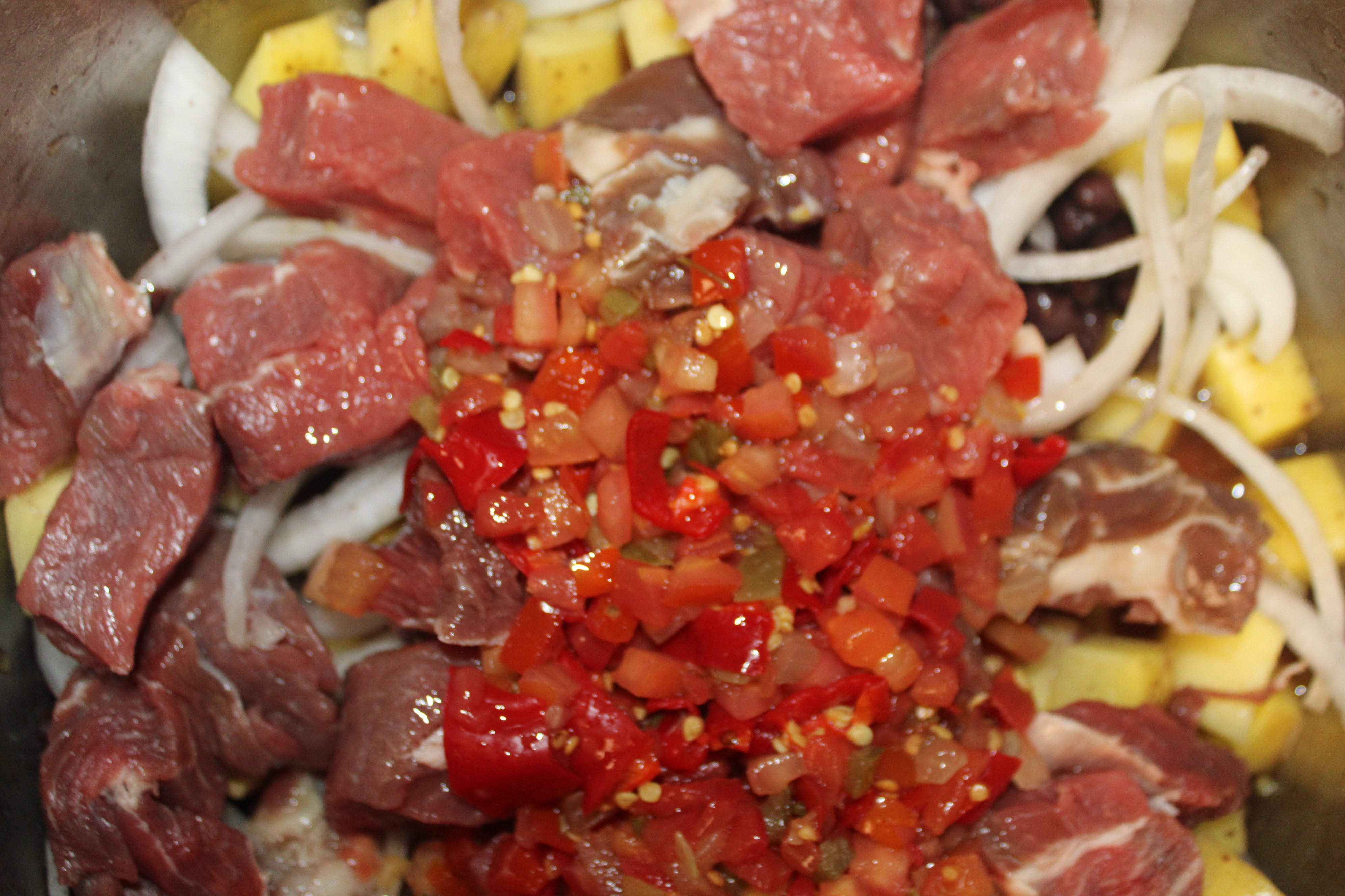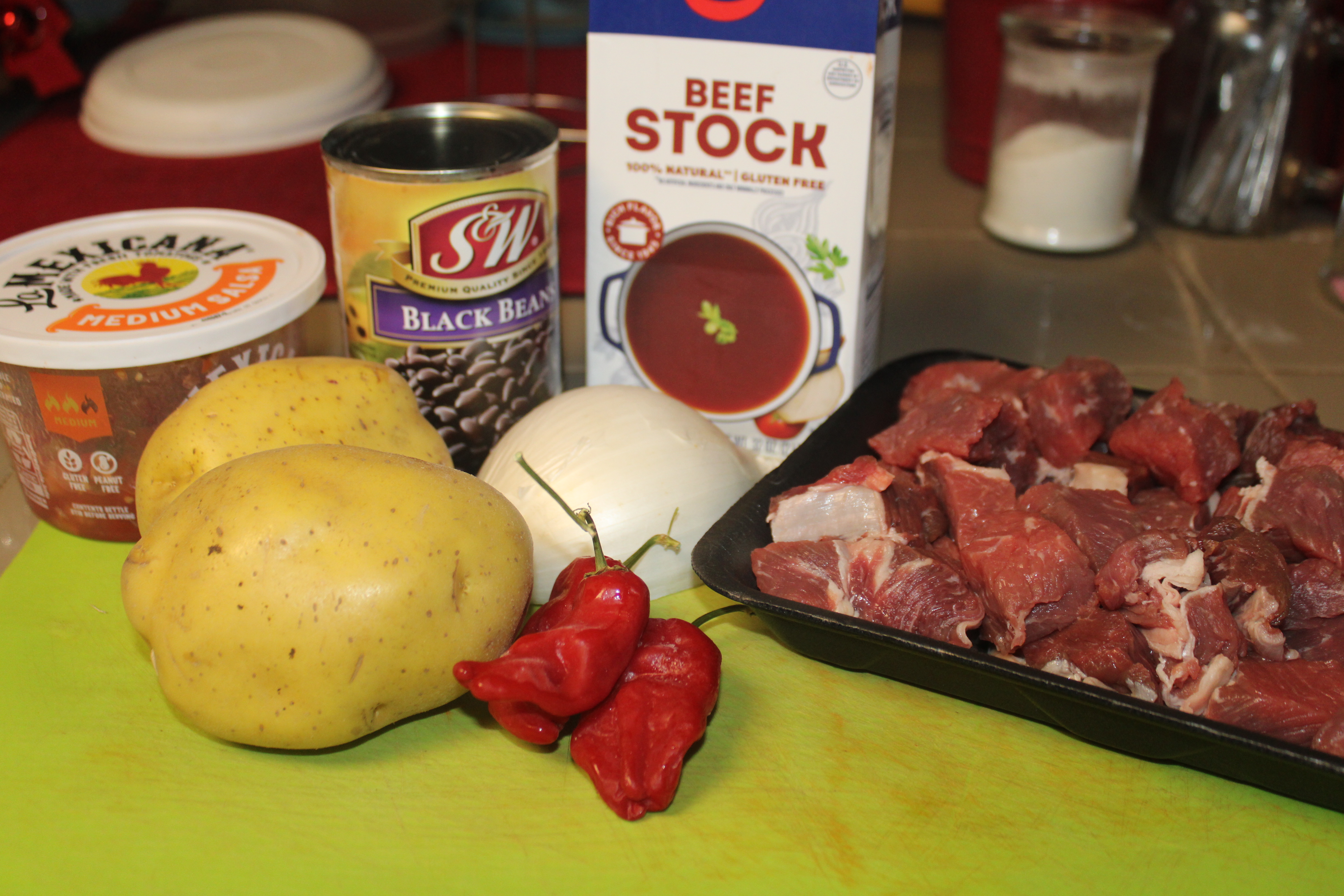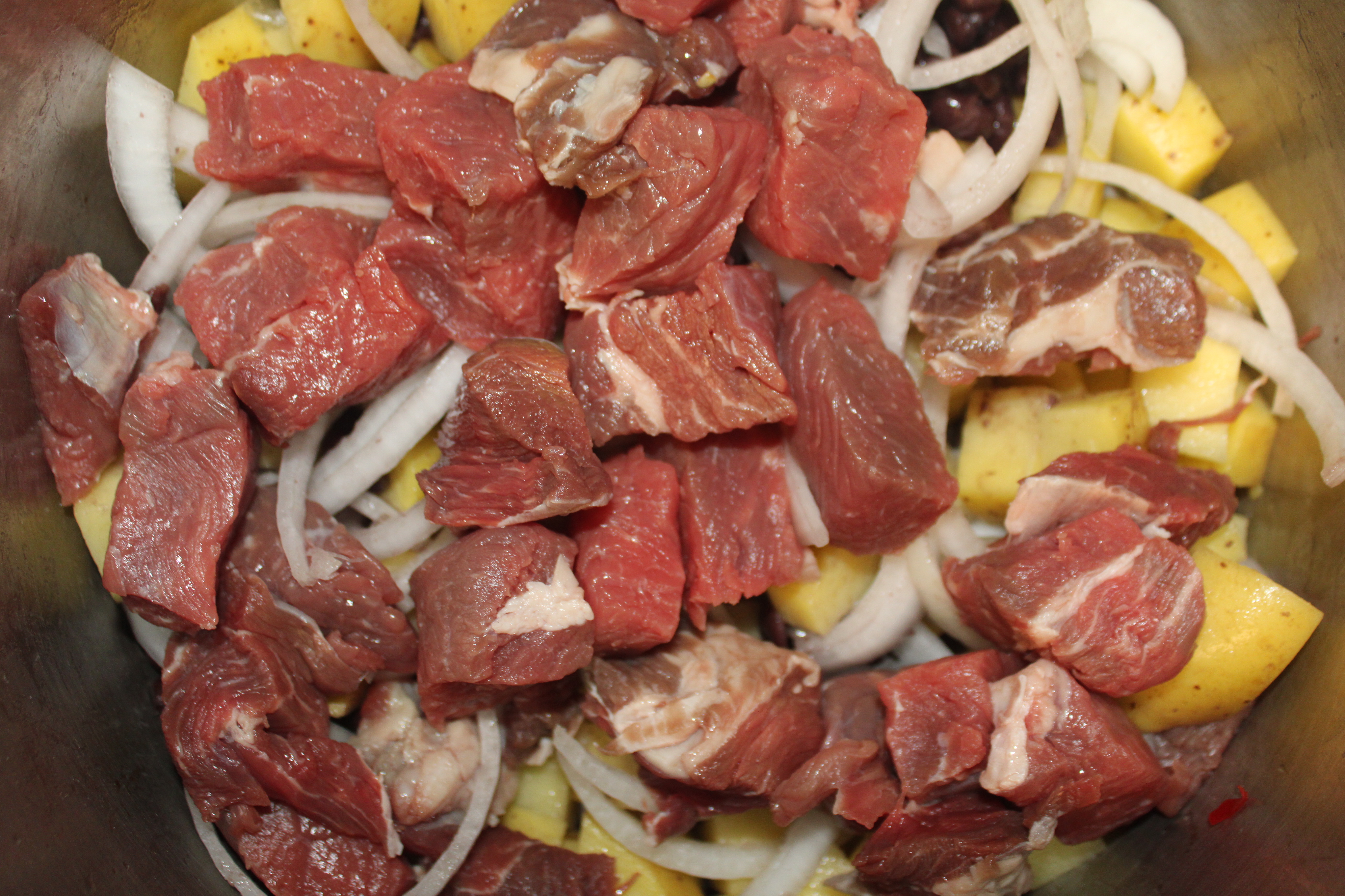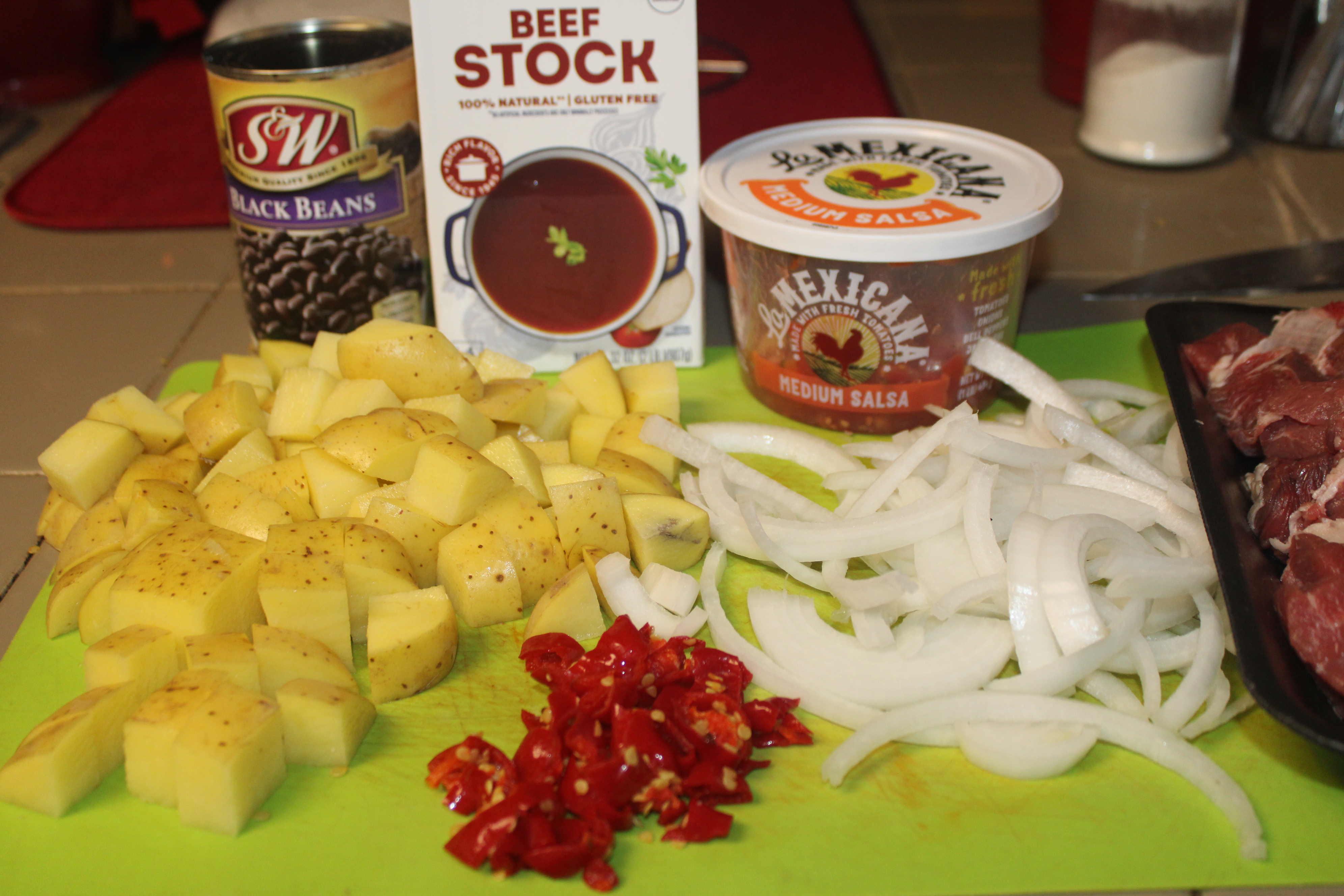 Trim fat from meat. Cut meat into 1-inch pieces. Set aside. Cut potatoes into 1-inch pieces. Cut onion in half, reserve half for another purpose. Peel remaining half of the onion, cut into half-moon rings and break apart. Stem the peppers, mince. Drain the black beans and set aside.