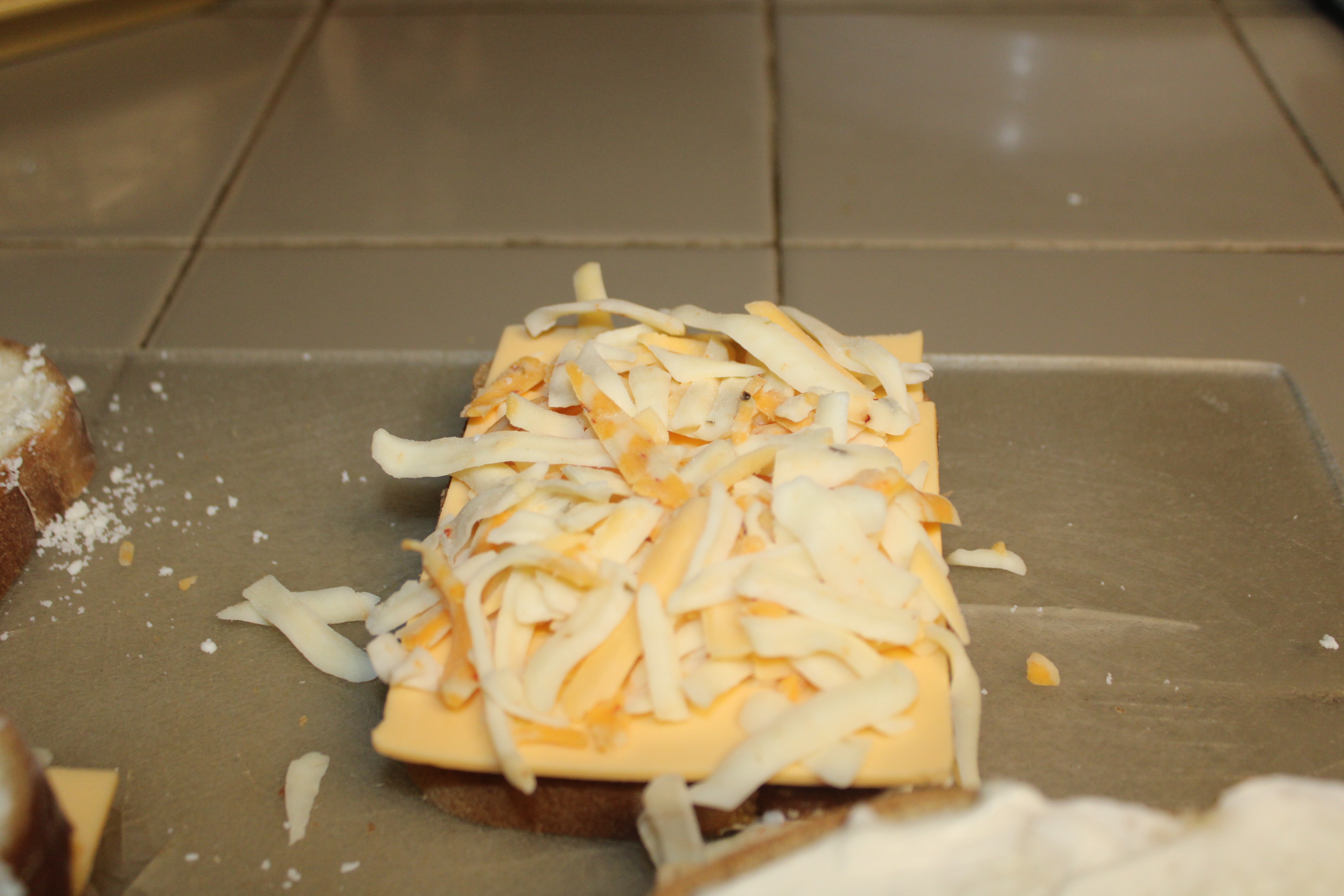 Place 3 slices of bread mayonnaise side down on a work surface. Top with 1 slice of American Cheese and about a quarter cup of shredded Pepper Jack Cheese. Top with remaining bread, mayonnaise side up.