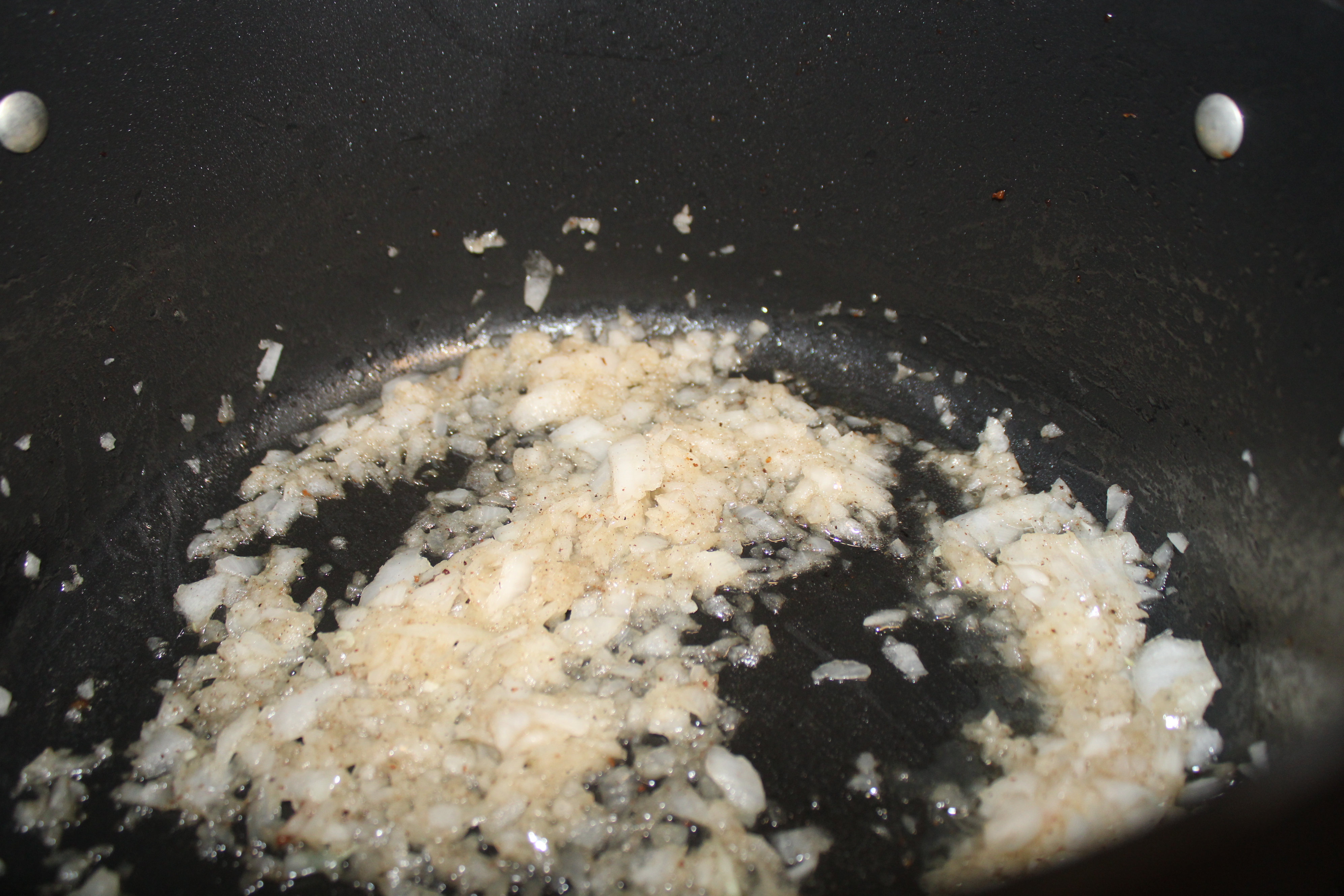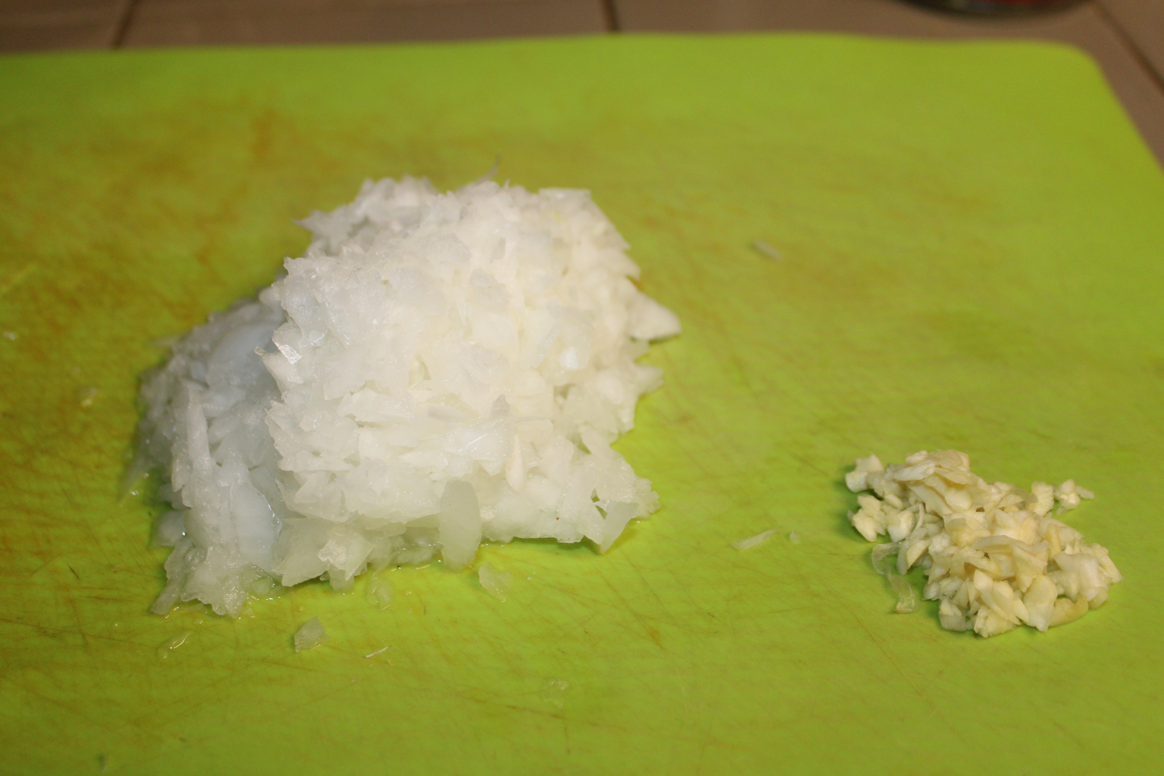 While the bacon is frying cut the onion in half from root to tip. Reserve half for another purpose, dice remaining half. Peel and mince garlic. Set aside.