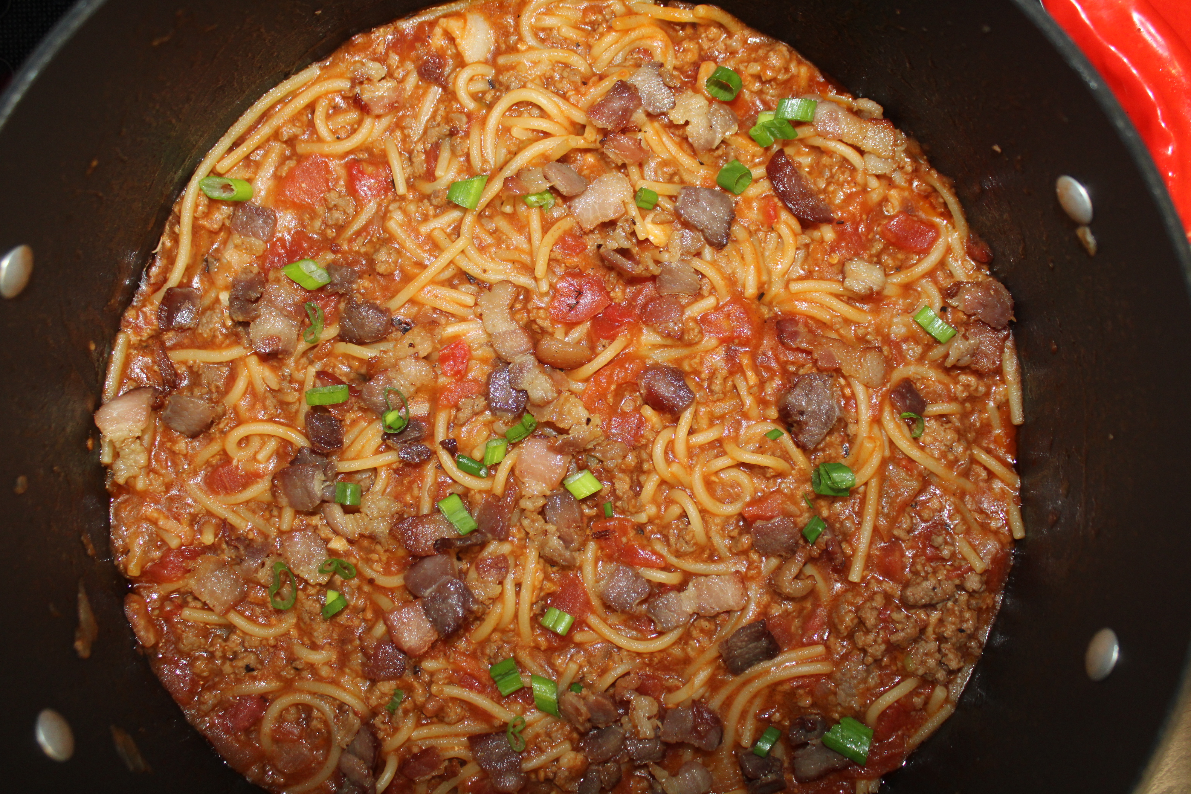 Break spaghetti noodles in half. Scatter over ground beef, making sure noodles are separated. Pour tomatoes with green chilies, fire-roasted tomatoes, and tomato sauce over noodles. Cover and cook for about 20 minutes or so, until the pasta is tender.