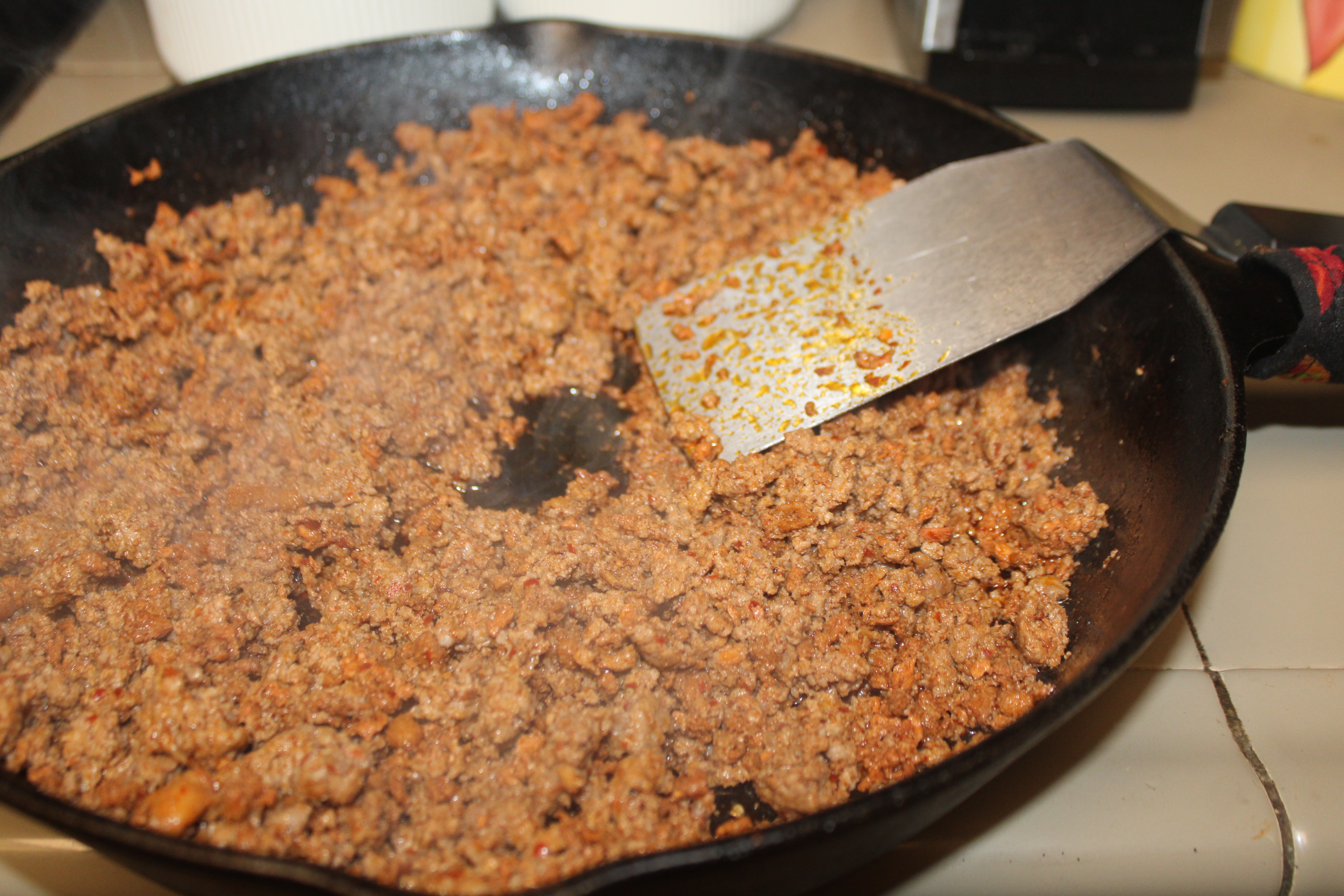 Note: Why season before draining the meat? A good quality Chorizo isn’t going to turn into an orange mess in the skillet. The little bit of grease contains immense flavors that the dry taco seasoning will absorb.