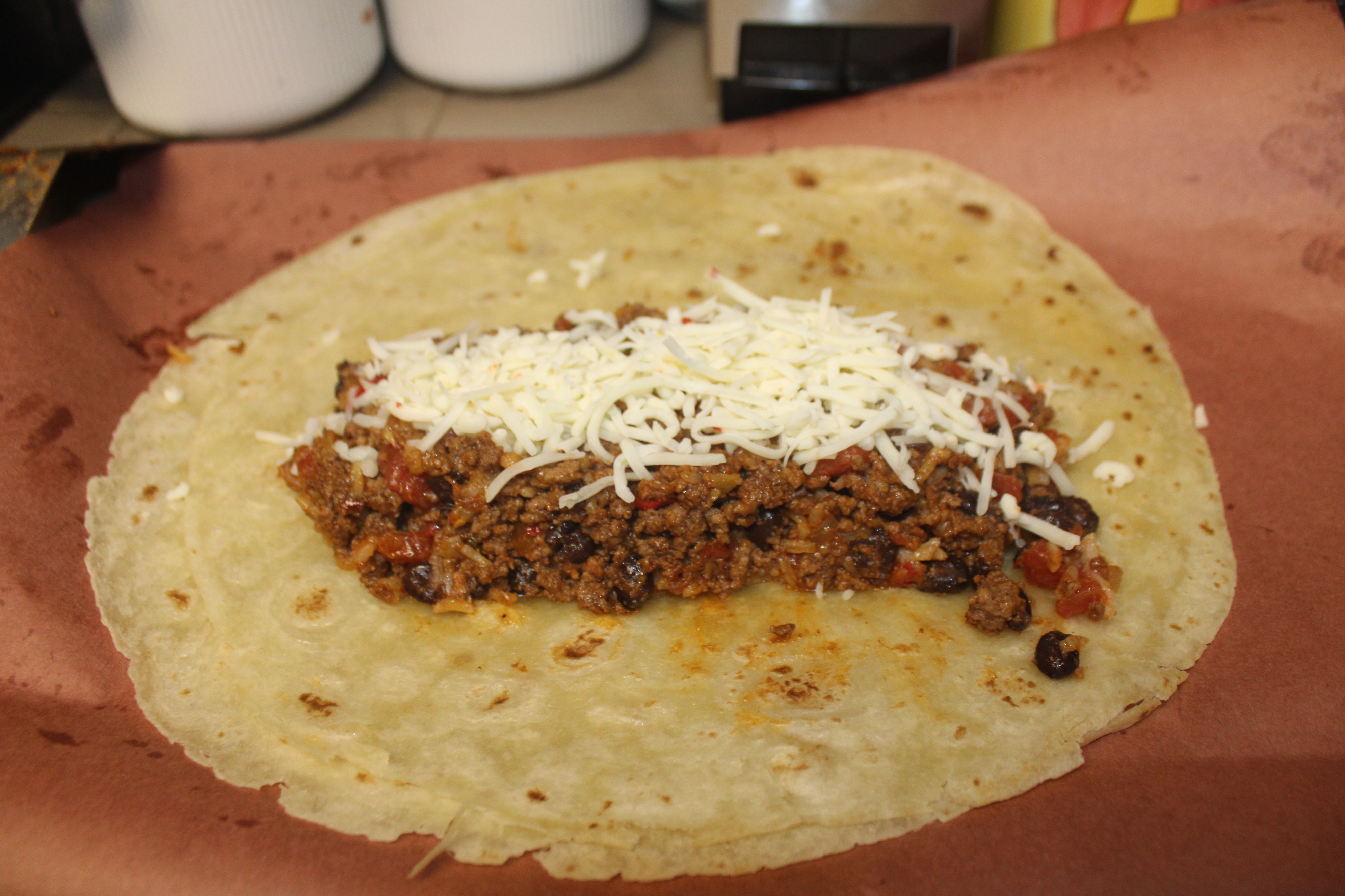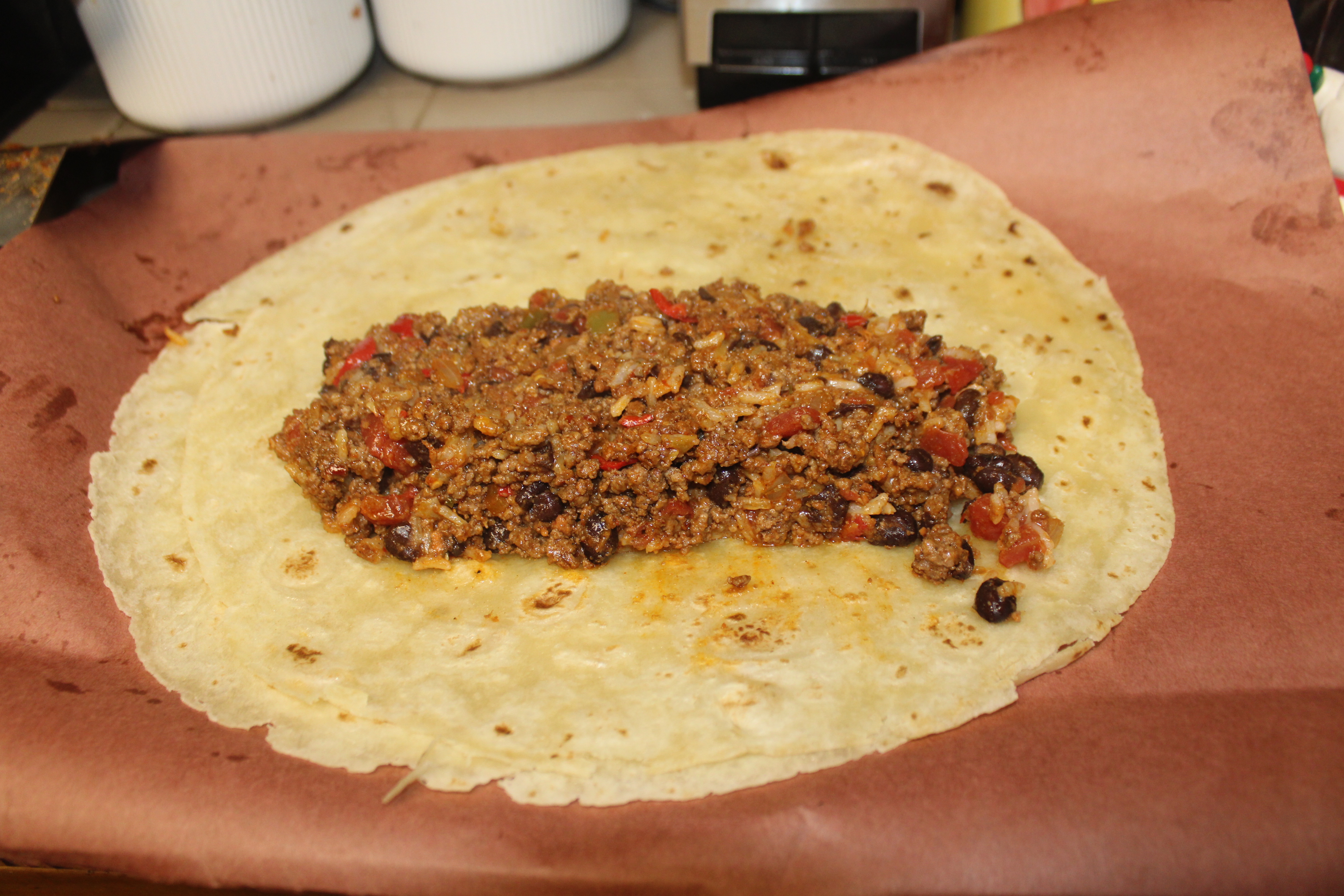 (Note the size of my tortilla compared to a “normal” tortilla. If you like, use 6 of the small tortillas).