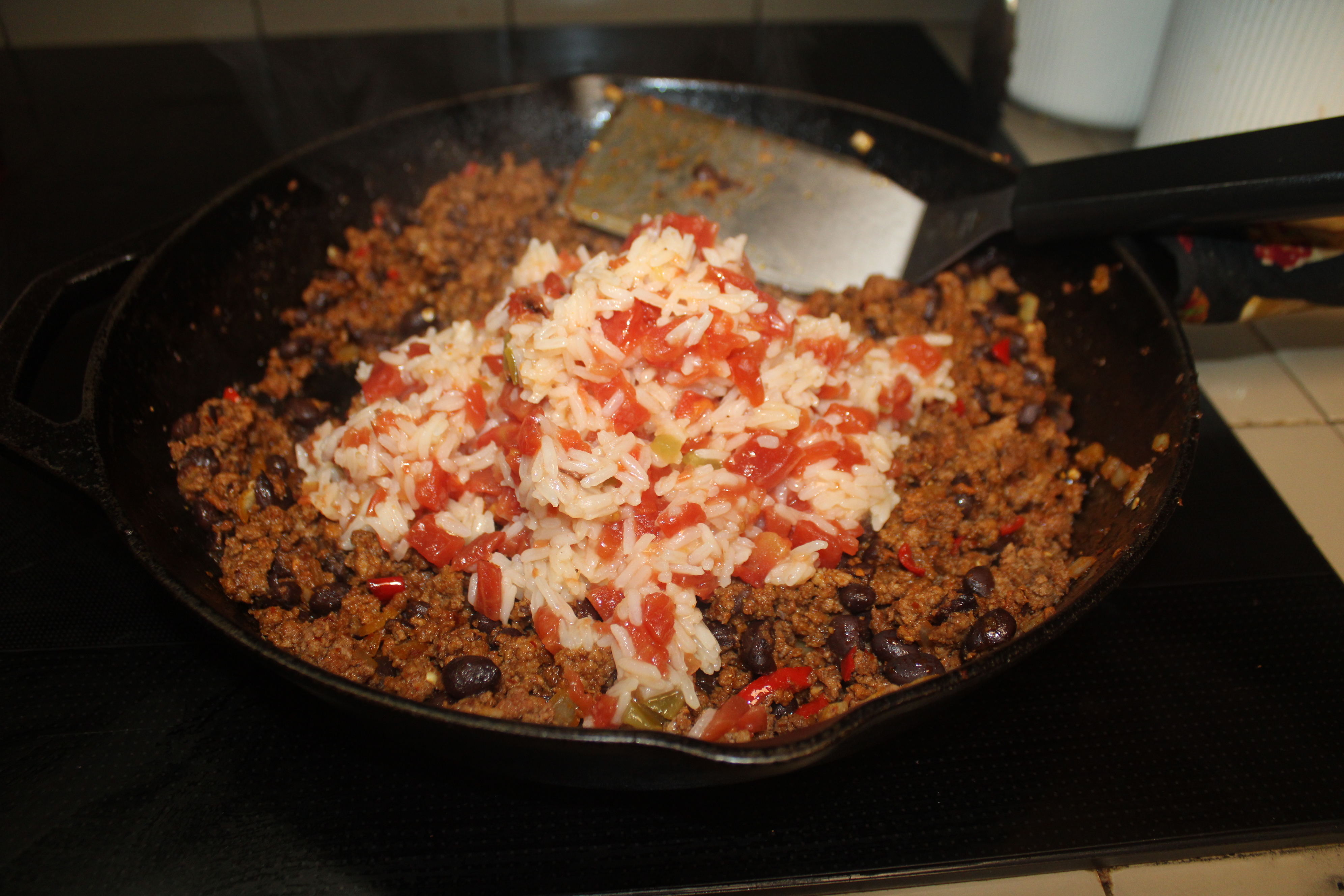 Mix in peppers, onions and black beans. Add rice, stir to blend all the fillings and flavors together.