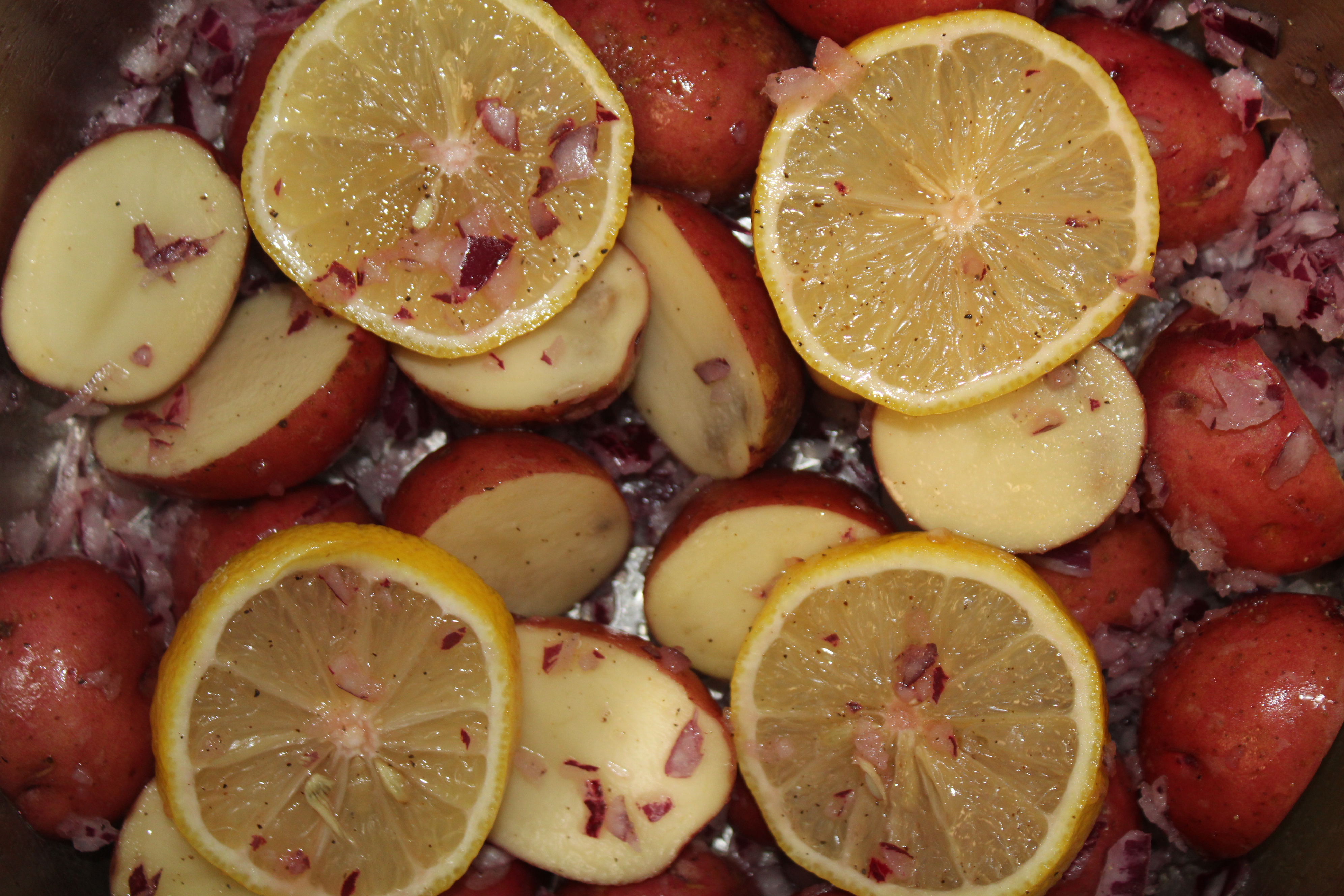 In a slow-cooker, toss onion, potatoes, and lemon slices together with olive oil. Spread into an even layer.