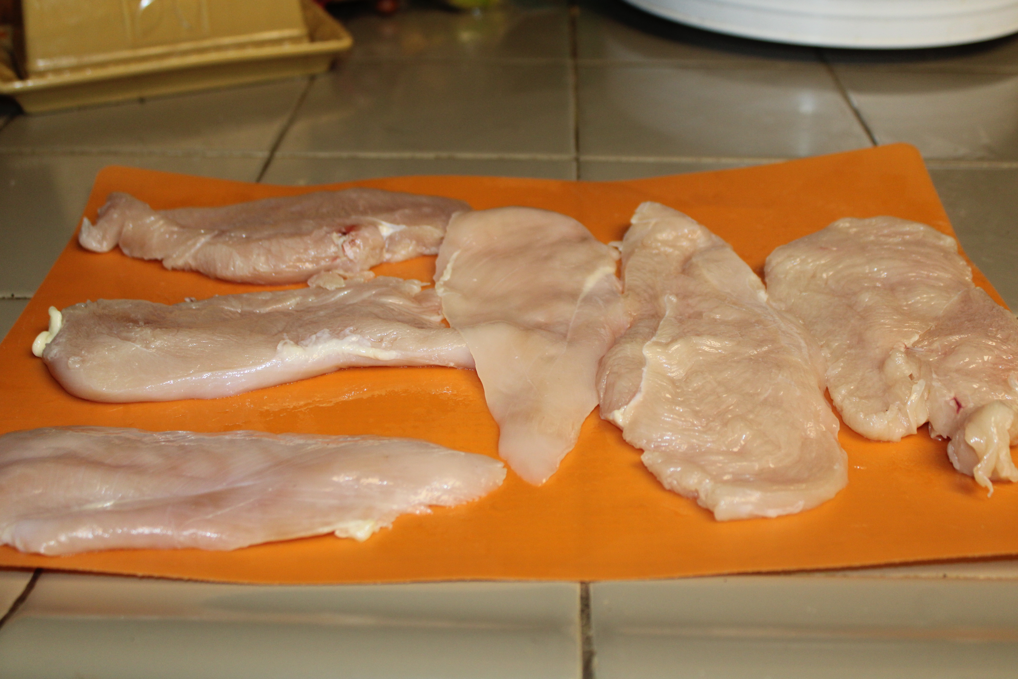 Note: Breasts that are partially frozen will be easier to split into 3 thin breasts. Be sure to use a thin, sharp filet knife for best results.