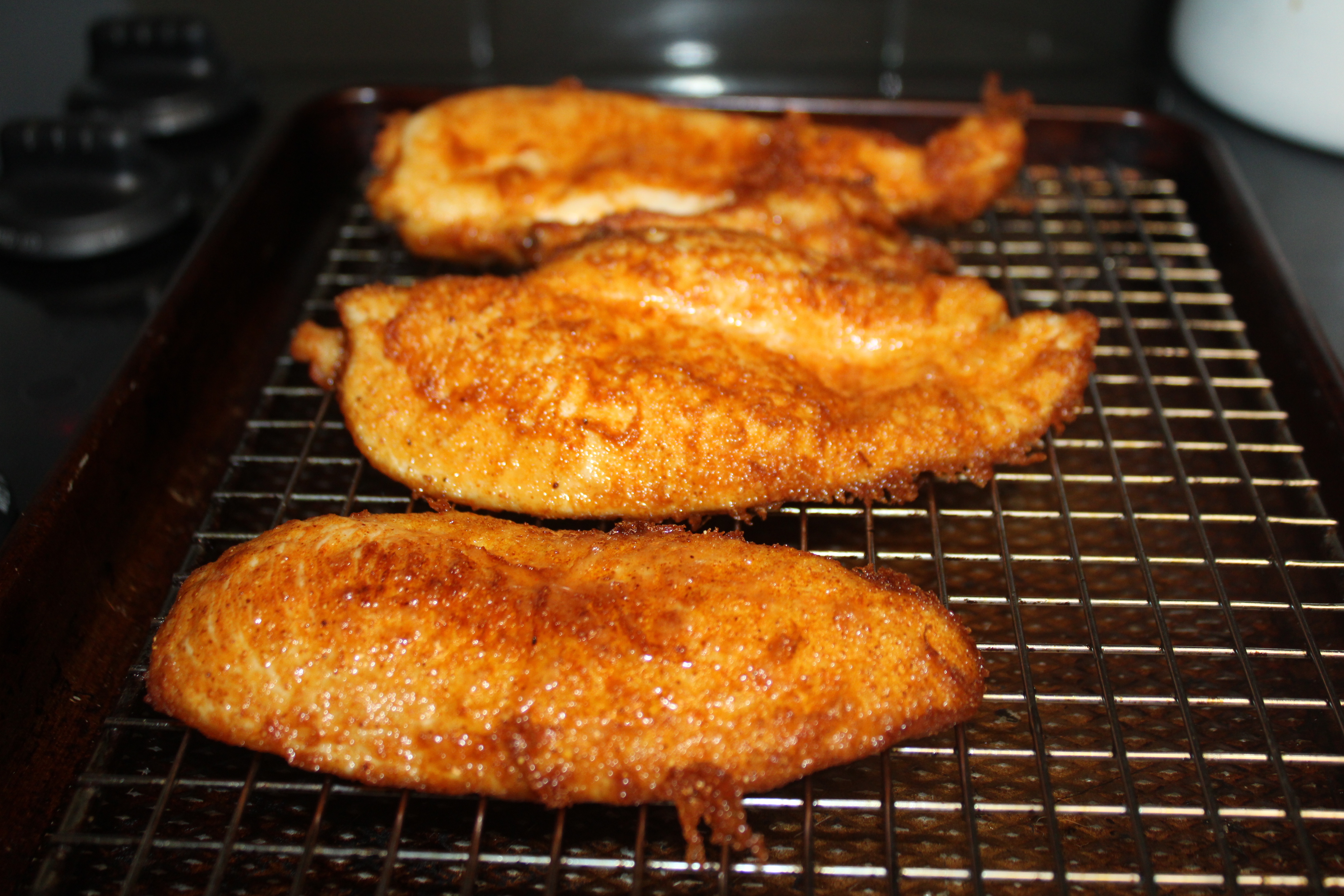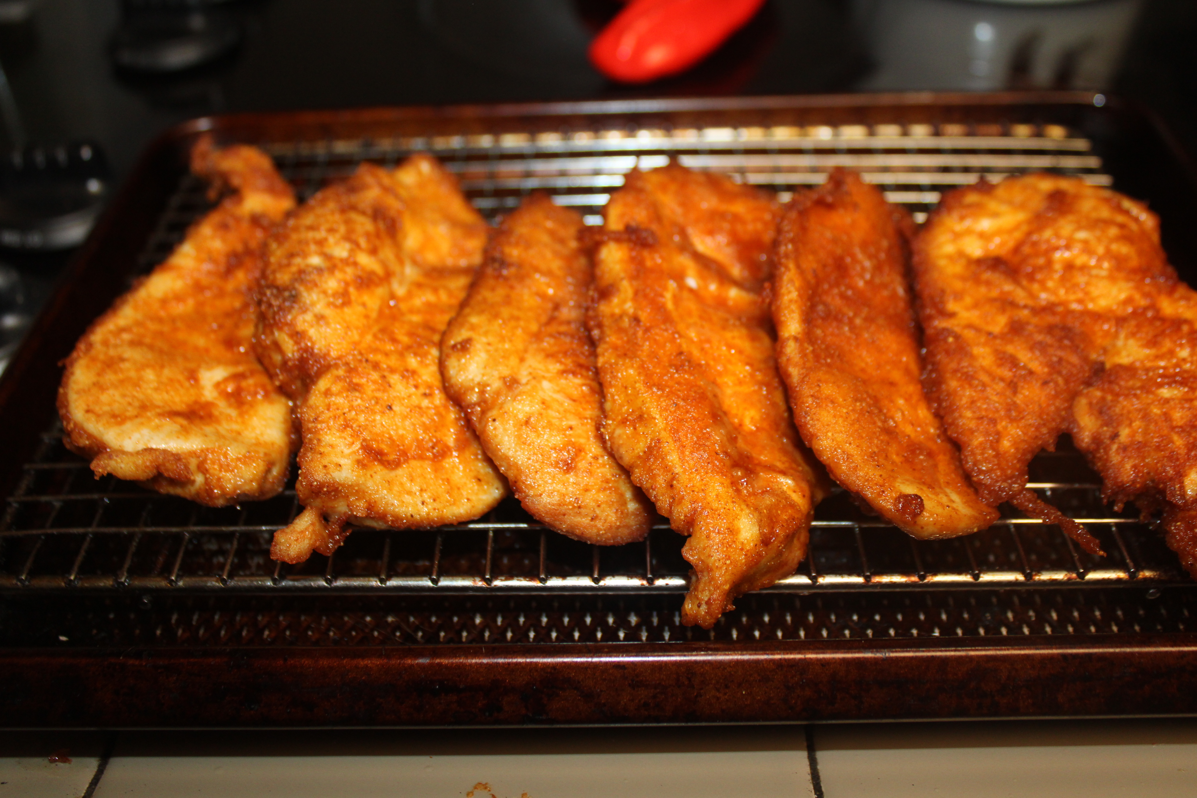 Heat oil in a deep skillet to 350-degrees. While the oil is heating, dip chicken into the batter, allowing excess to drip back into the dish. Let rest on a wire rack.