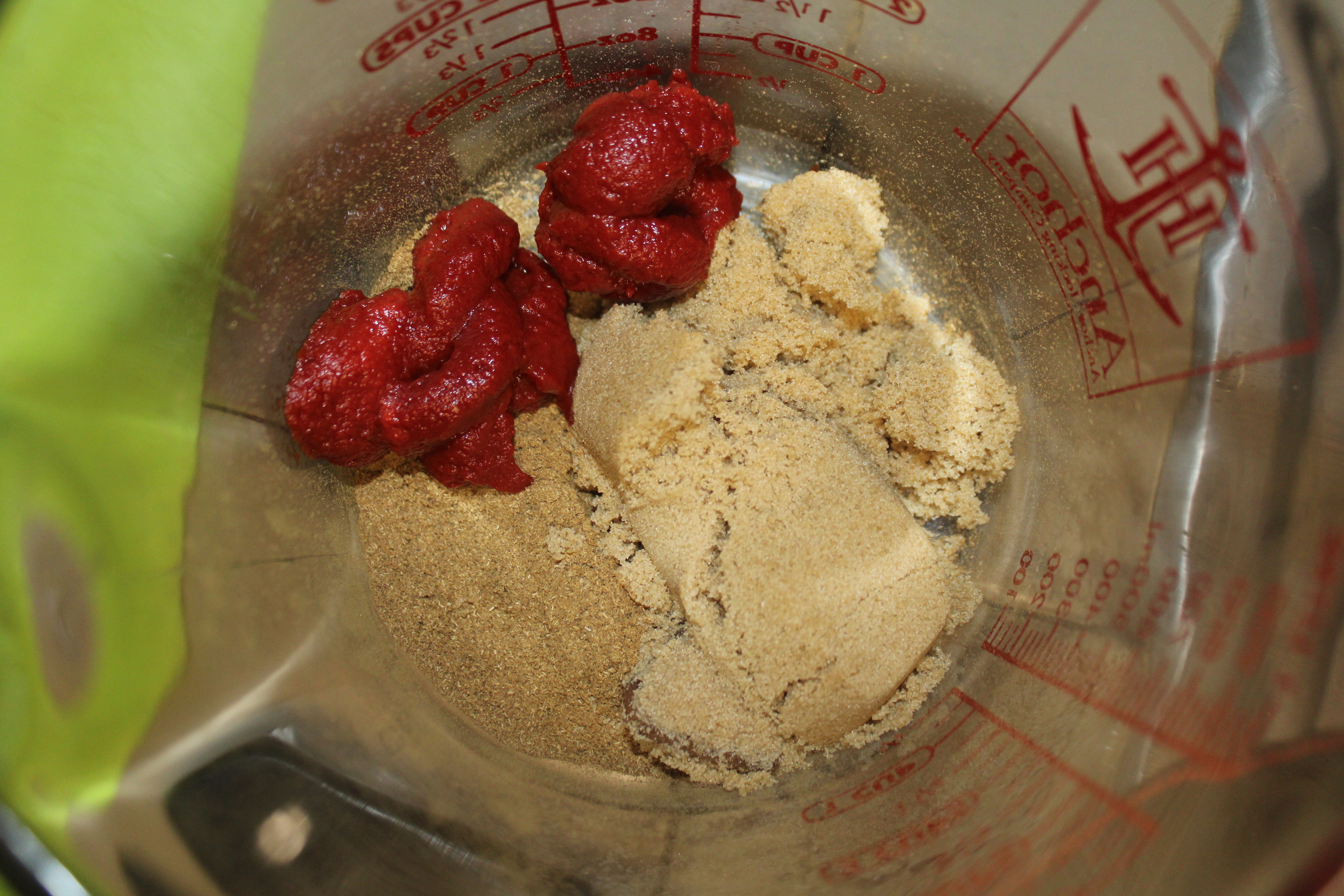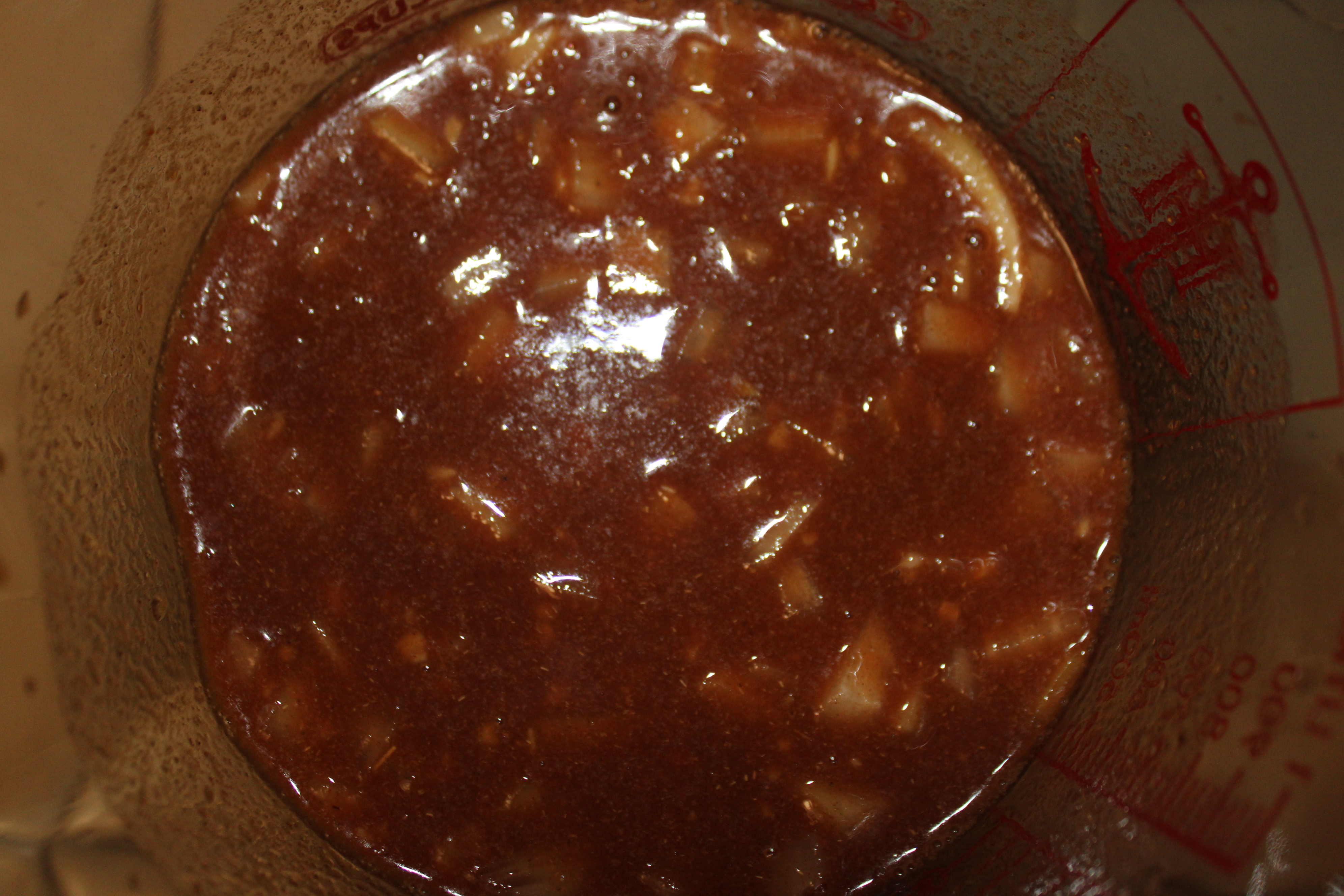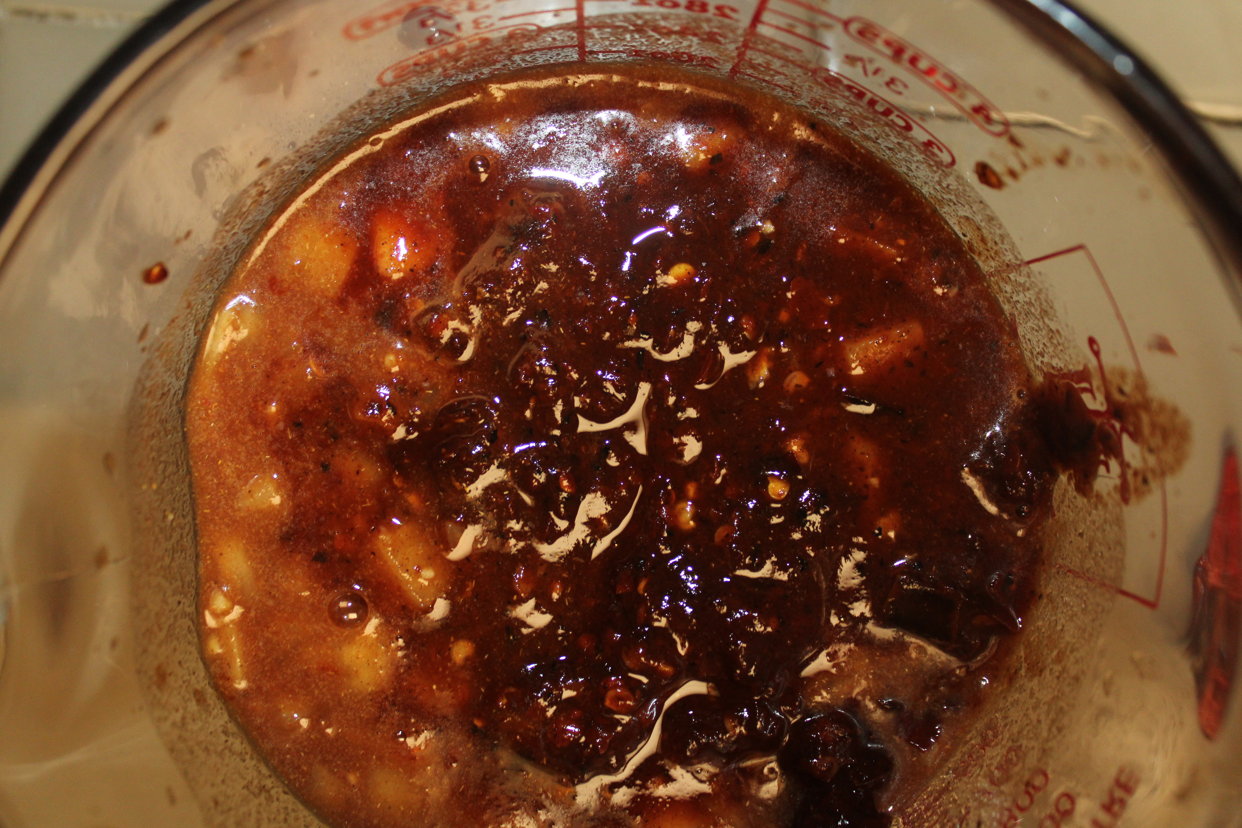In a 4-cup glass measuring cup combine Cumin, Brown Sugar and Tomato Paste. In 1-cup measuring cup measure orange juice, add to the sugar mixture. The measure chicken stock, add to the large cup. Whisk to combine. Add onions, garlic and Chili Paste. Whisk well.