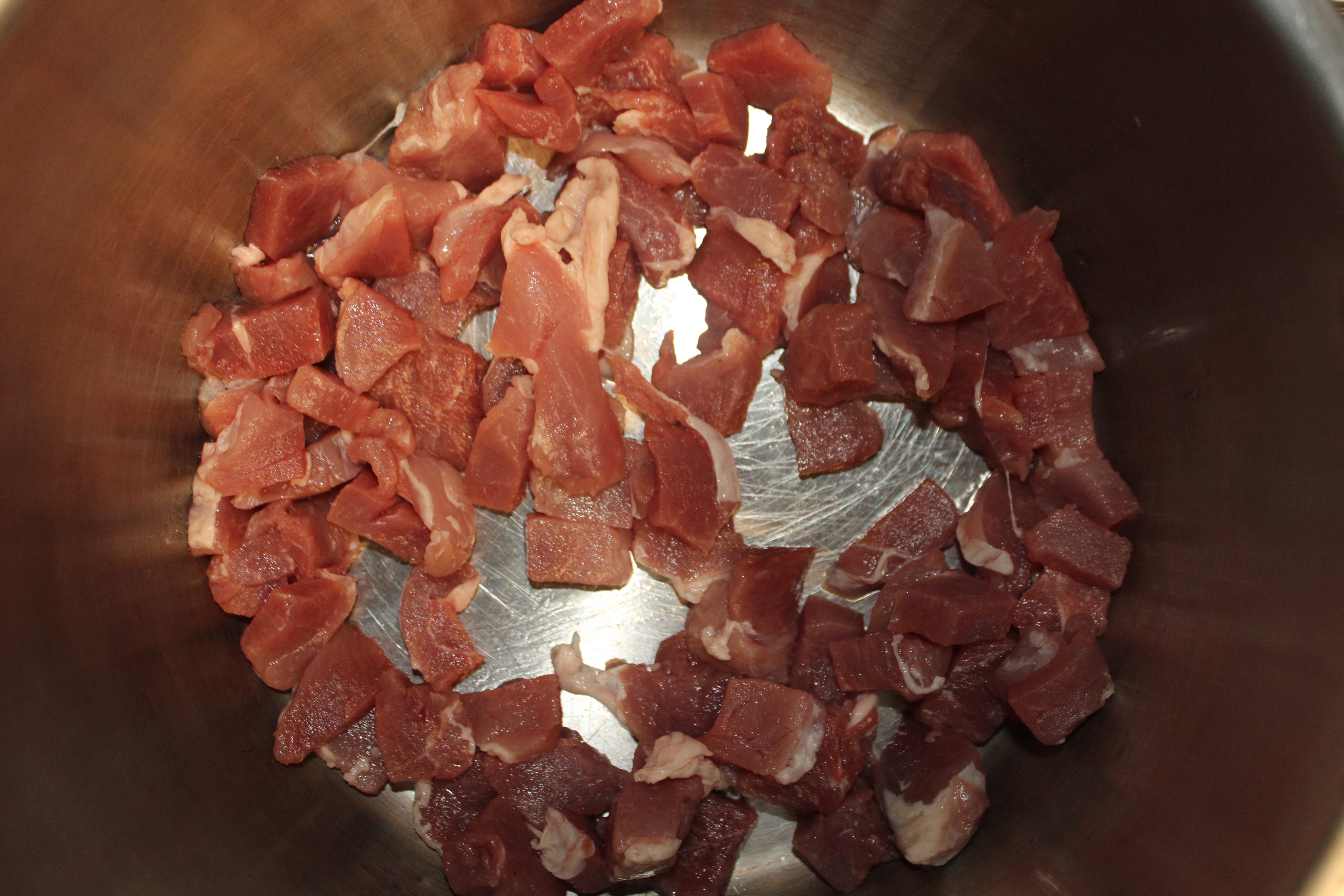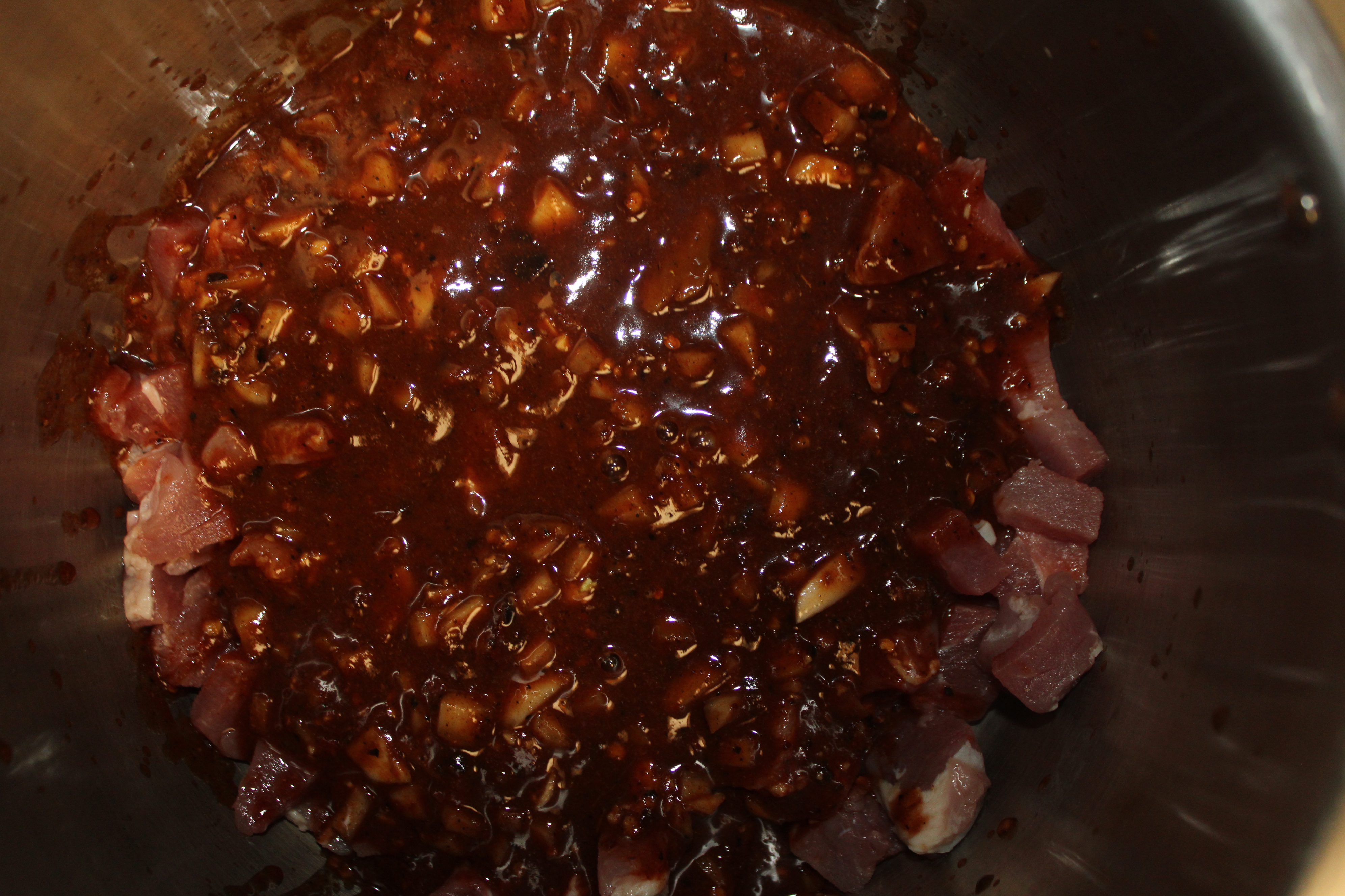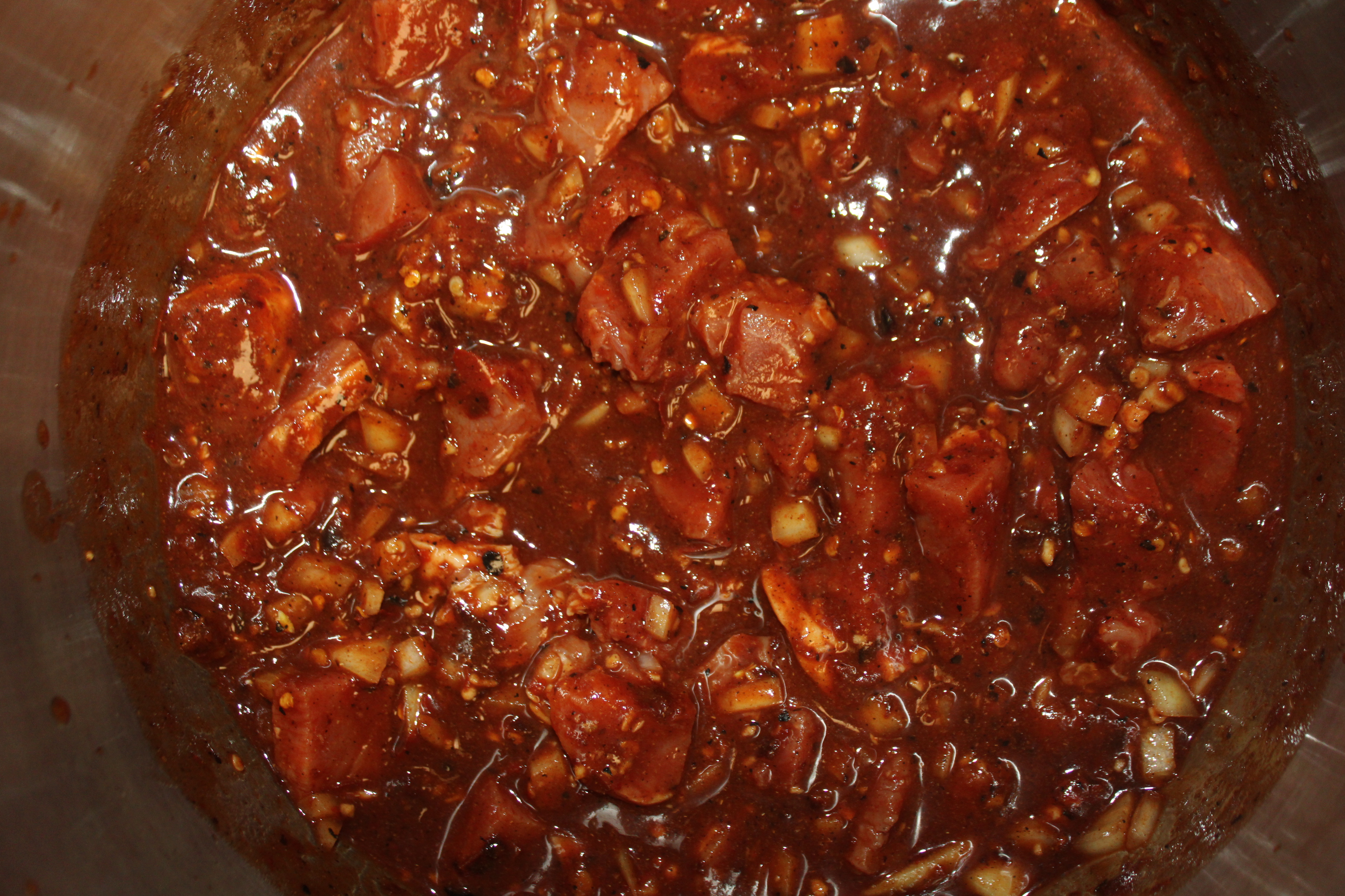 Place diced pork in the insert of your slow-cooker. Pour spicy liquid mixture over the meat. Stir to combine. Cover and cook on LOW for approximately 6 hours, until the meat is very tender.