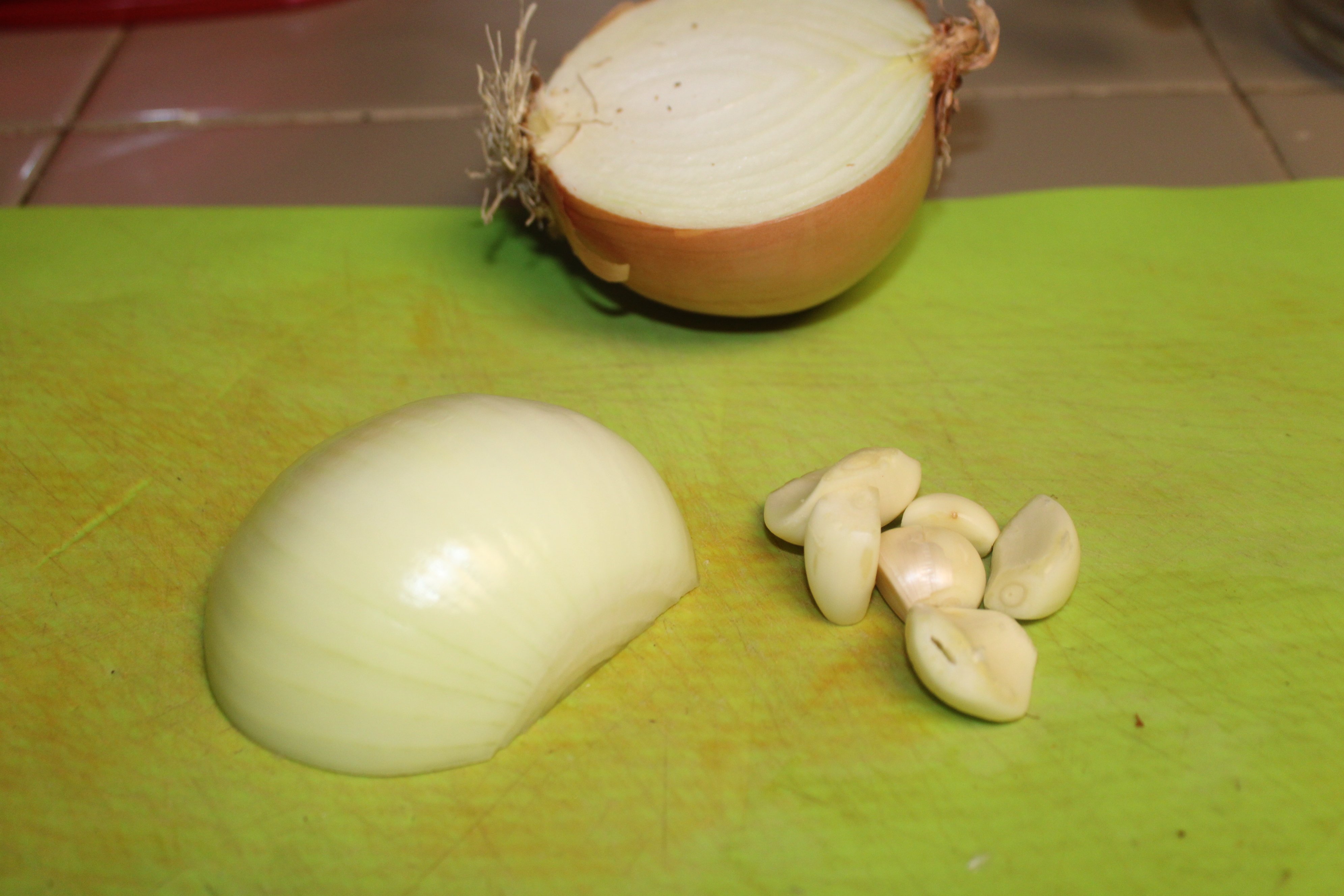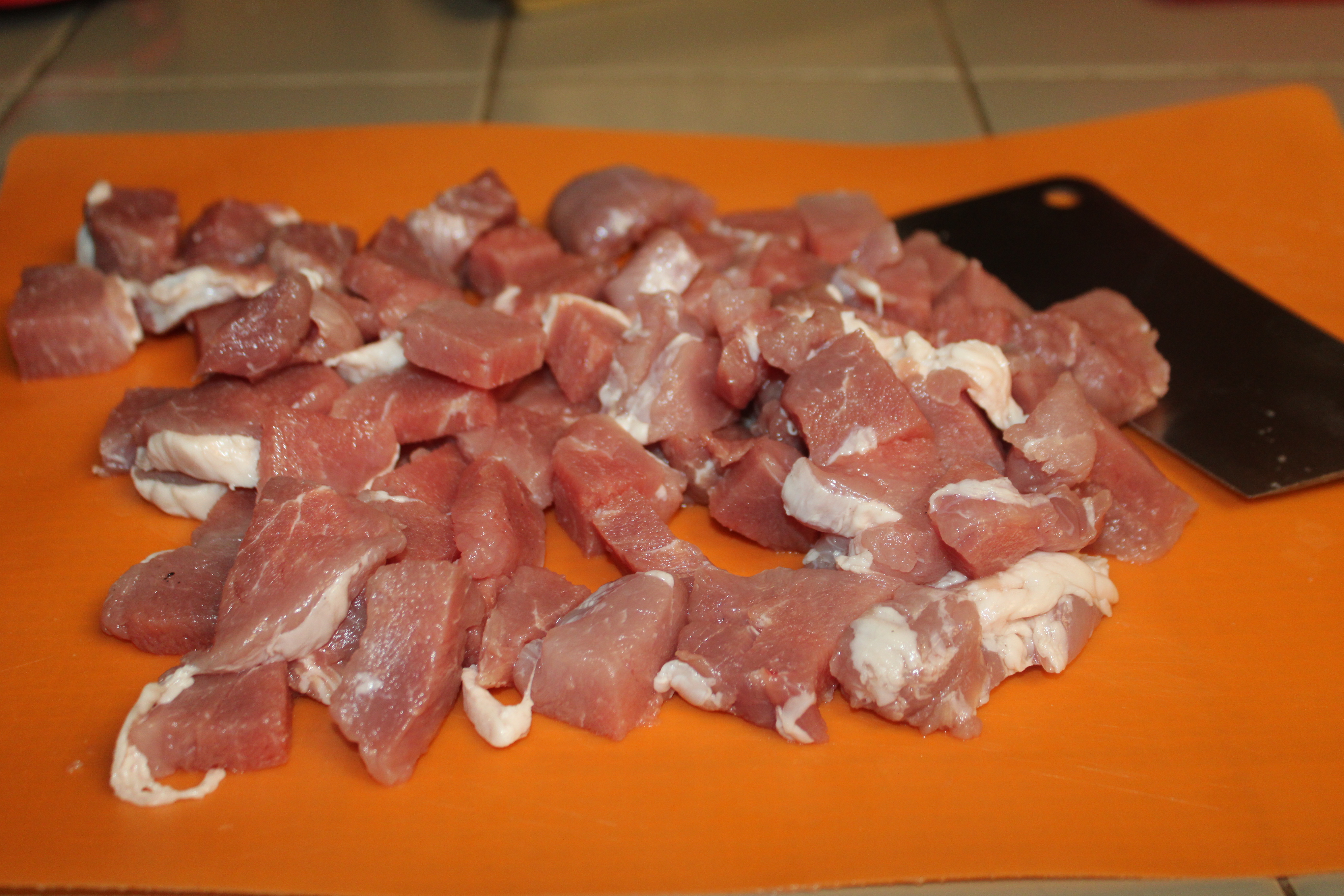 Cut onion in half from root to tip. Reserve half for another purpose, dice remaining half. Peel and mince garlic. Cut pork into bite-size pieces.