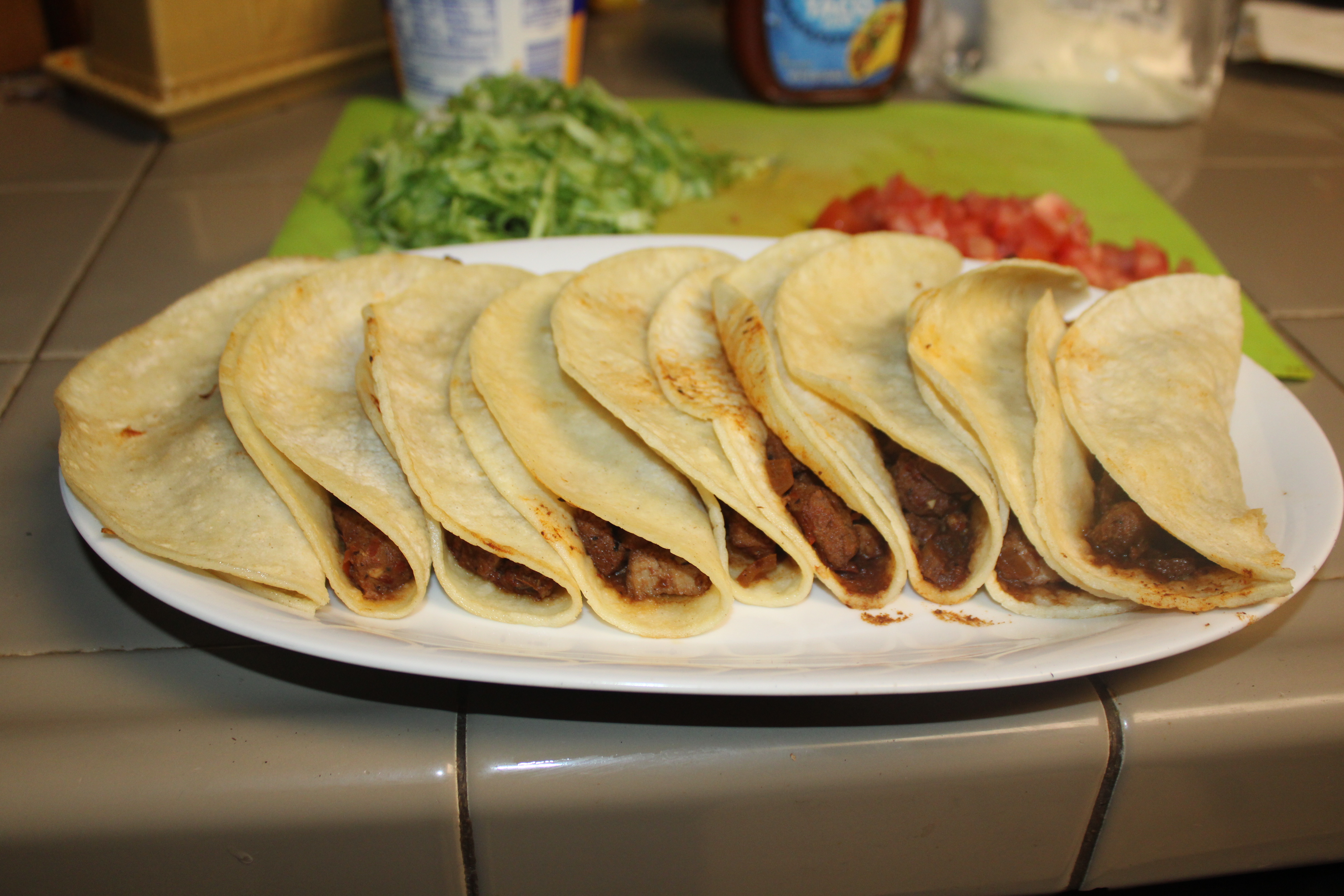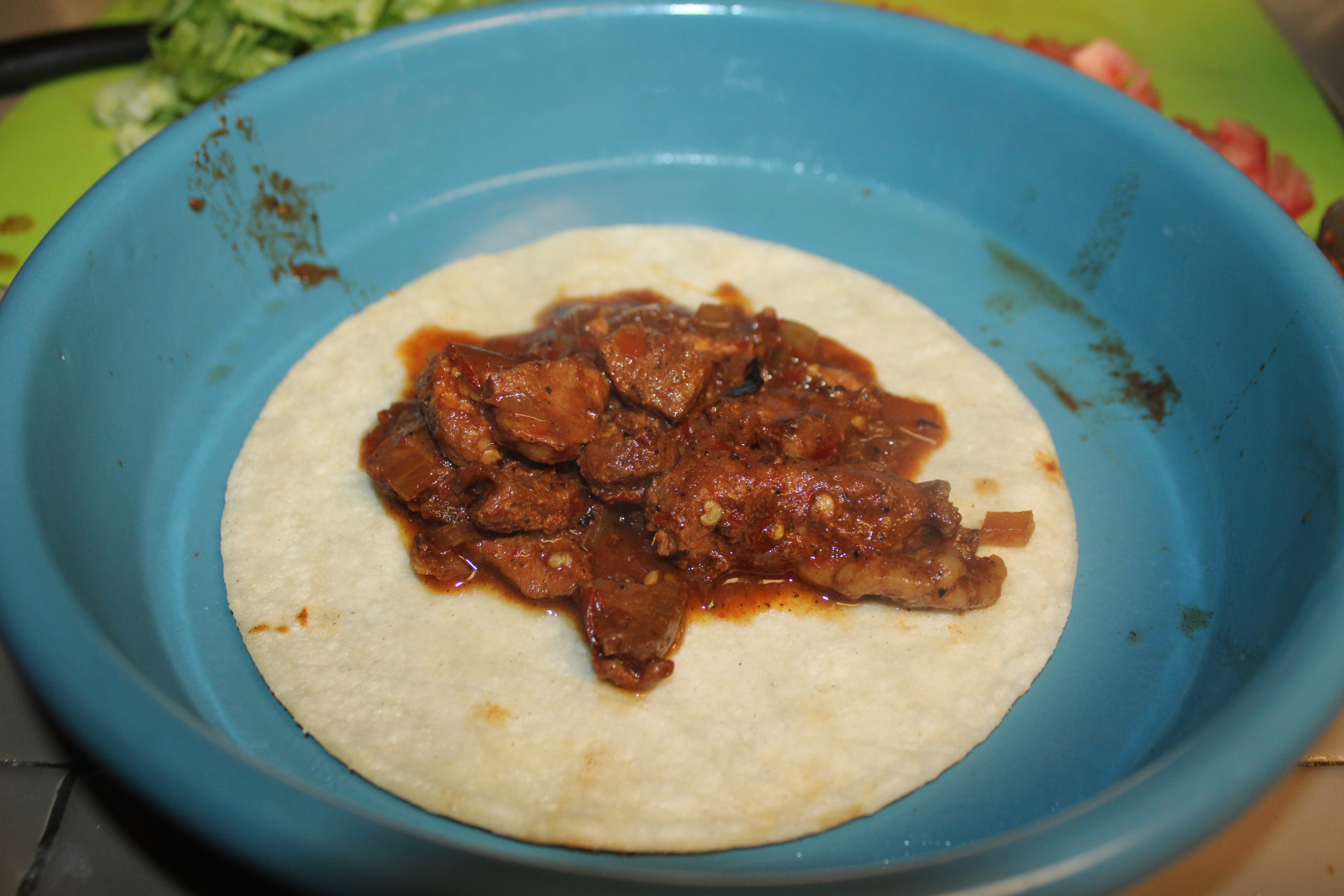 Fill each tortilla with some of the pork mixture, fold and place on warmed platter. Continue until you have used up all the tortillas. Hold in a warm oven until ready to serve the meal. Pass the shredded lettuce, tomatoes, sour cream and cheese to use as desired to finish the tacos tableside.