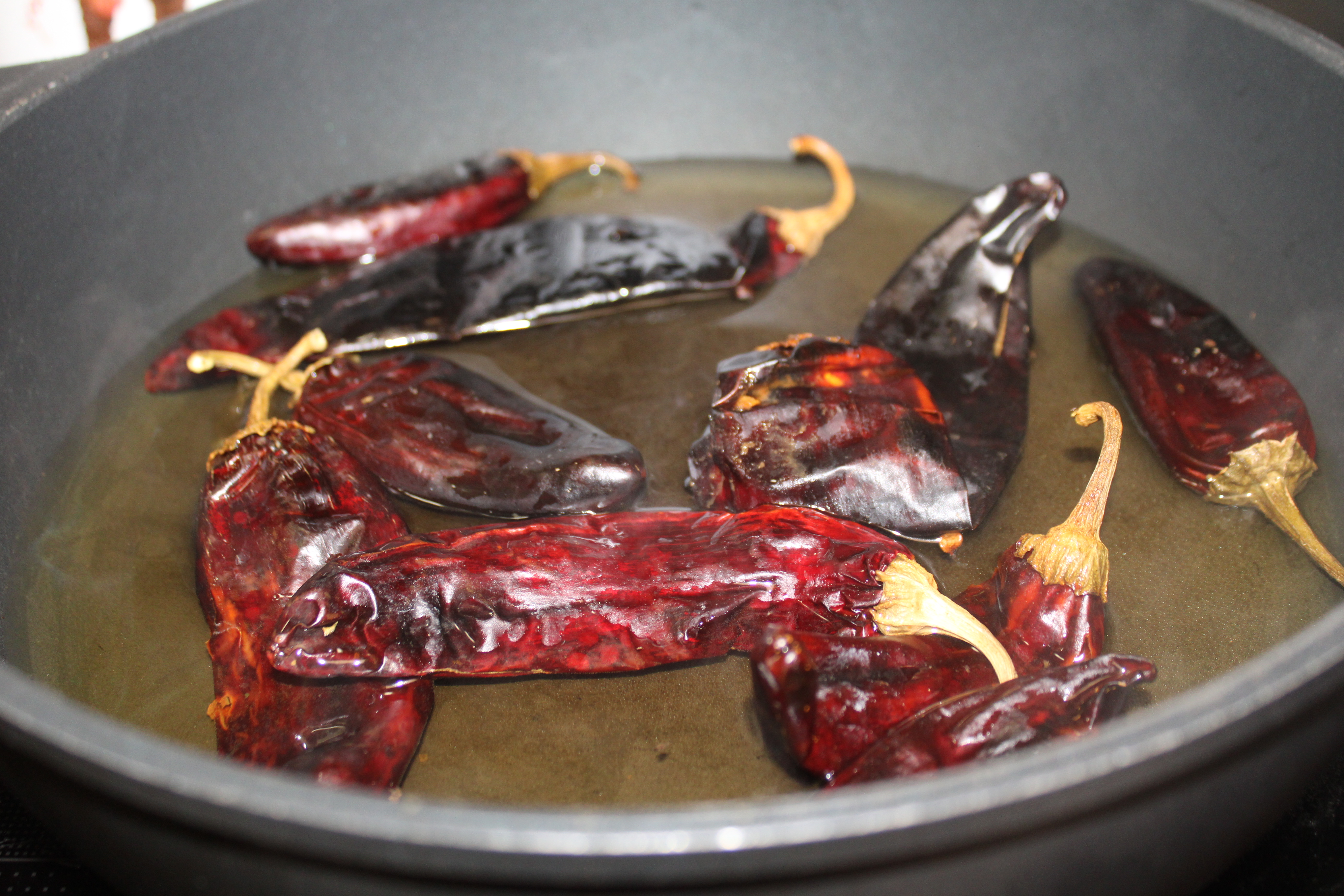 Heat a heavy frying pan or cast-iron skillet over medium-high heat. Add peppers and toast until they blister, turning often. Transfer toasted Chile peppers to a medium saucepan and add water and vinegar. Bring just to boil, reduce heat and let simmer, covered, for 20 minutes. Remove peppers with a slotted spoon and then strain the liquid. Set peppers aside to cool. Set strained liquid aside.