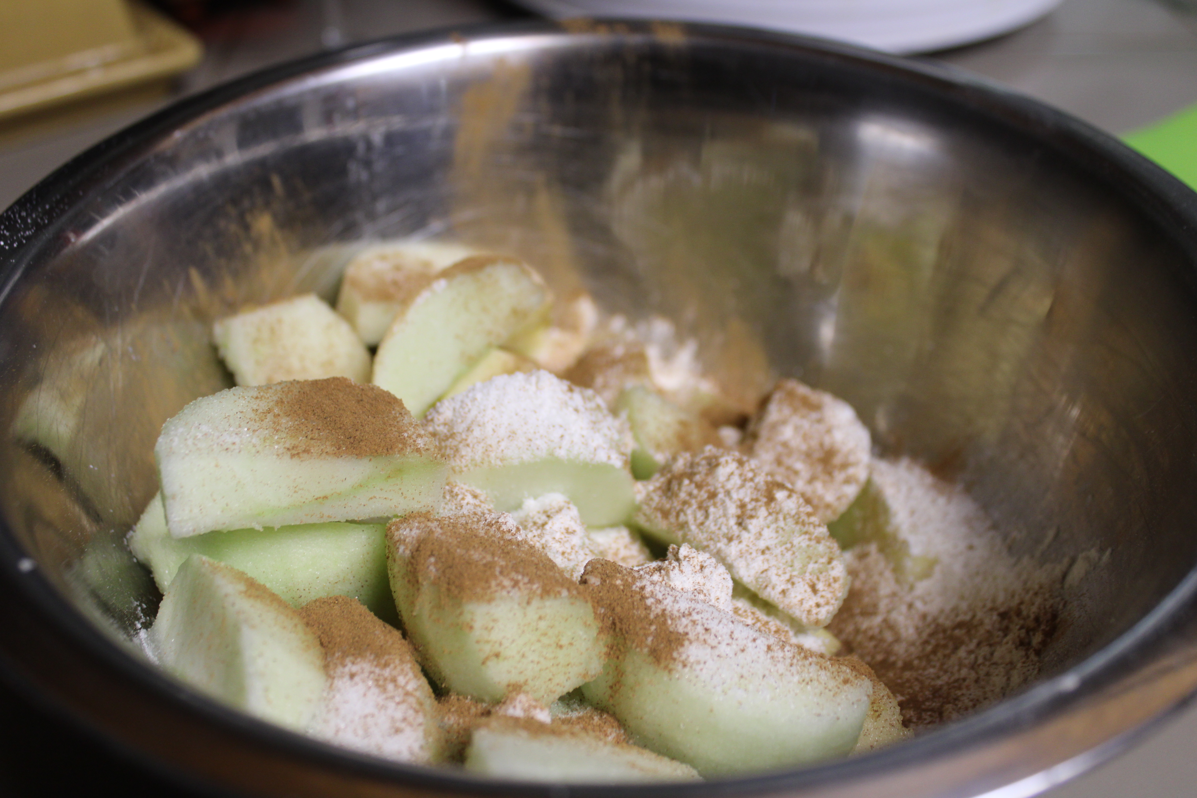 Peel and slice apples as you would for any apple pie filling. Sprinkle with sugar and cinnamon; toss with flour. Set apple filling aside.