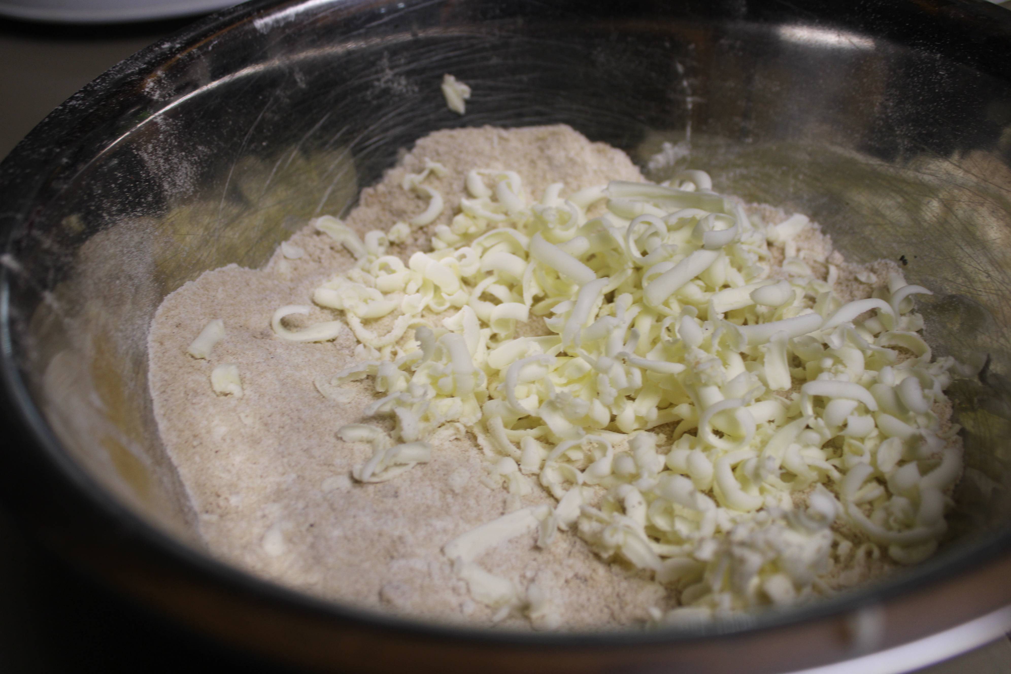 Combine brown sugar, flour and cinnamon. With a cheese grater grate the frozen butter, one tablespoon at a time into the brown sugar mixture. Work butter in until the topping is crumbly. Toss in the oats, set aside to make the apple filling.