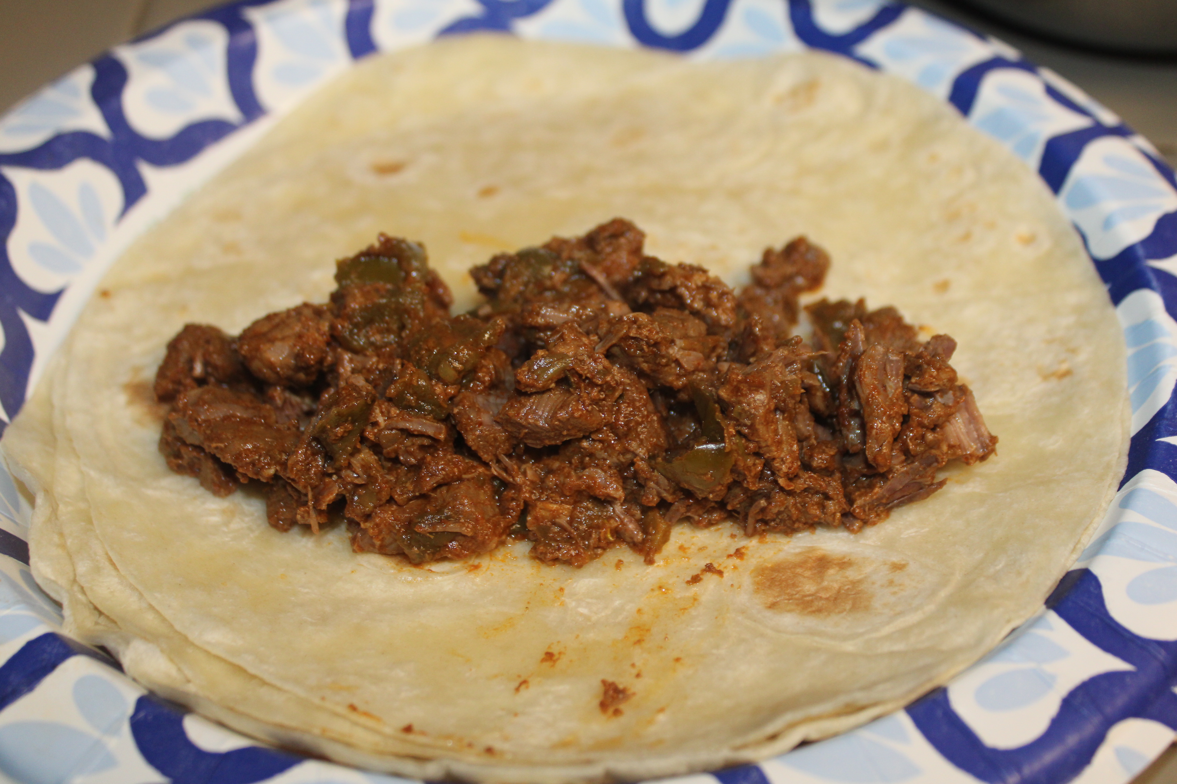 The meat is ready, if it easily breaks apart. Using a slotted spoon to remove the meat. Place in a colander or strainer and allow some of the liquid to drip back into the pot. Place 1/2 cup of meat mixture into the center of one tortilla. Roll up burrito-style and place into a 9-inch by 13-inch baking dish. Repeat with all tortillas.