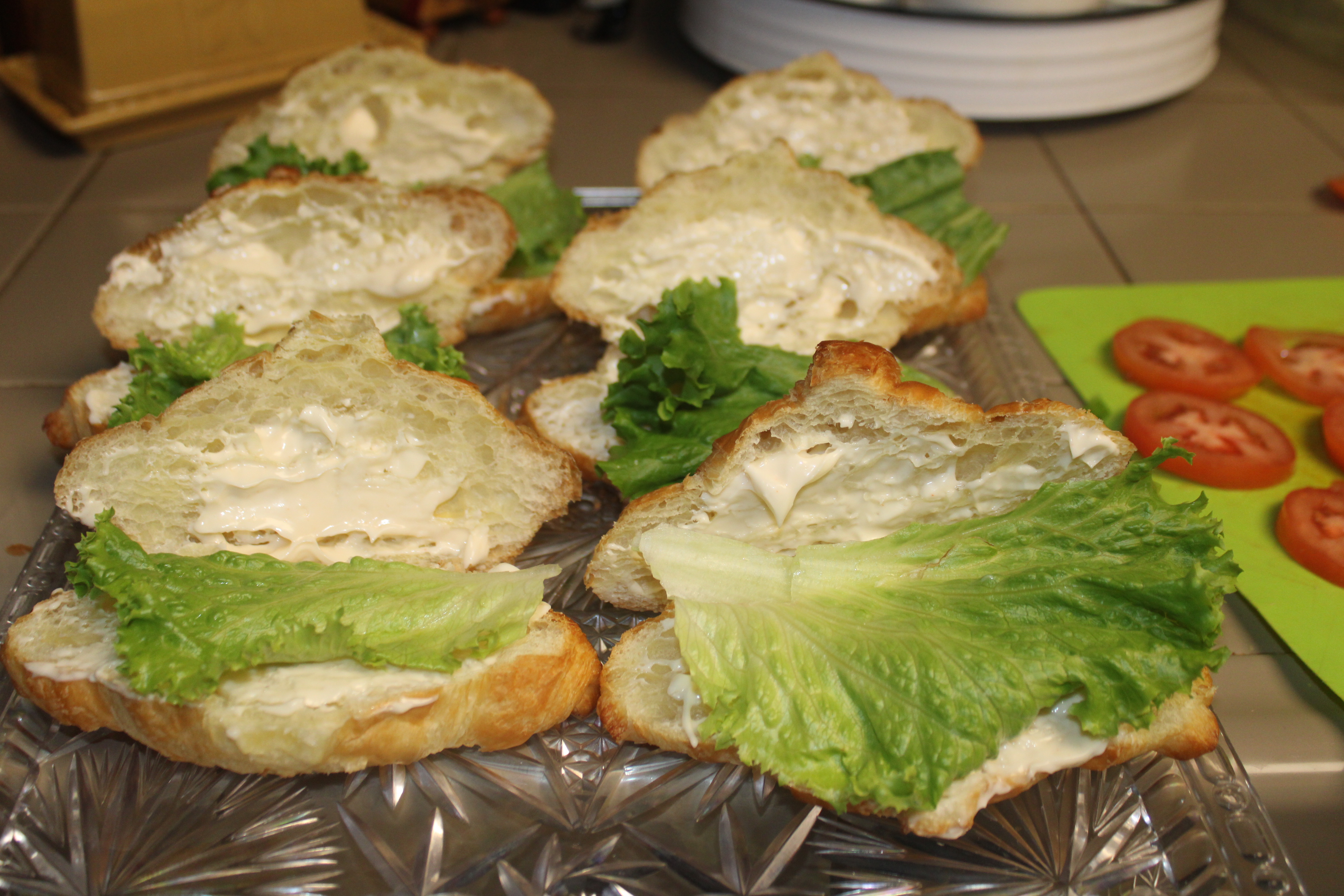 Partly split rolls. Spread some Miracle Whip inside each Croissant. Place lettuce leaves on bottom, top with slices of tomato. Scoop tuna salad and place on top of the tomato slices. Close roll, secure with cocktail picks if necessary and serve.