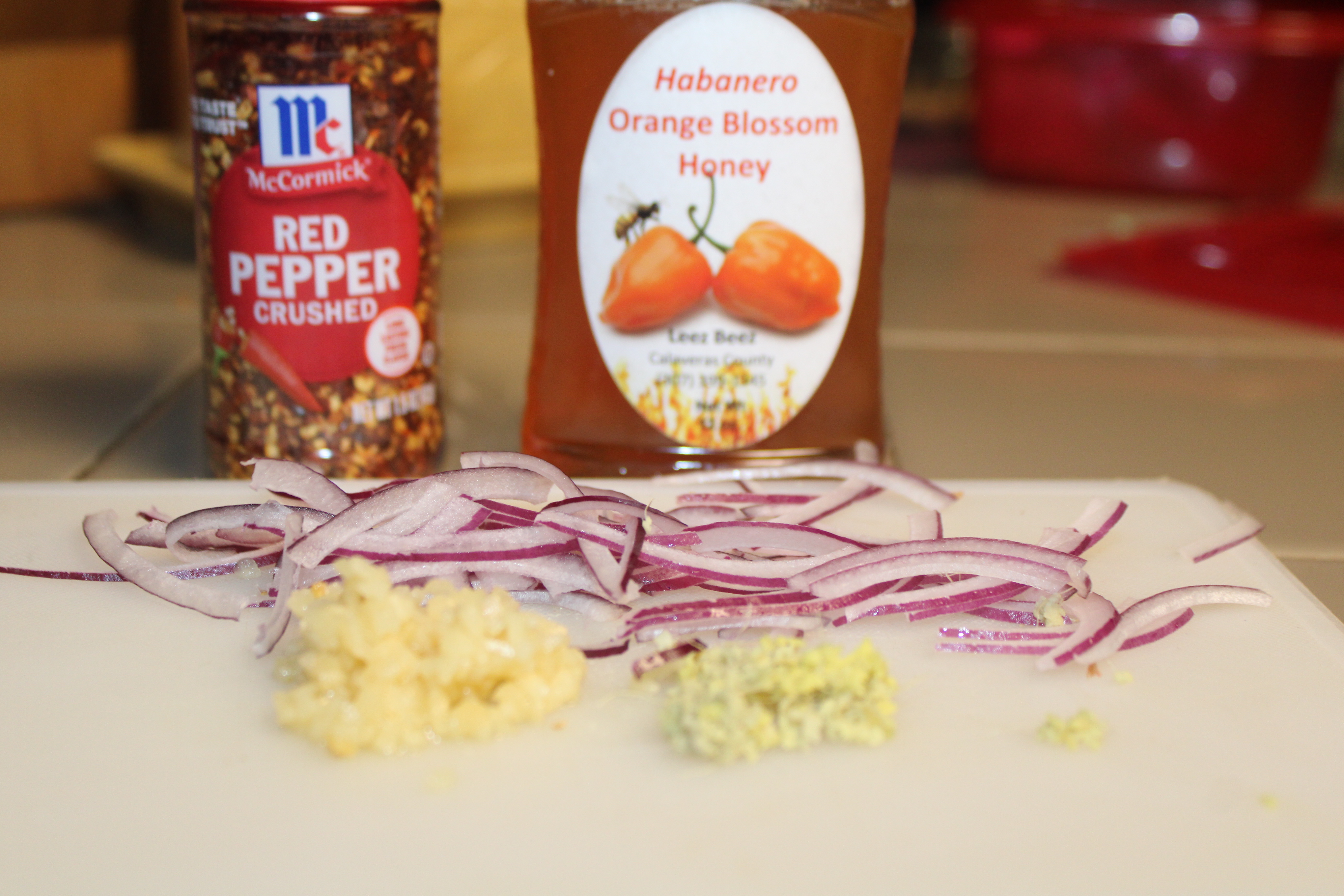 Heat the oil a wok over medium heat. Cook minced garlic and ginger with the red onion for about 30 seconds. Add the shrimp, stir-fry for about 2 minutes per side depending upon the size of the shrimp. Add honey and chili pepper flakes, toss to coat. Remove from heat.