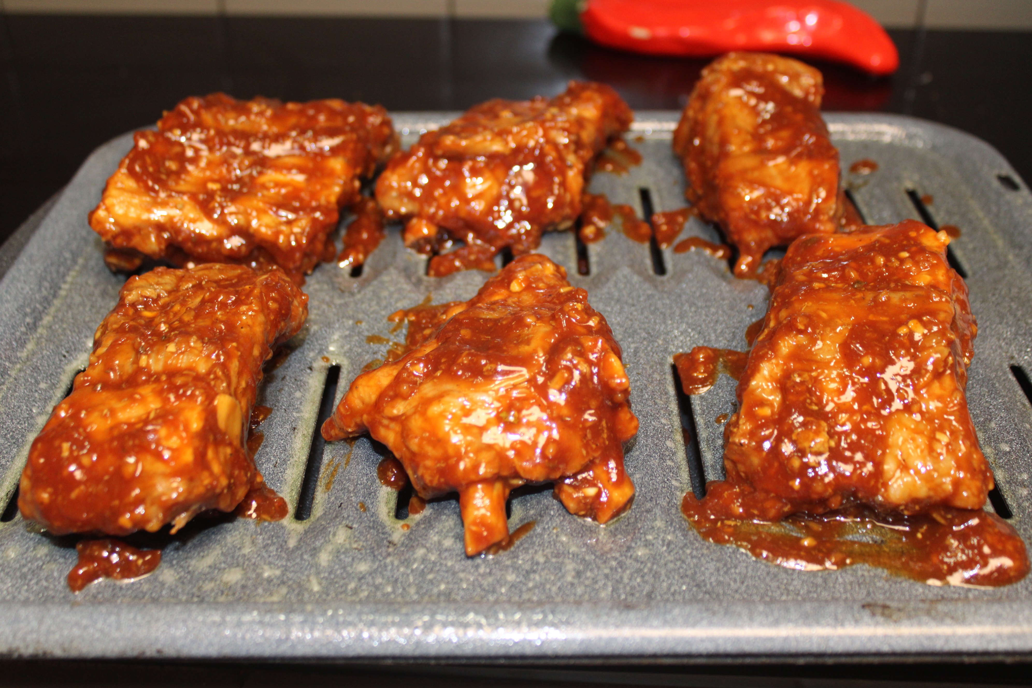 Remove ribs from the boiling pan, lay out on paper towels to absorb most of the water. Place ribs in a zip-lock bag. Pour sauce over the ribs, rub in well. Let the ribs marinate in the refrigerator for about 30 minutes.