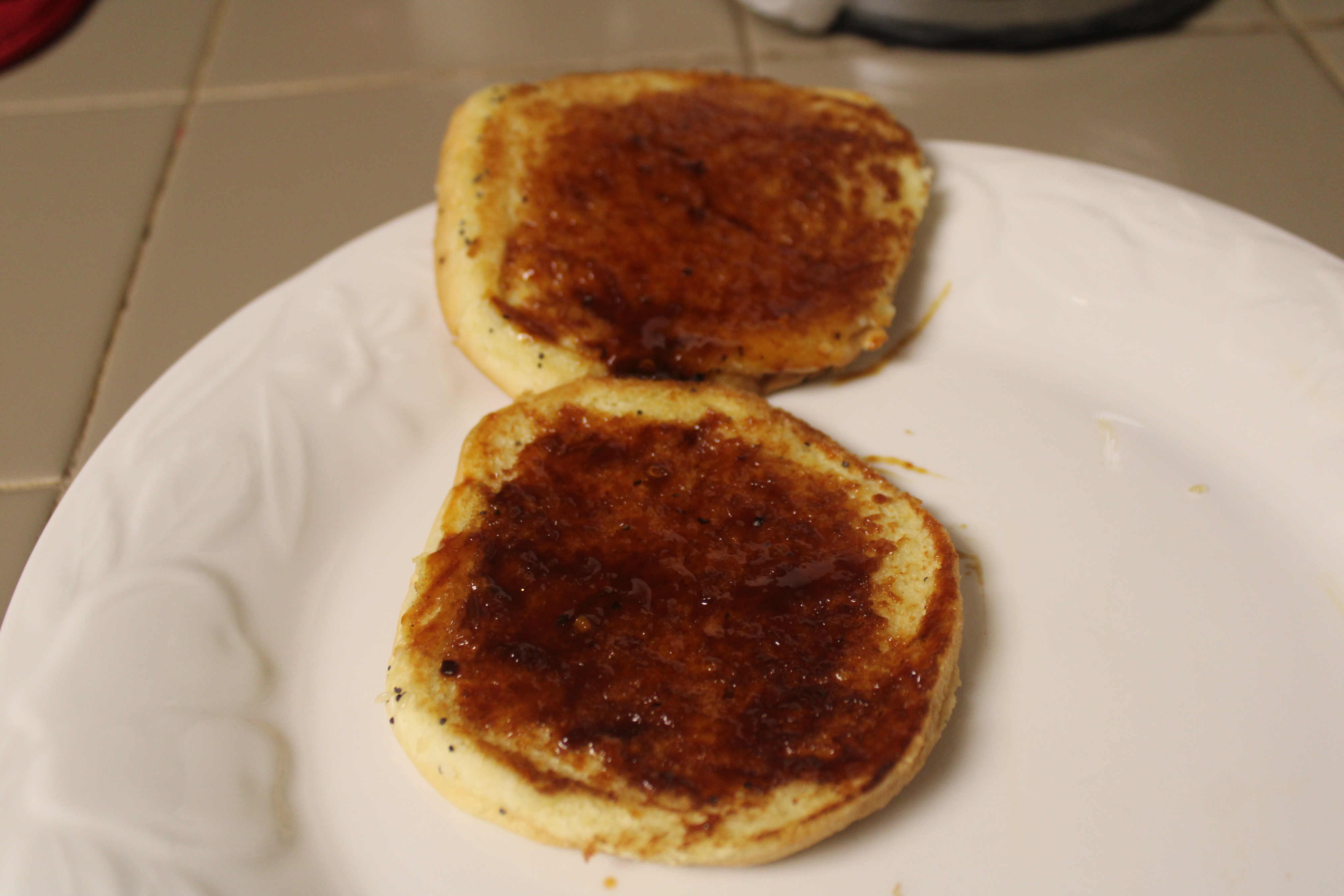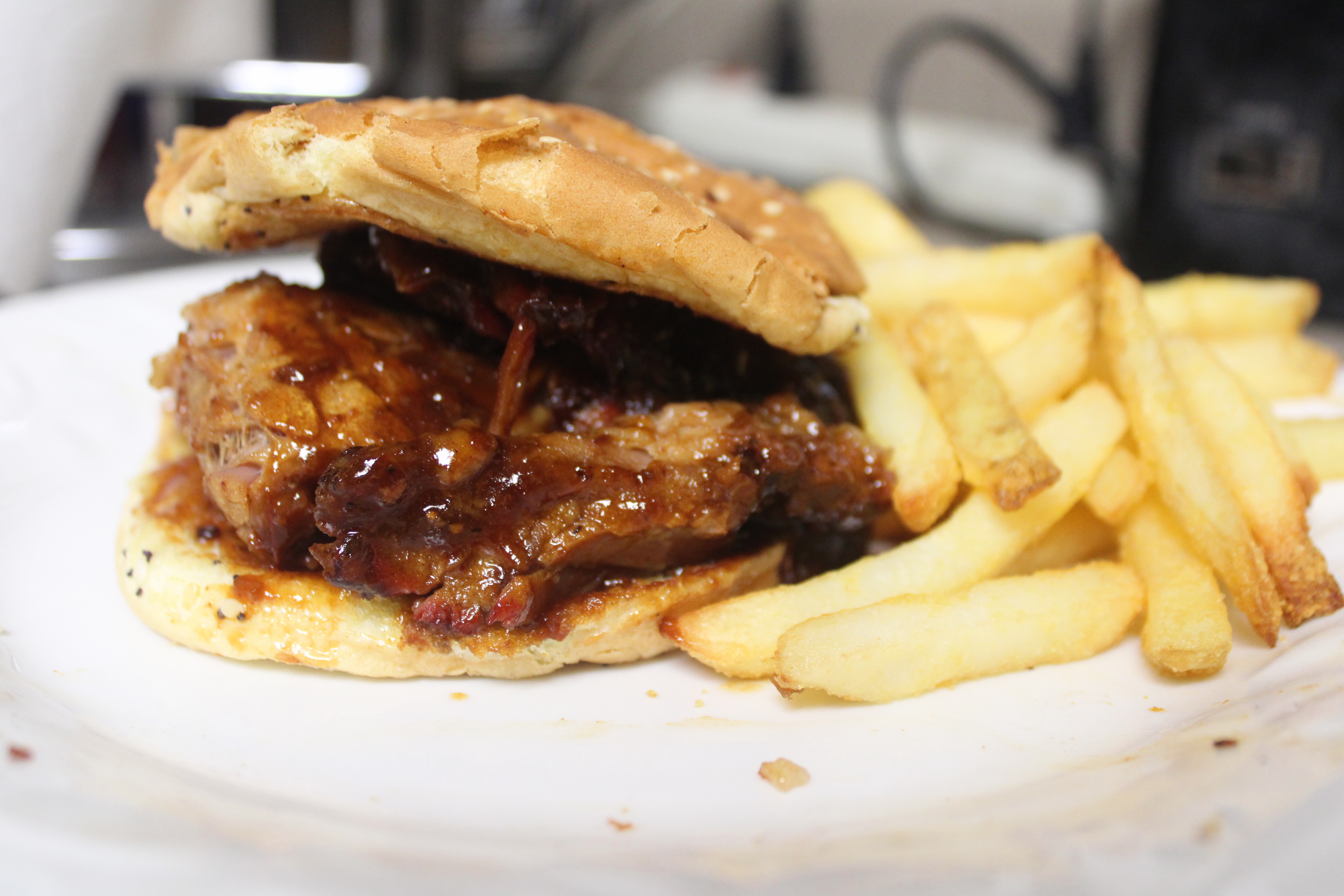 Meanwhile; warm the entire bottle of barbecue sauce in a saucepan over medium heat. While the sauce warms, split buns open, brush with a little butter and lightly toast. Keep the buns and the sauce warm until ready to serve.