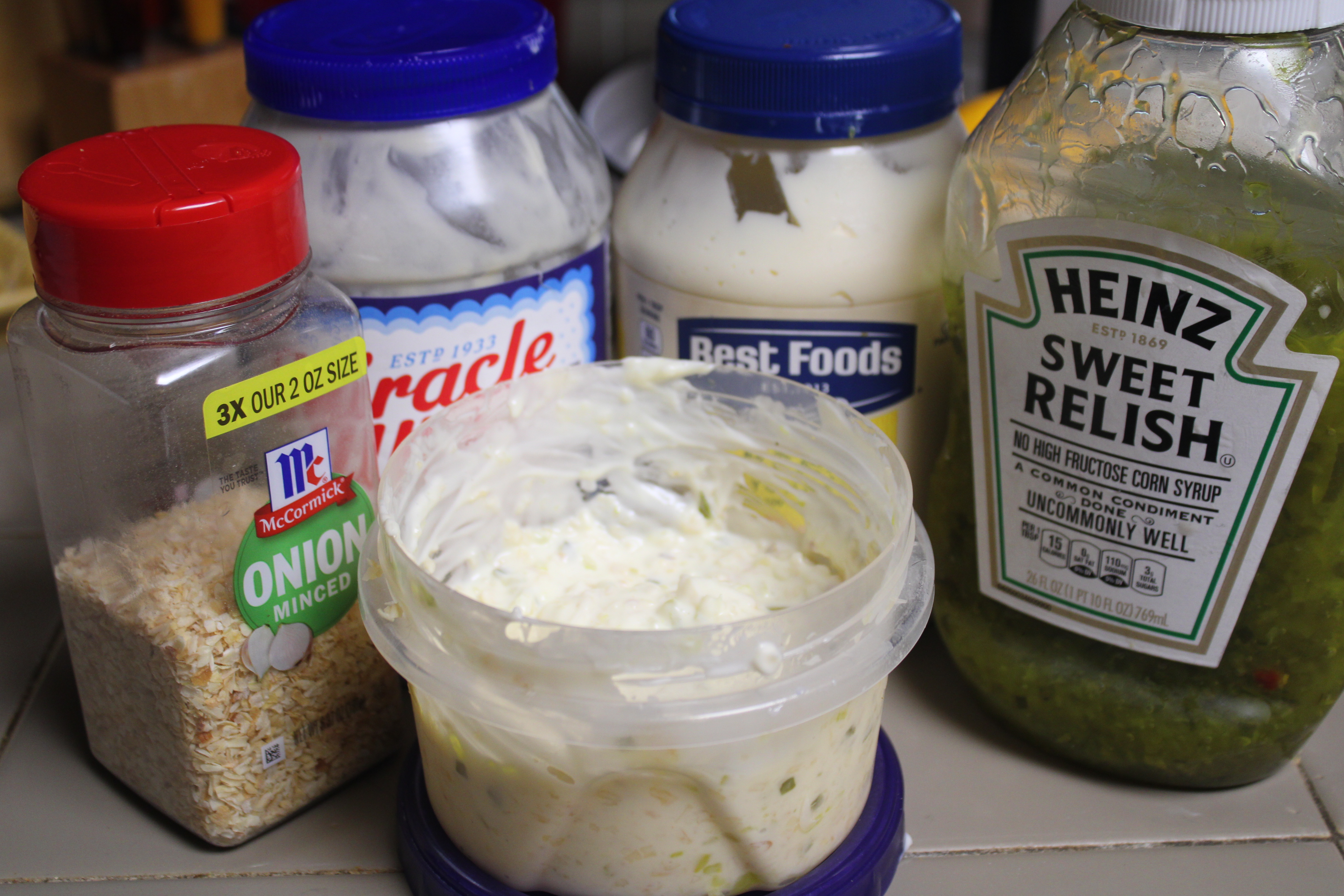 In a small bowl, re-hydrate the onion with a little hot water. Let sit for 5 minutes or so. Drain out any water that did not soak into the onion flakes. Add mayonnaise, Miracle White, Pickle Relish and stir to blend. Taste and adjust seasoning with a little salt if desired. Chill until ready to use.