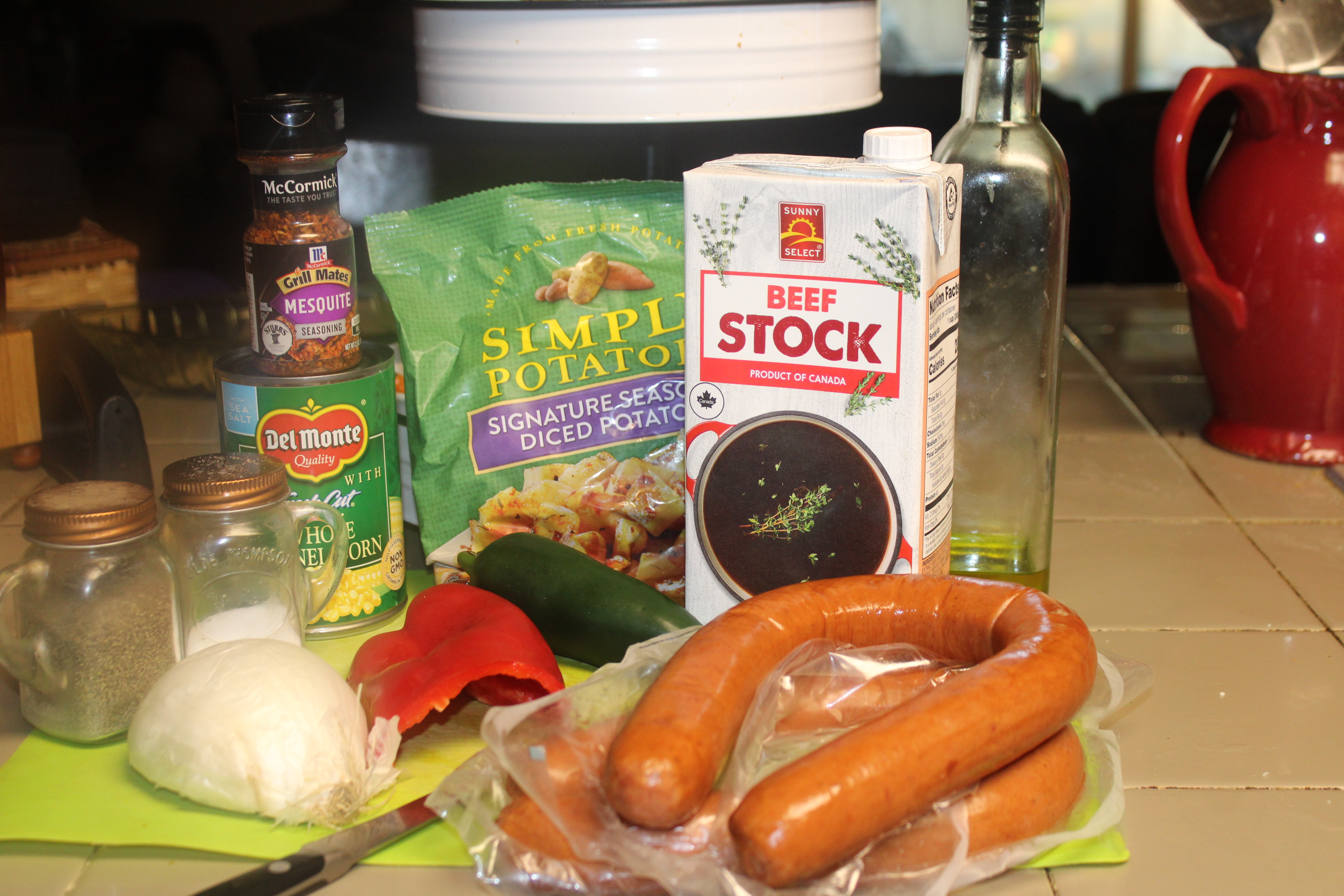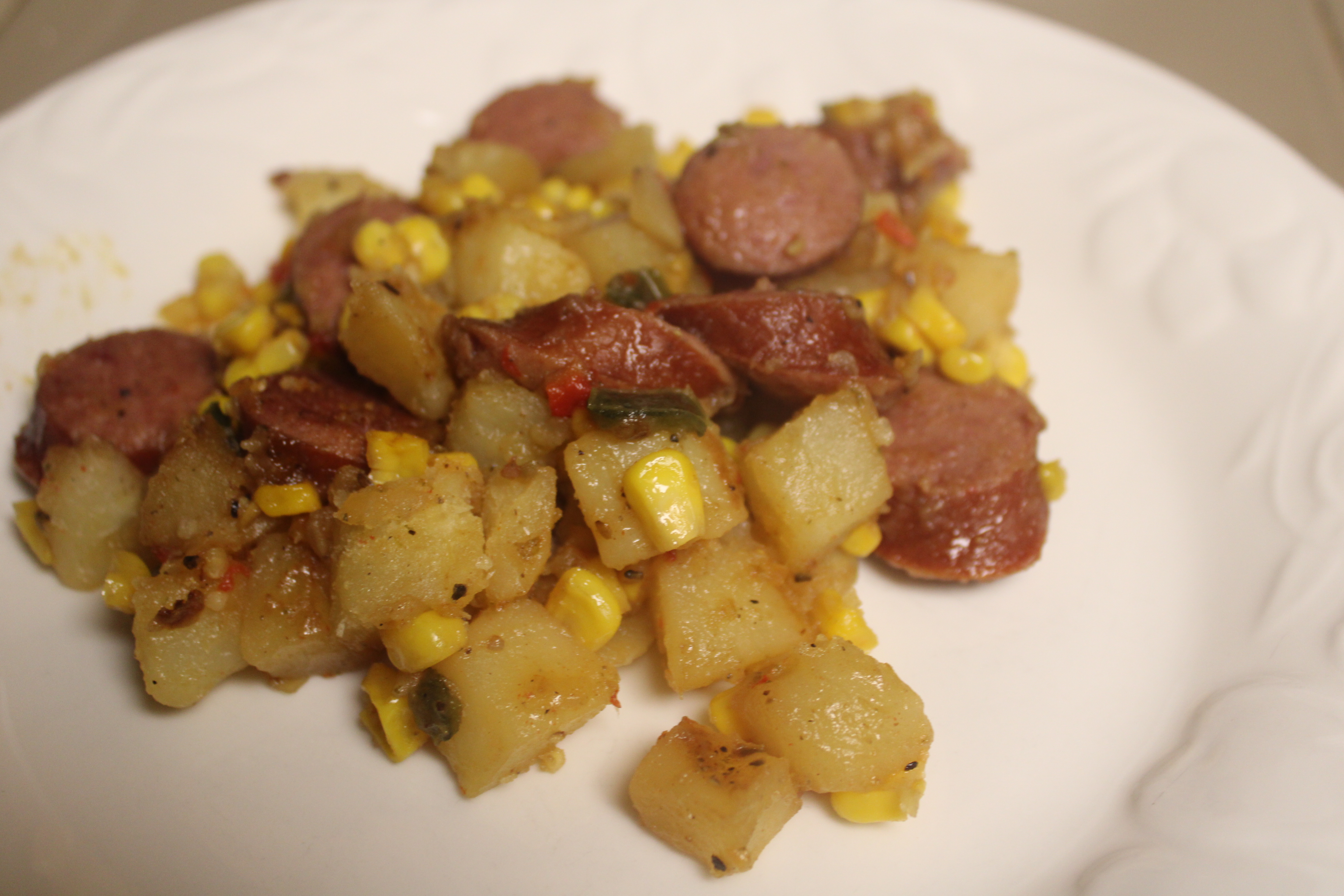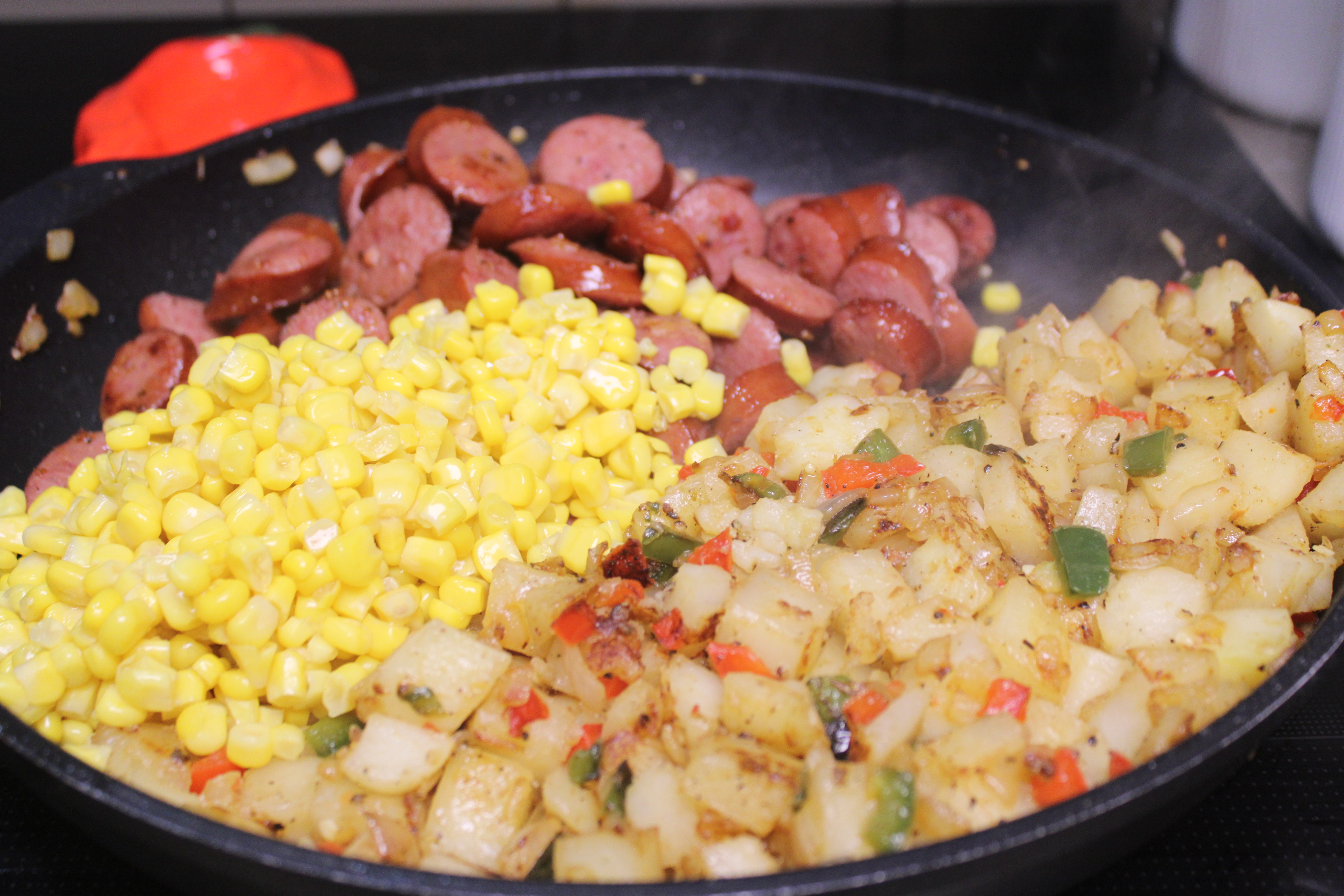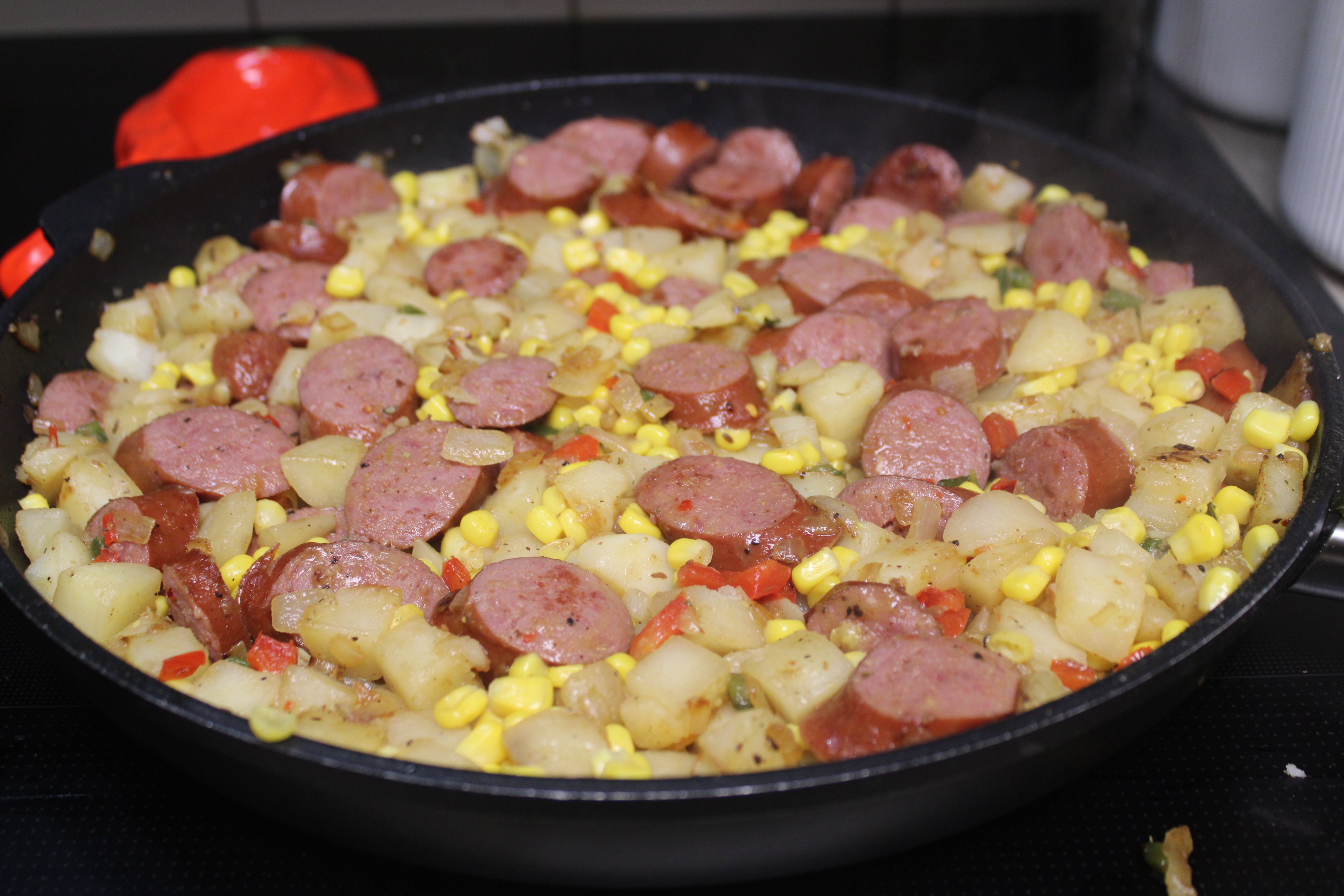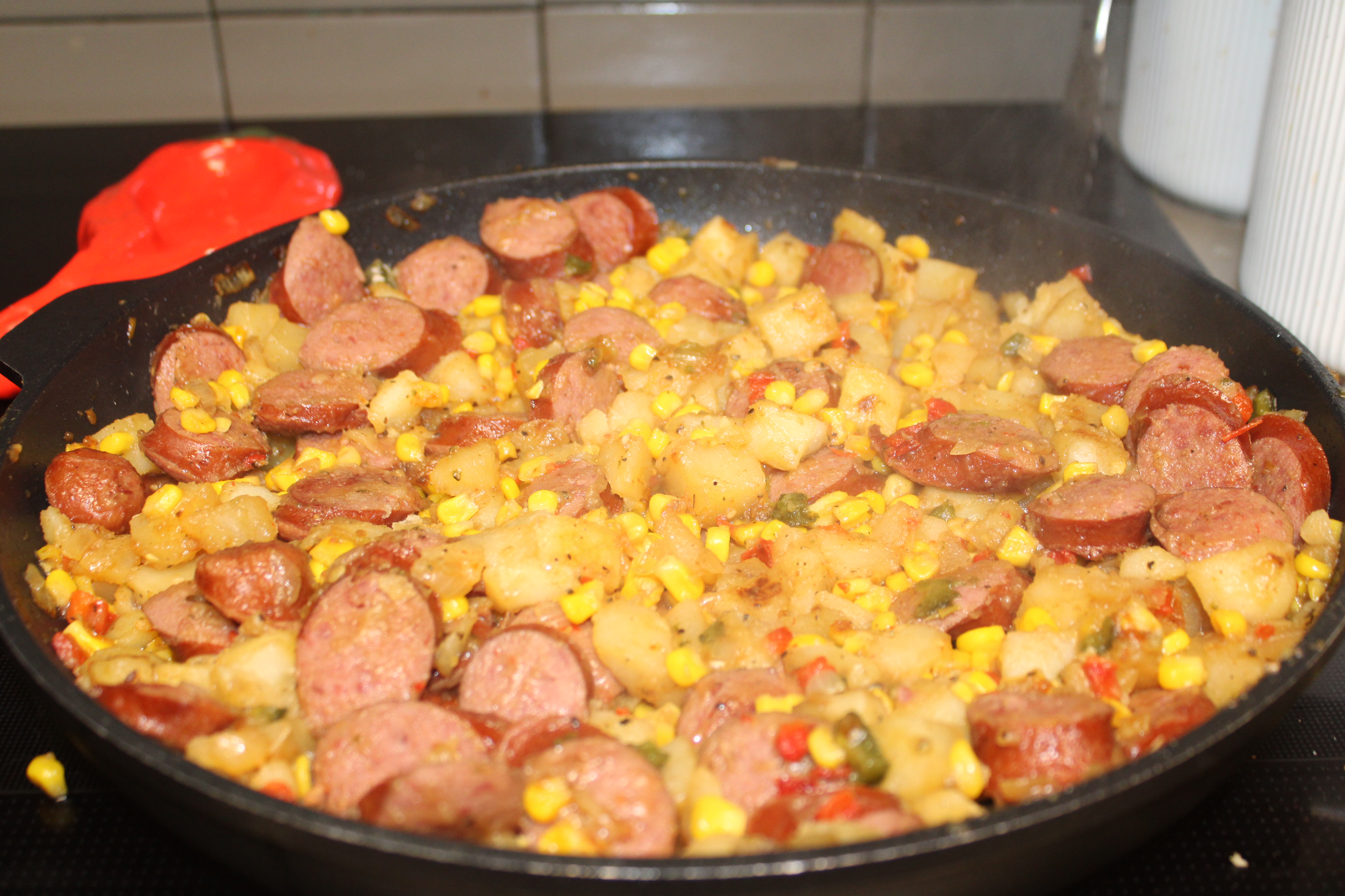 Return sausage to the skillet, add beef stock and corn. Continue to cook, covered, until potatoes are tender and everything is heated through, about 12 minutes longer. Taste and adjust seasoning as necessary with salt and pepper. Serve straight from the skillet and enjoy.