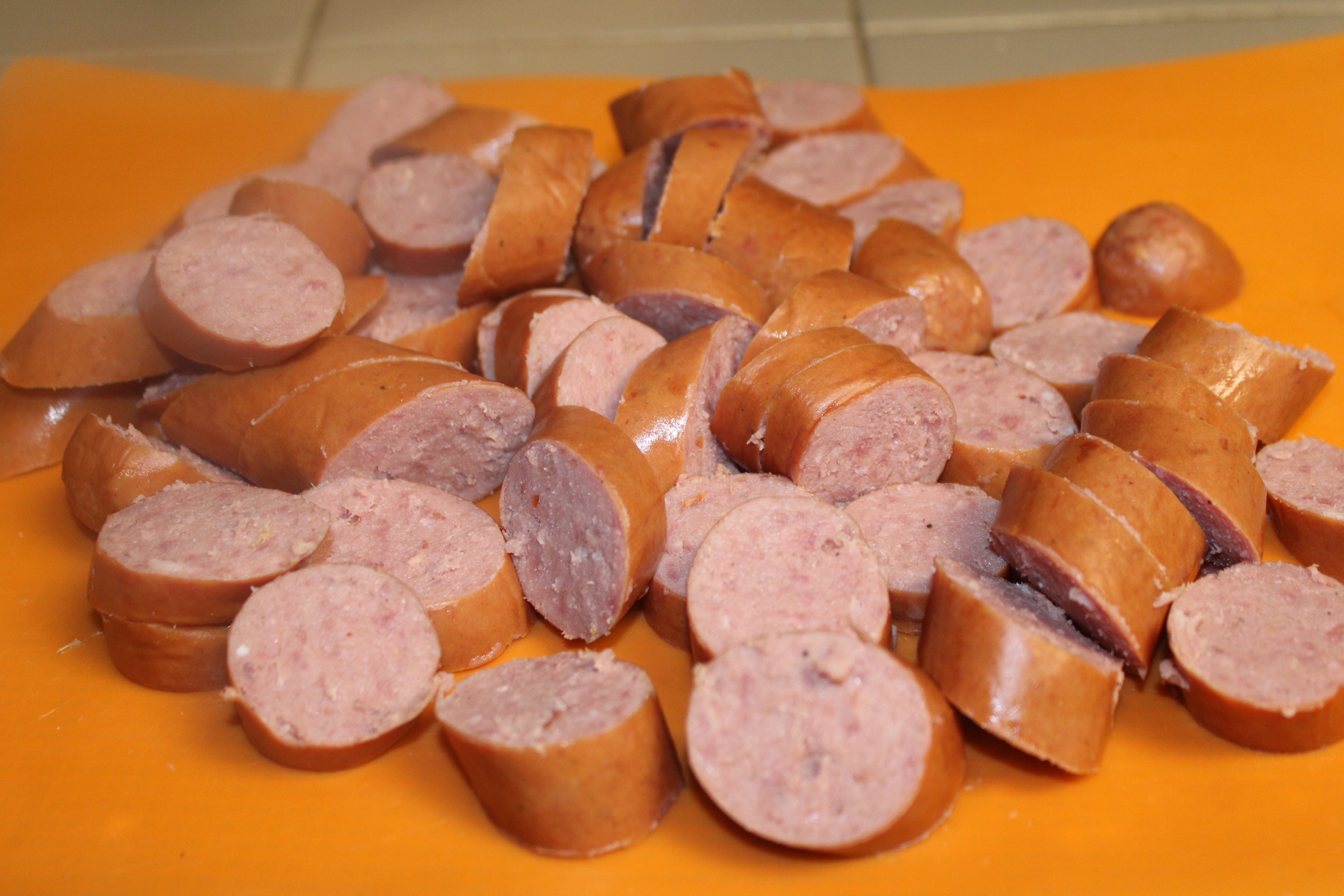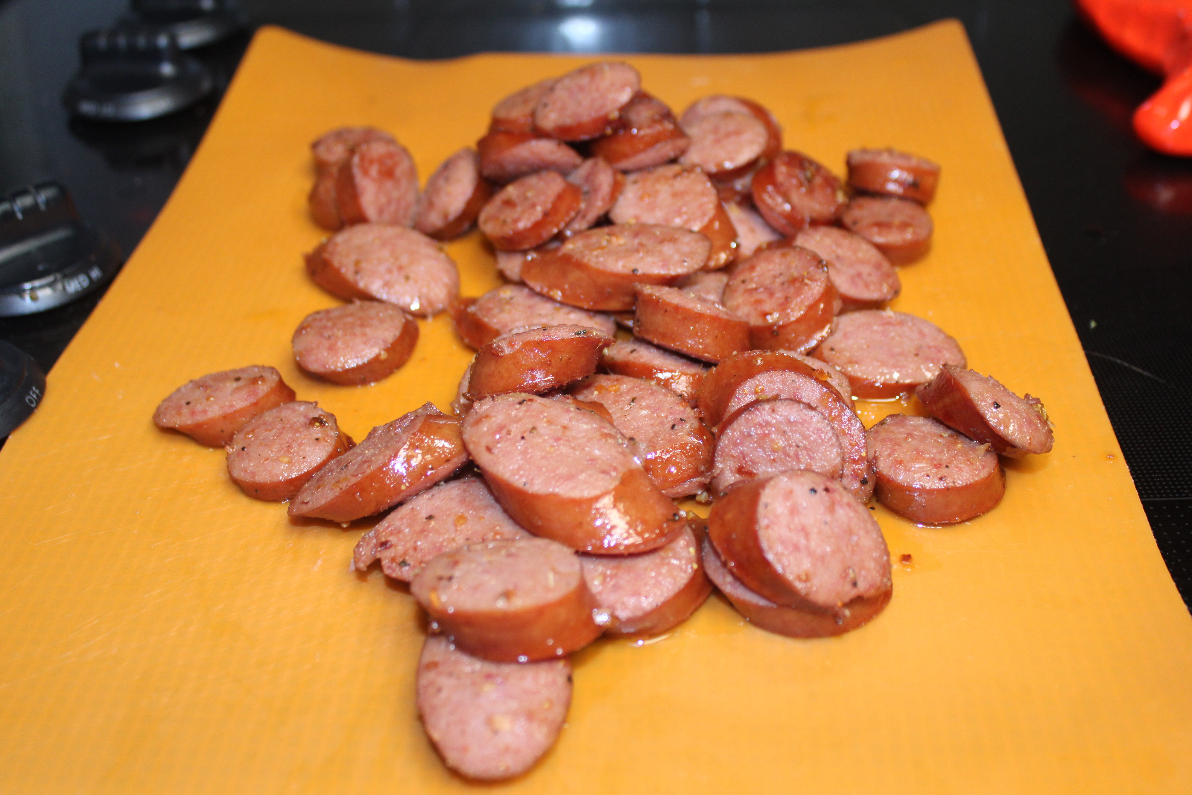 Slice sausage into bite-size coin-cut rounds, set aside. Peel and dice onion, set aside. Stem, core, seed and dice bell pepper, set aside. Stem jalapeño pepper, retaining seeds as desired for heat. Set aside.