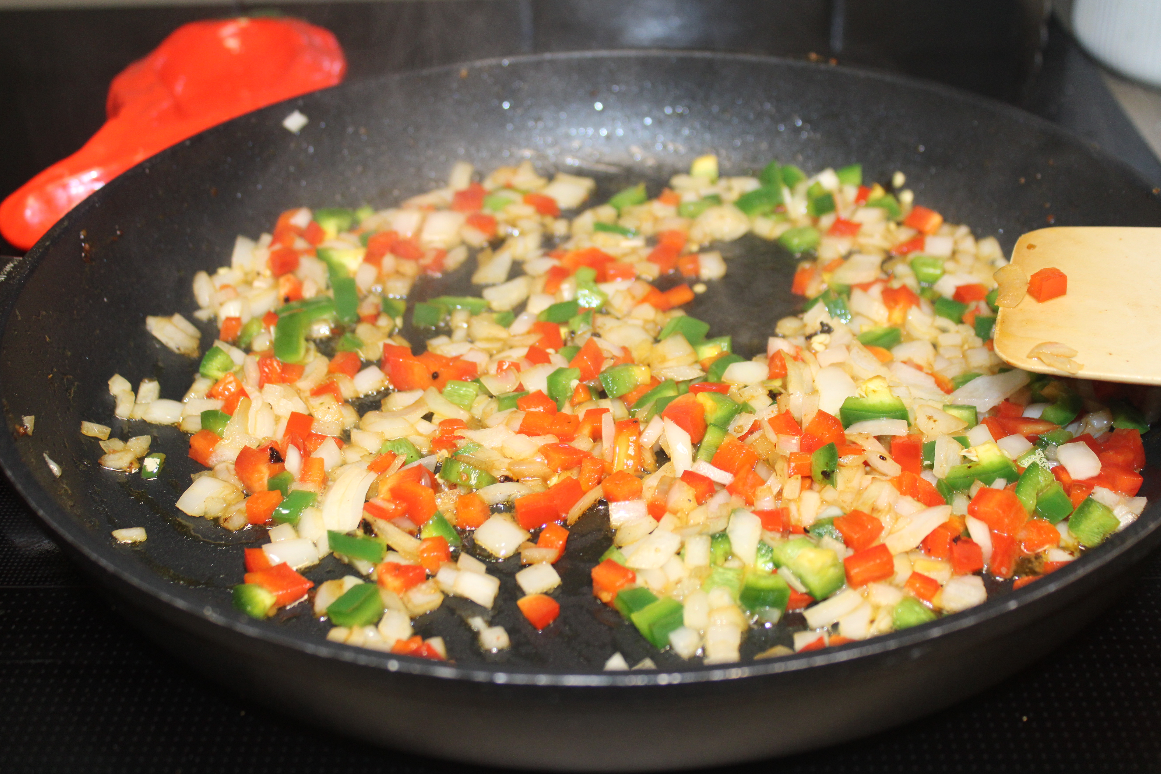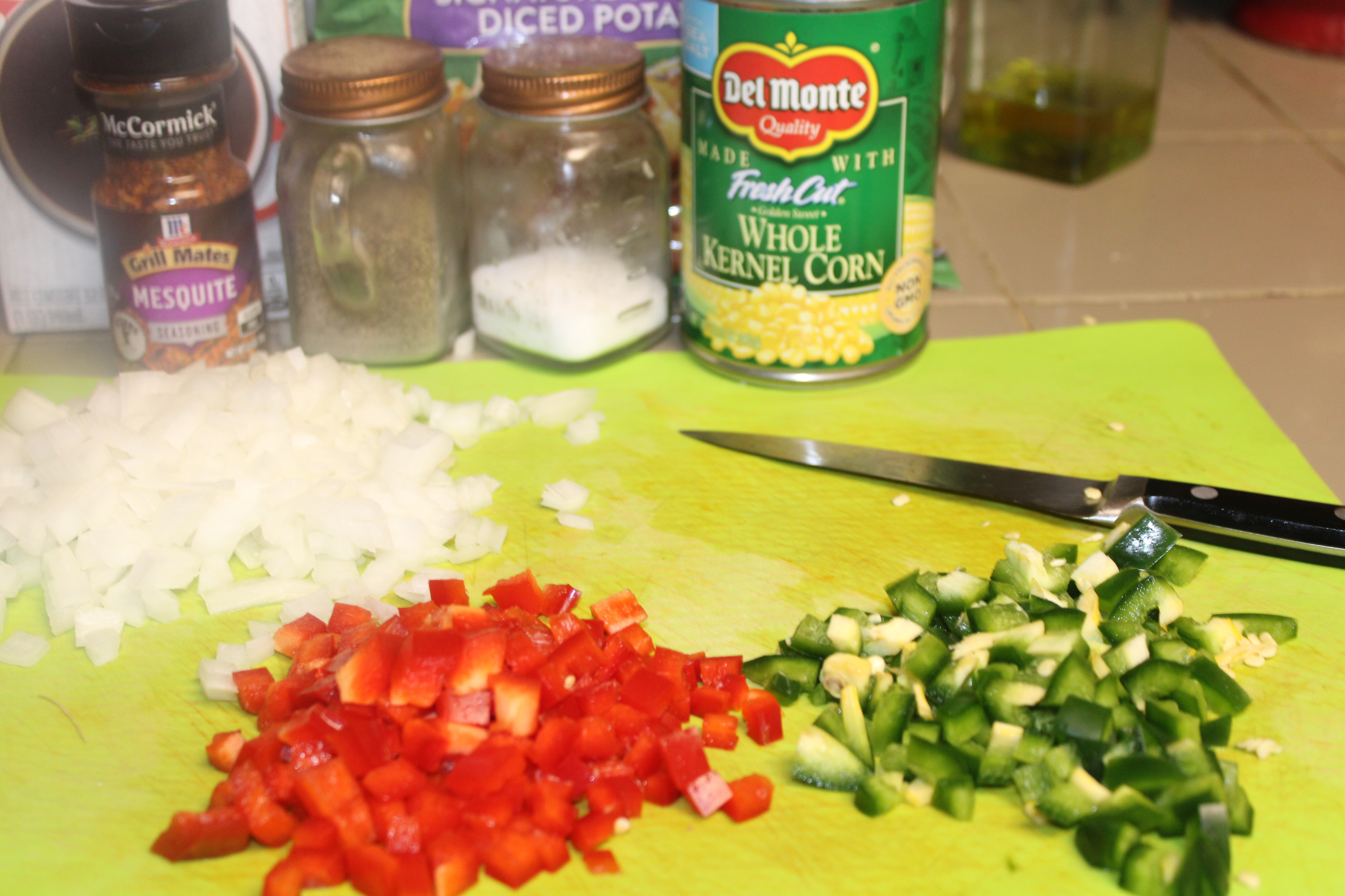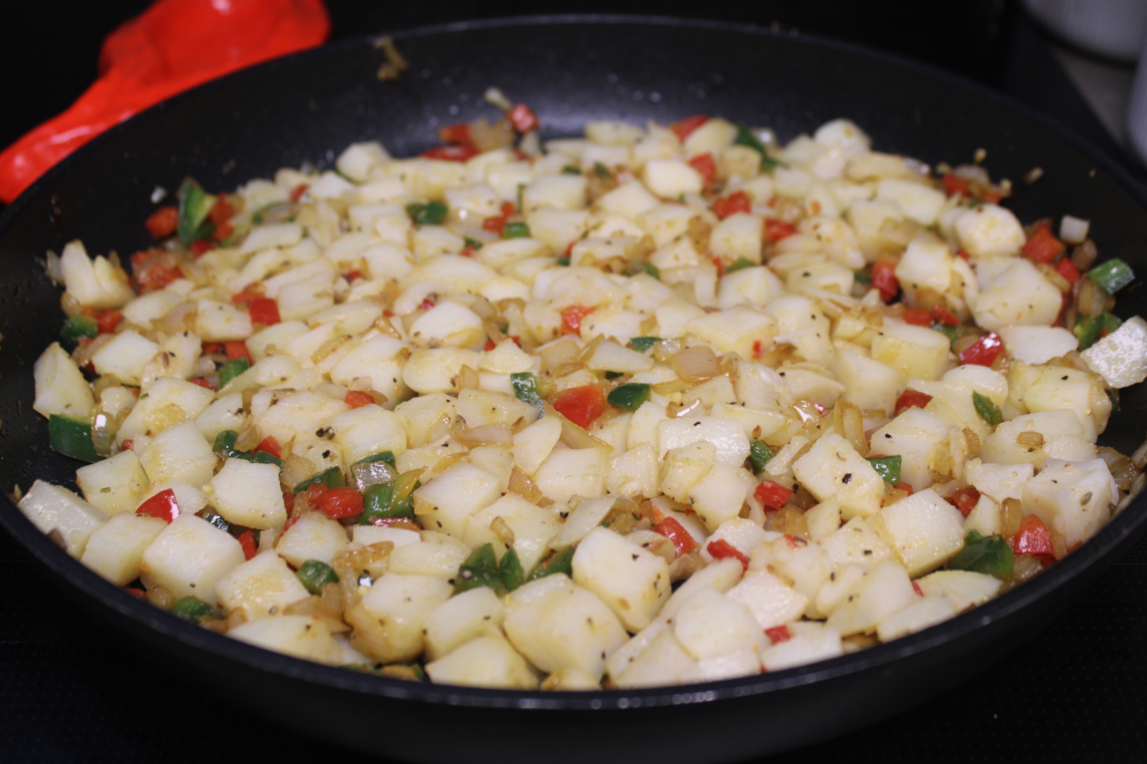 Add onions and peppers to the skillet. Sauté over medium heat until vegetables and tender yet crisp, about 6 minutes. Stir in the diced potatoes, spread out evenly. Cook until potatoes begin to brown, about 5 minutes. Turn and continue to brown another 3 or 4 minutes.
