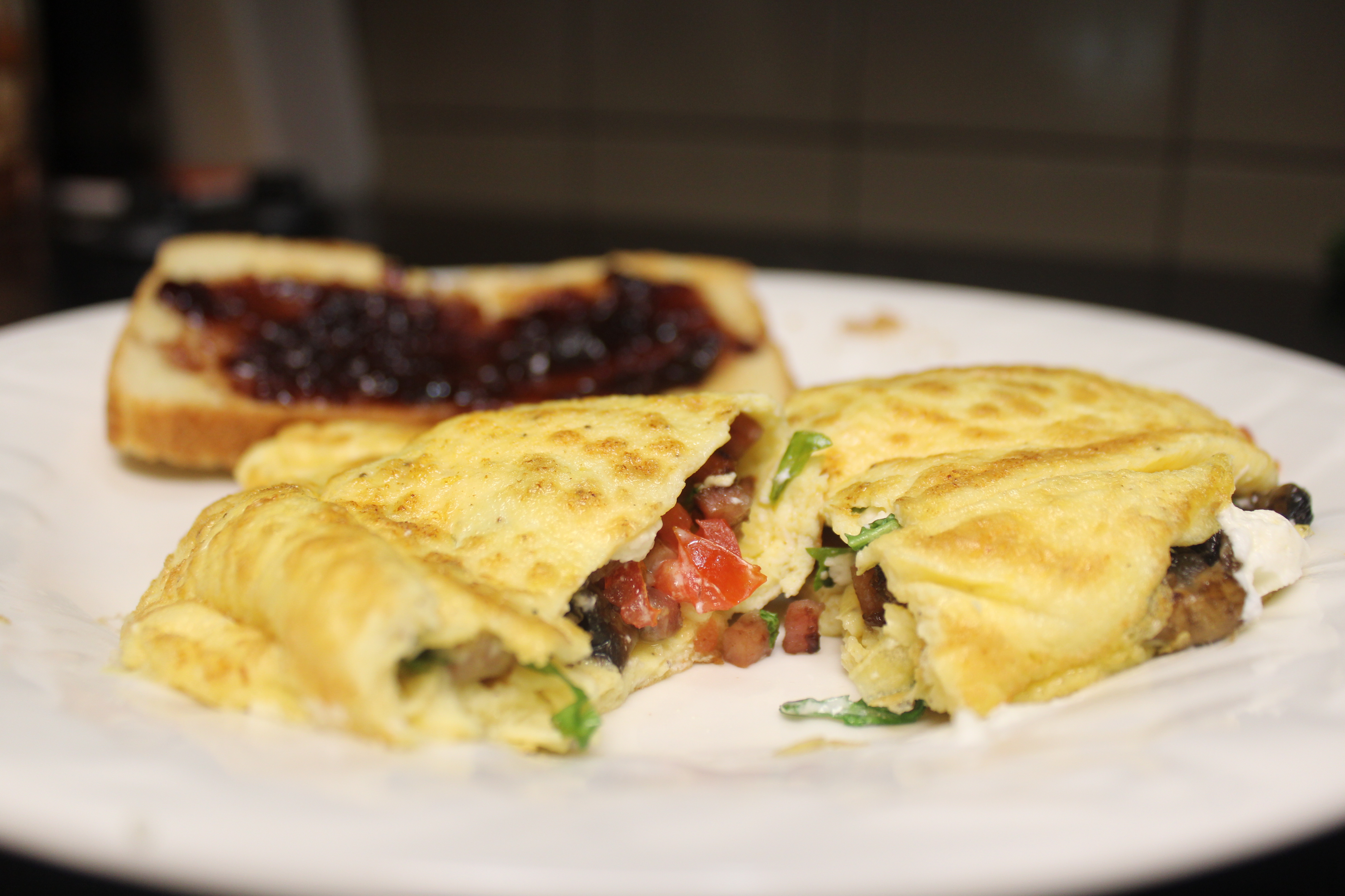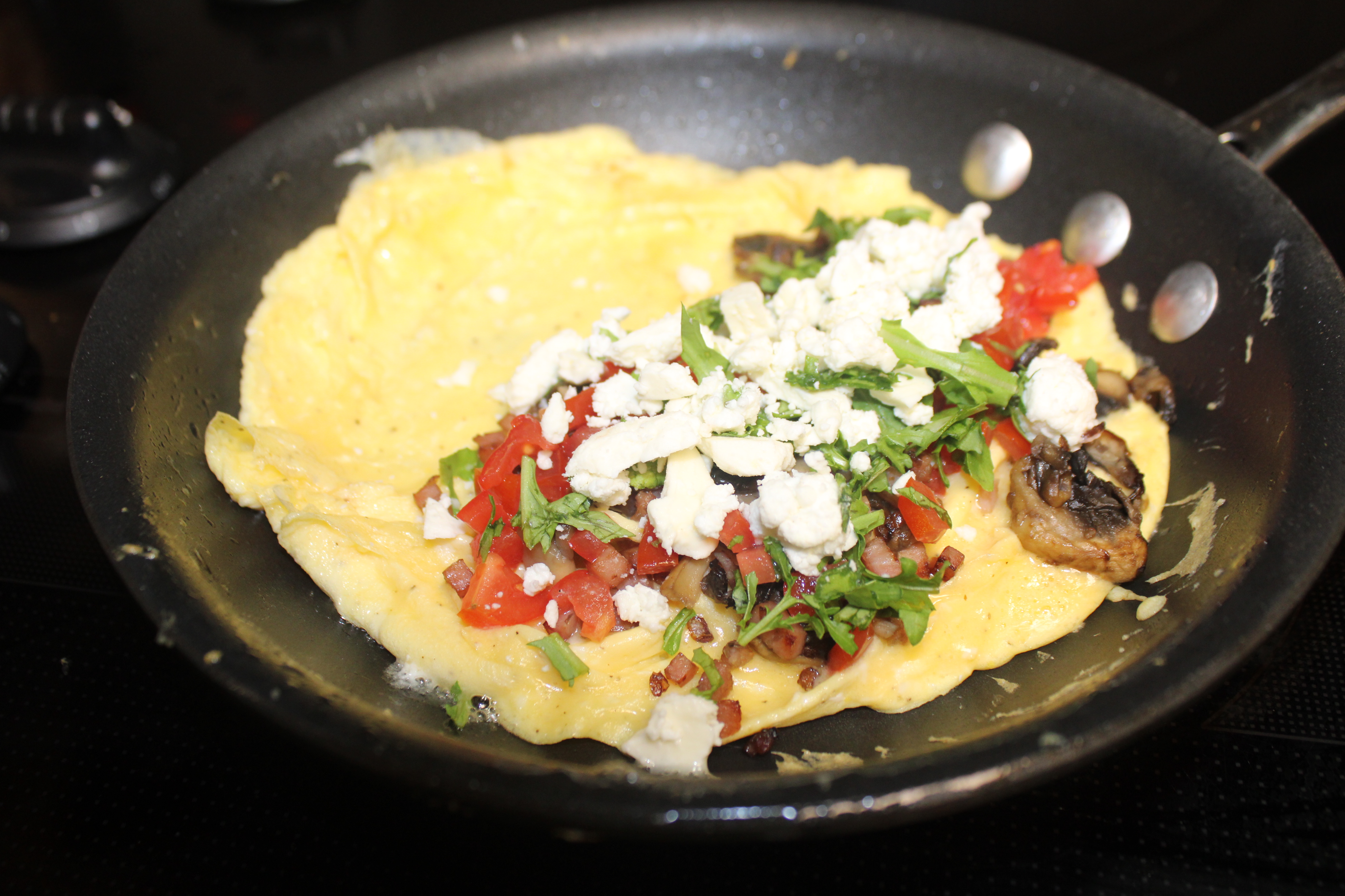Remove from heat, fill half of the omelette as desired with the sautéed ham mixture, mushrooms, tomatoes, Arugula and blended cheese. Fold over, slide onto a warm plate. Awesome with toast and jam.