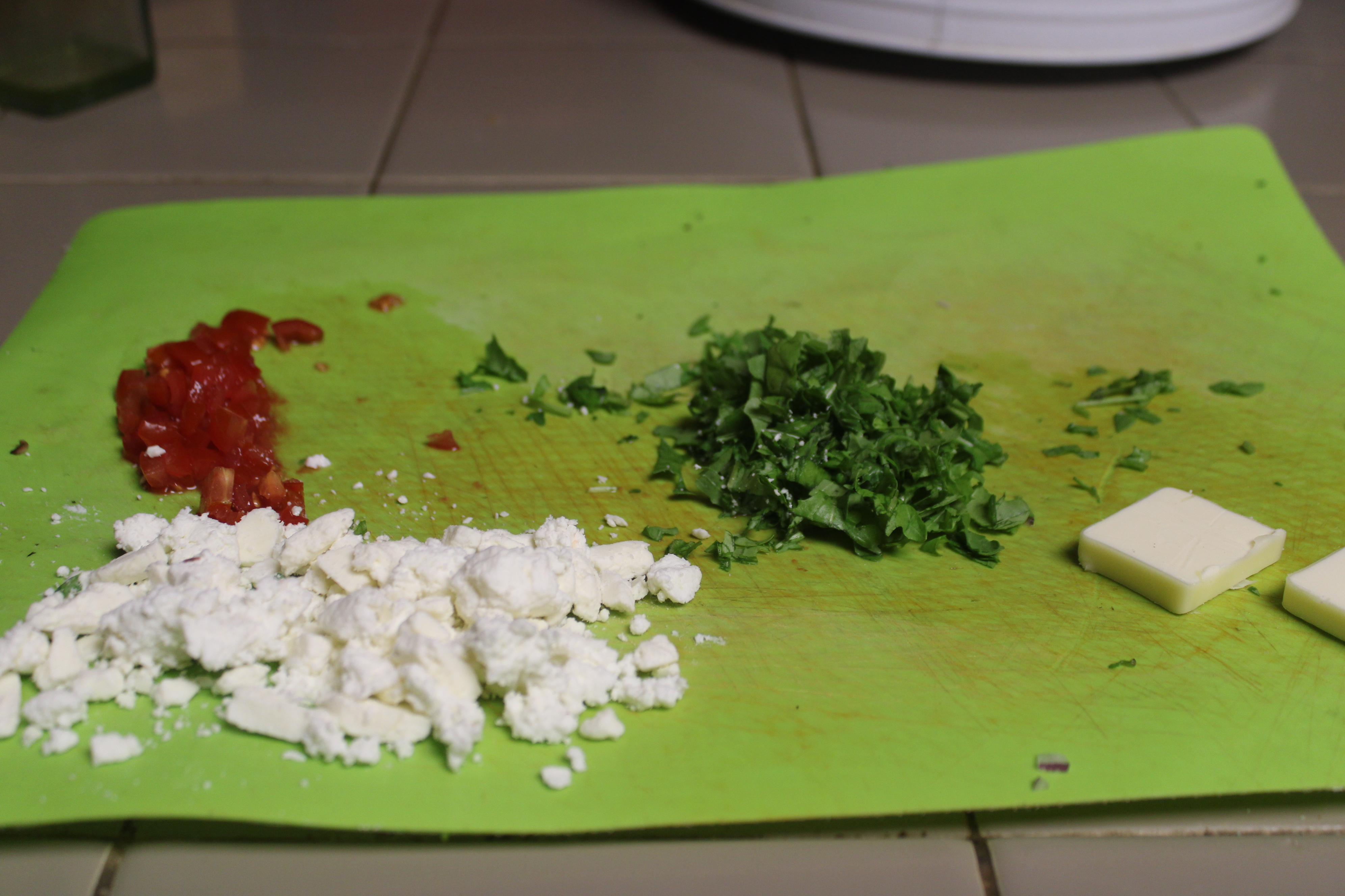Dice tomatoes, rinse and snip Arugula if using, pat dry. Blend cheeses together as desired, set aside.