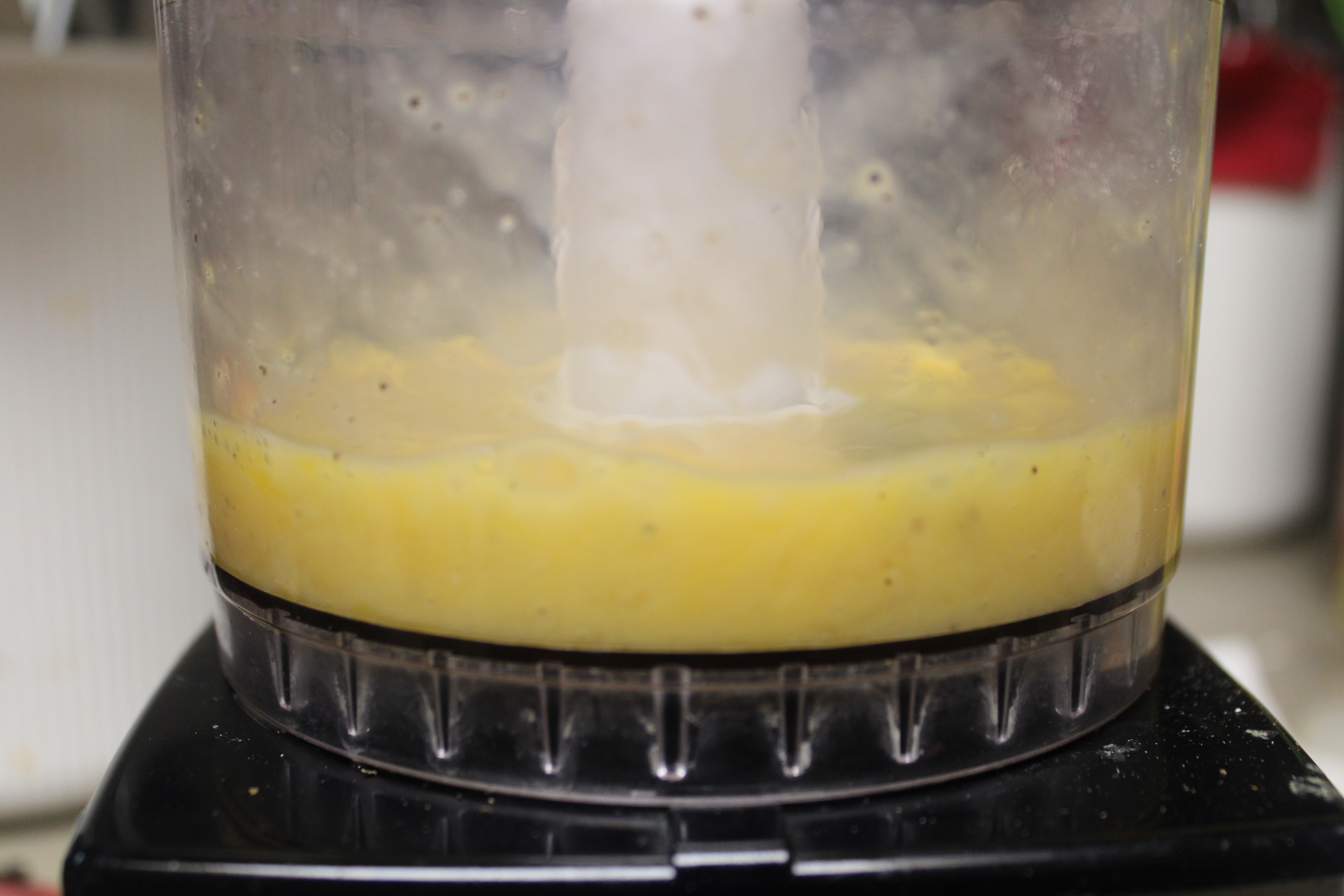Place eggs in a small food processor. Pulse to blend fully.