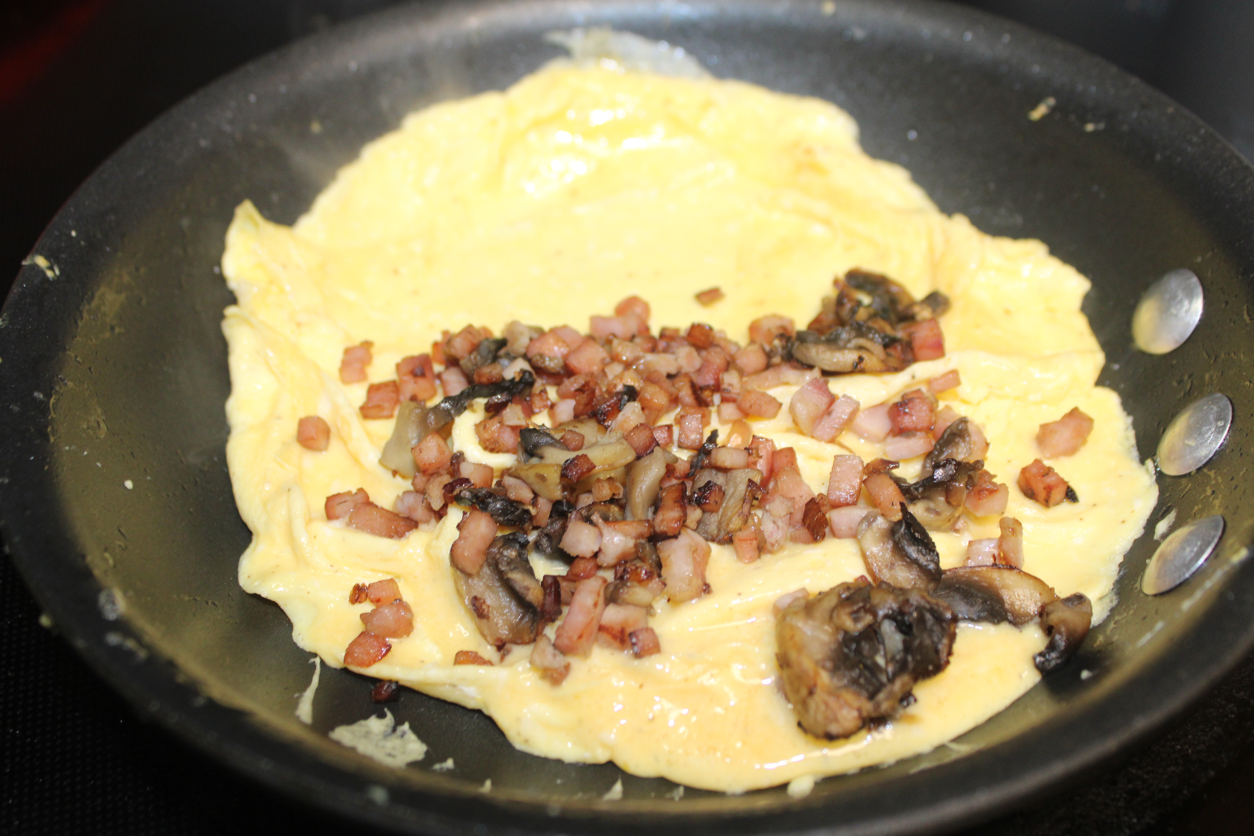 Finely dice ham. Clean, stem and dice mushrooms. Peel and dice red onions. Place a little olive oil in a sauté pan, sauté ham, mushrooms and onion together until warmed through.