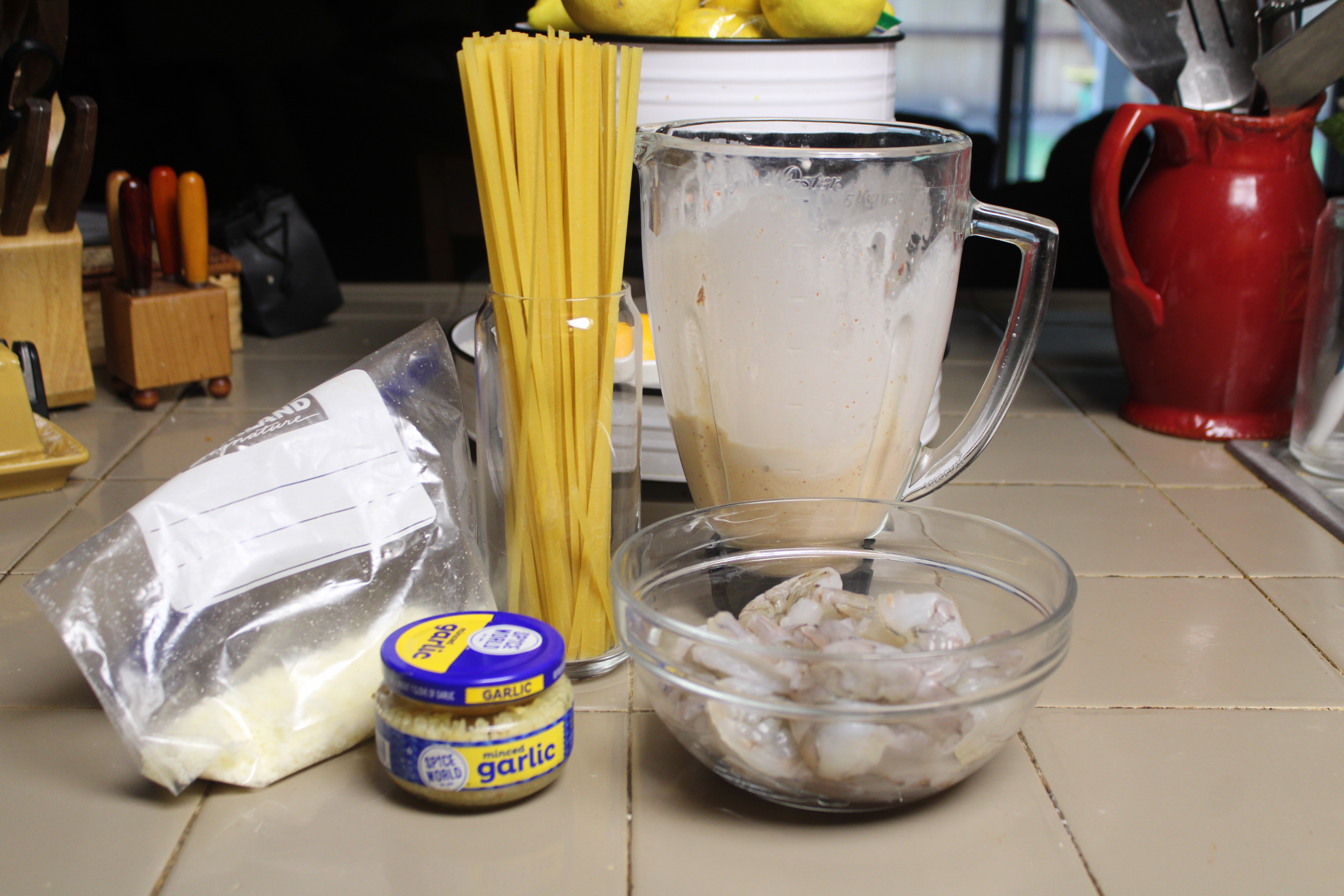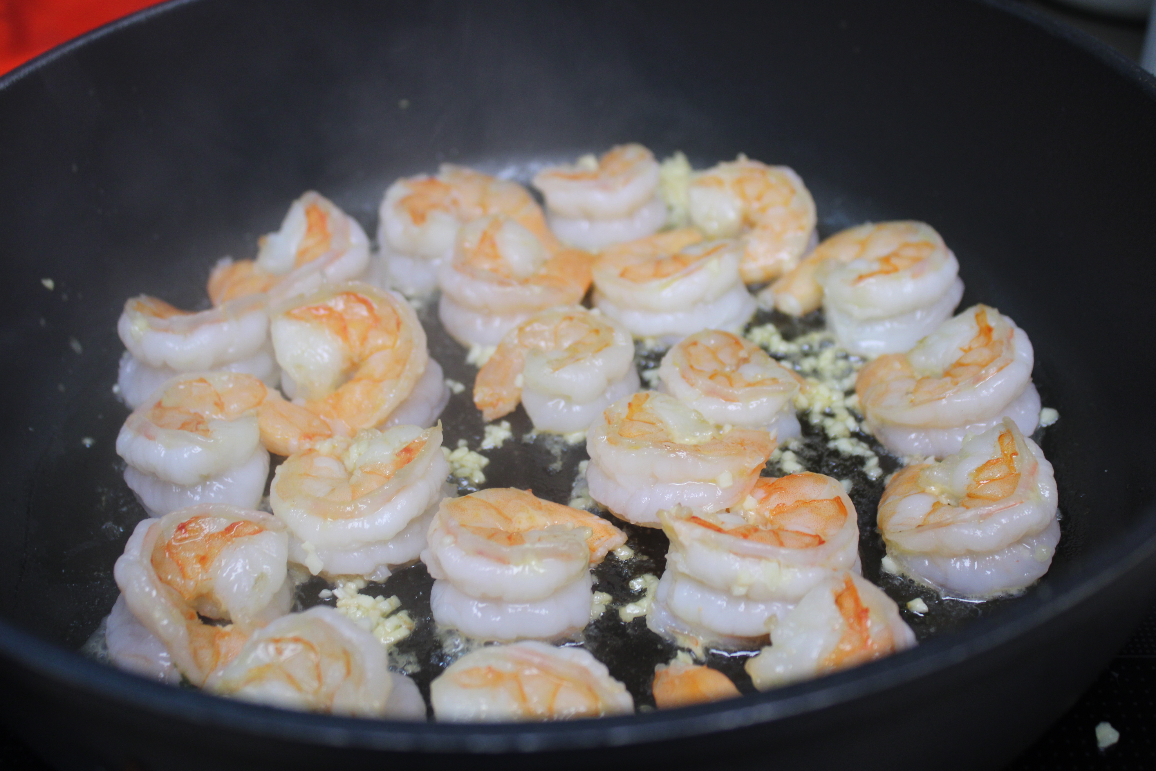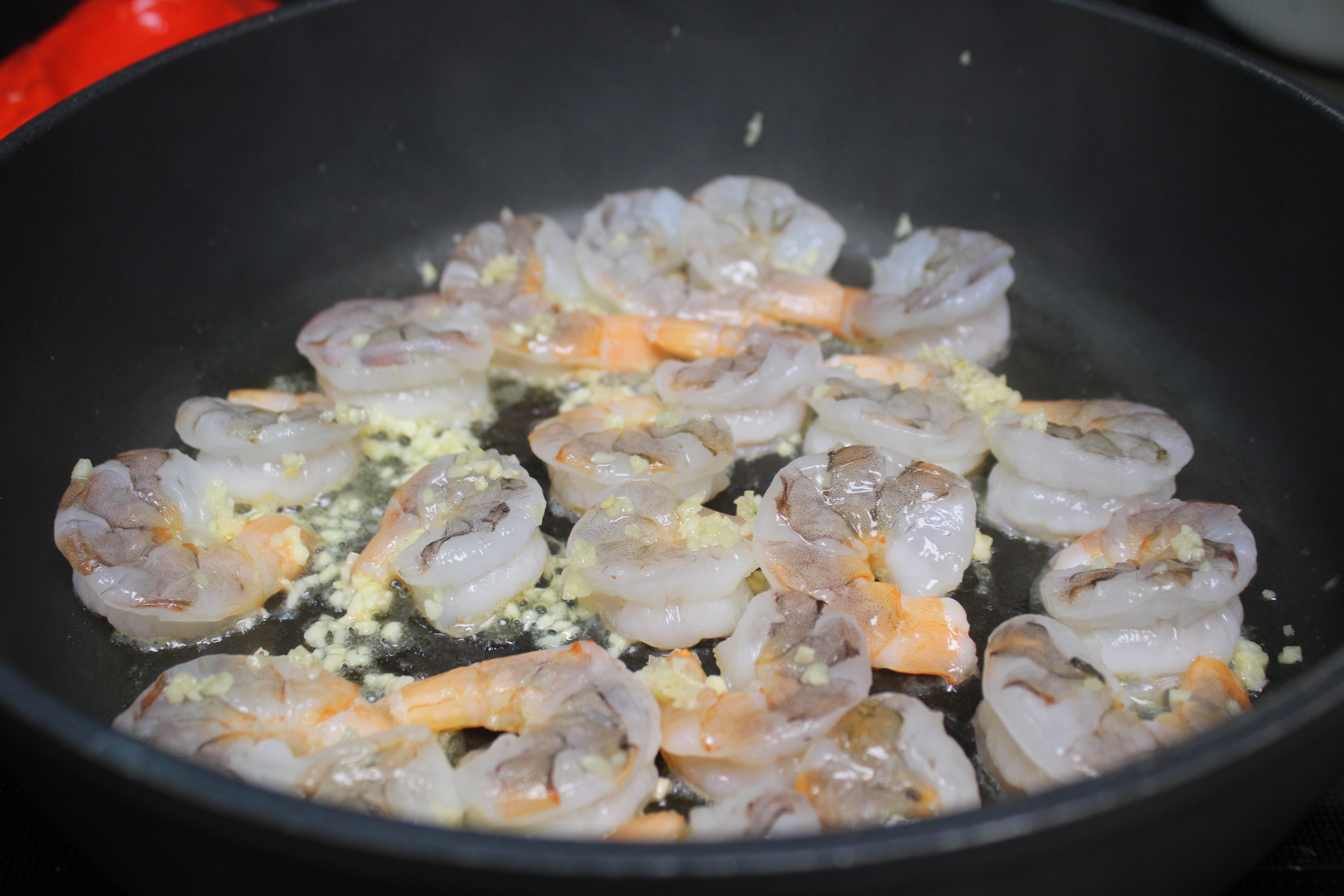 While the water comes to a boil and the pasta cooks, peel and devein shrimp, removing tails. Measure garlic from a jar, set aside.