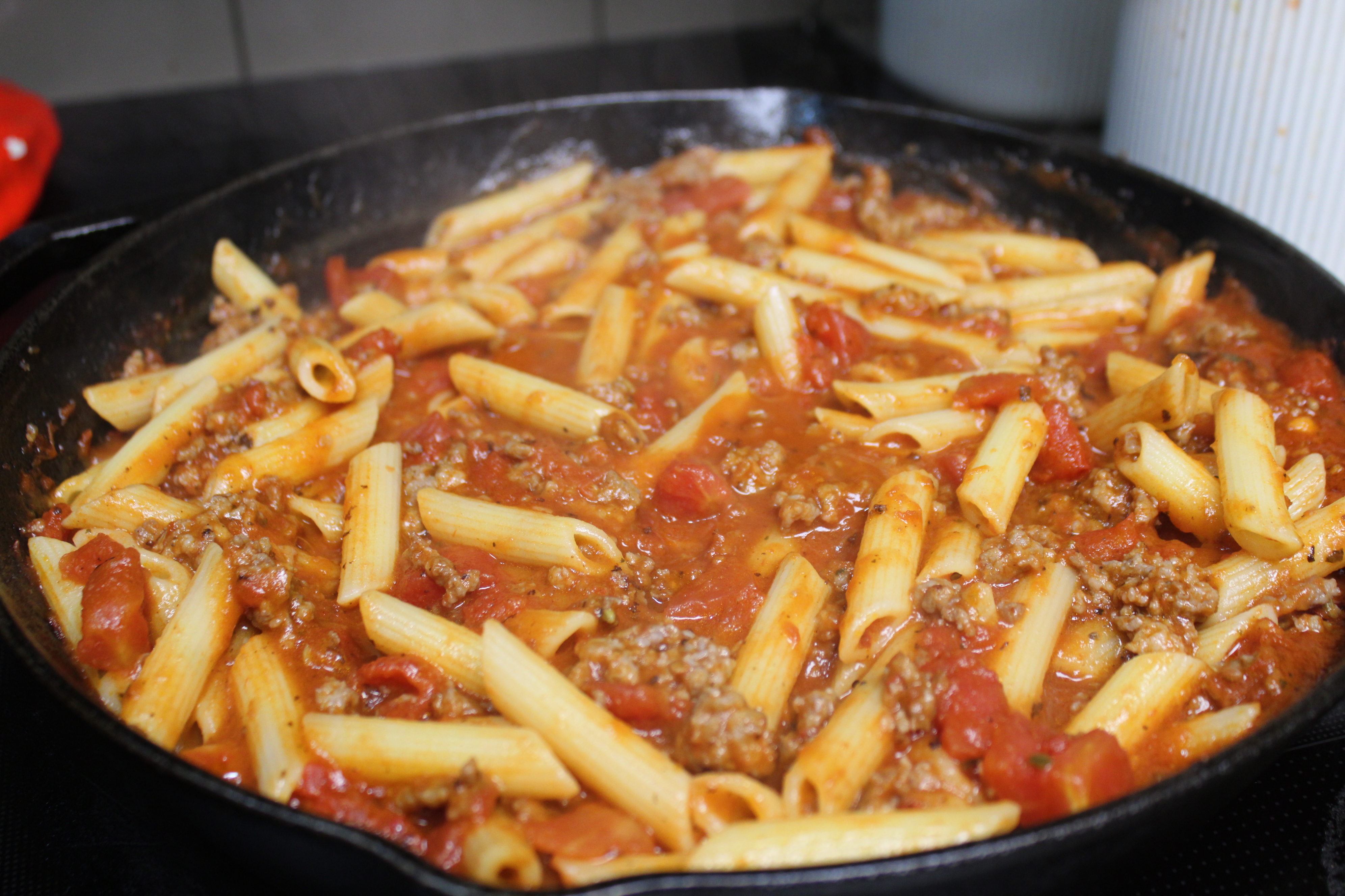 In a cast iron skillet, cook sausage until browned, breaking apart as it cooks. Drain well. Return the sausage to the skillet, season with red pepper flakes, stir in the pasta sauce.