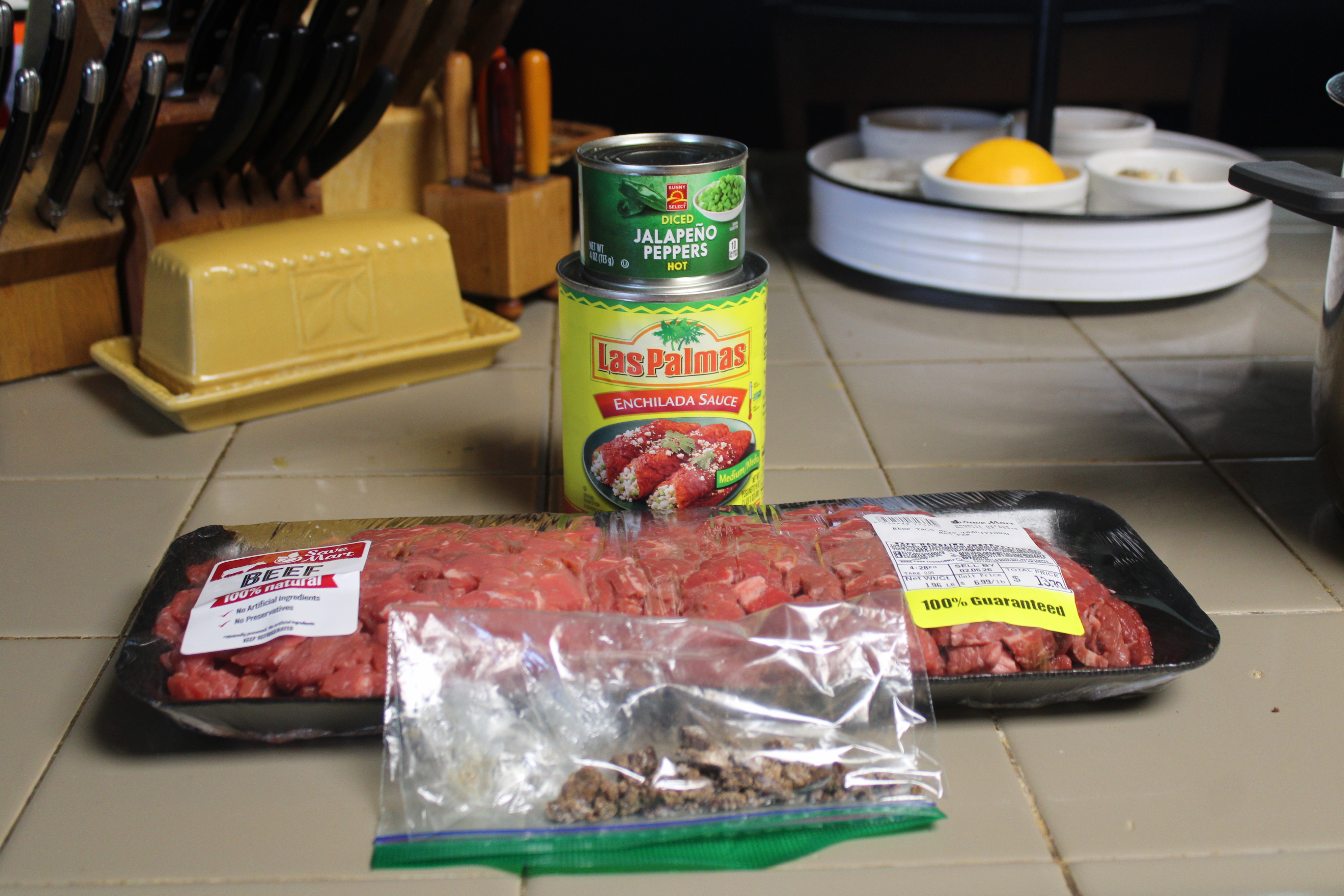 Spray inside of crock pot with non-stick spray. Add in the chopped meat, enchilada sauce, and diced Jalapeños. Crush the bullion cubes, sprinkle over the top. Stir to mix. Cover with lid and cook on HIGH setting for 2 hours. Reduce to LOW setting, continue to cook another 4 hours.
