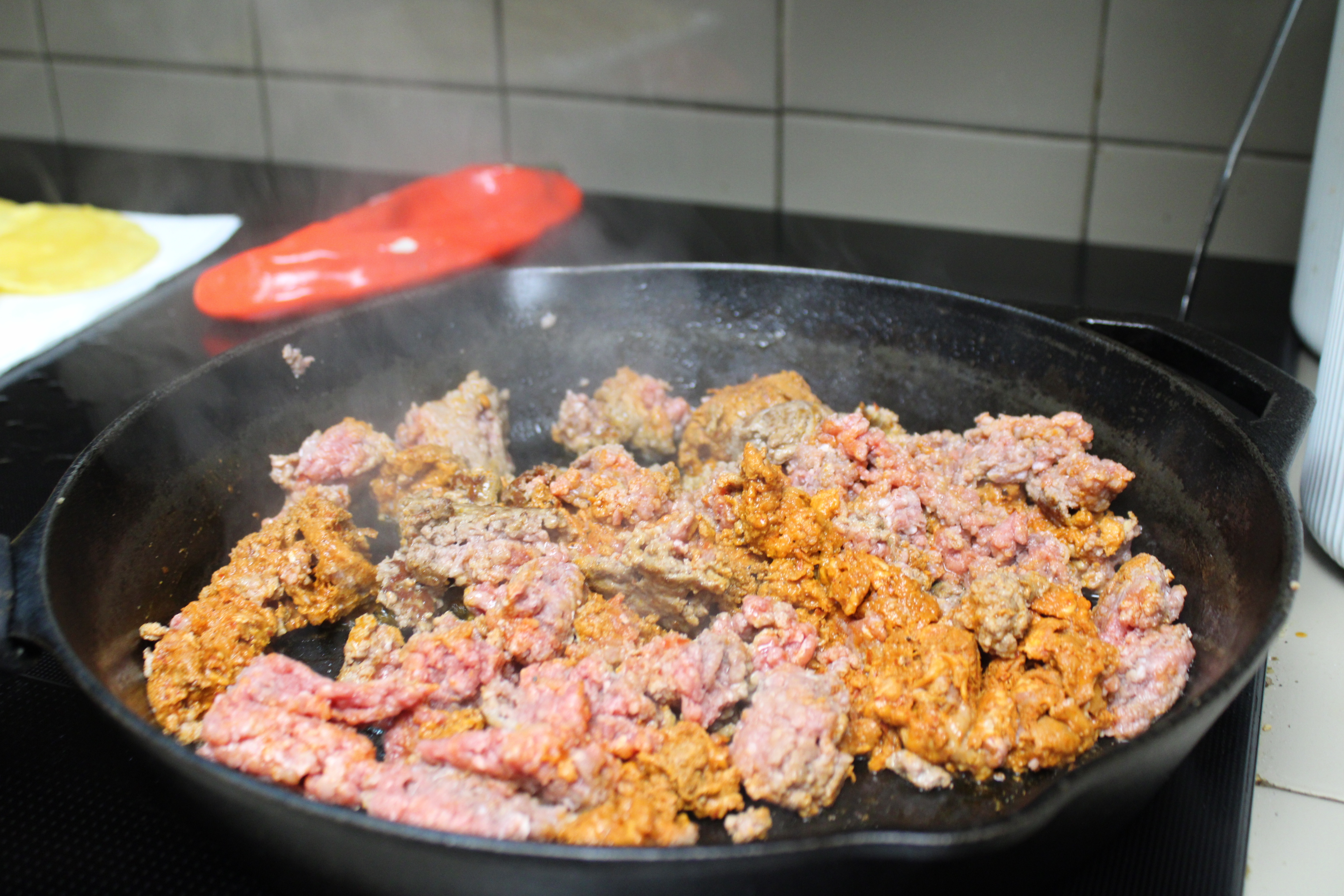 In a large cast iron skillet, crumble the ground beef and chorizo meat together. Over medium-high heat, brown the meat mixture, breaking it into small pieces as it browns. DO NOT DRAIN right away. Add seasonings to absorb some of the fat (it’s packed with flavor).