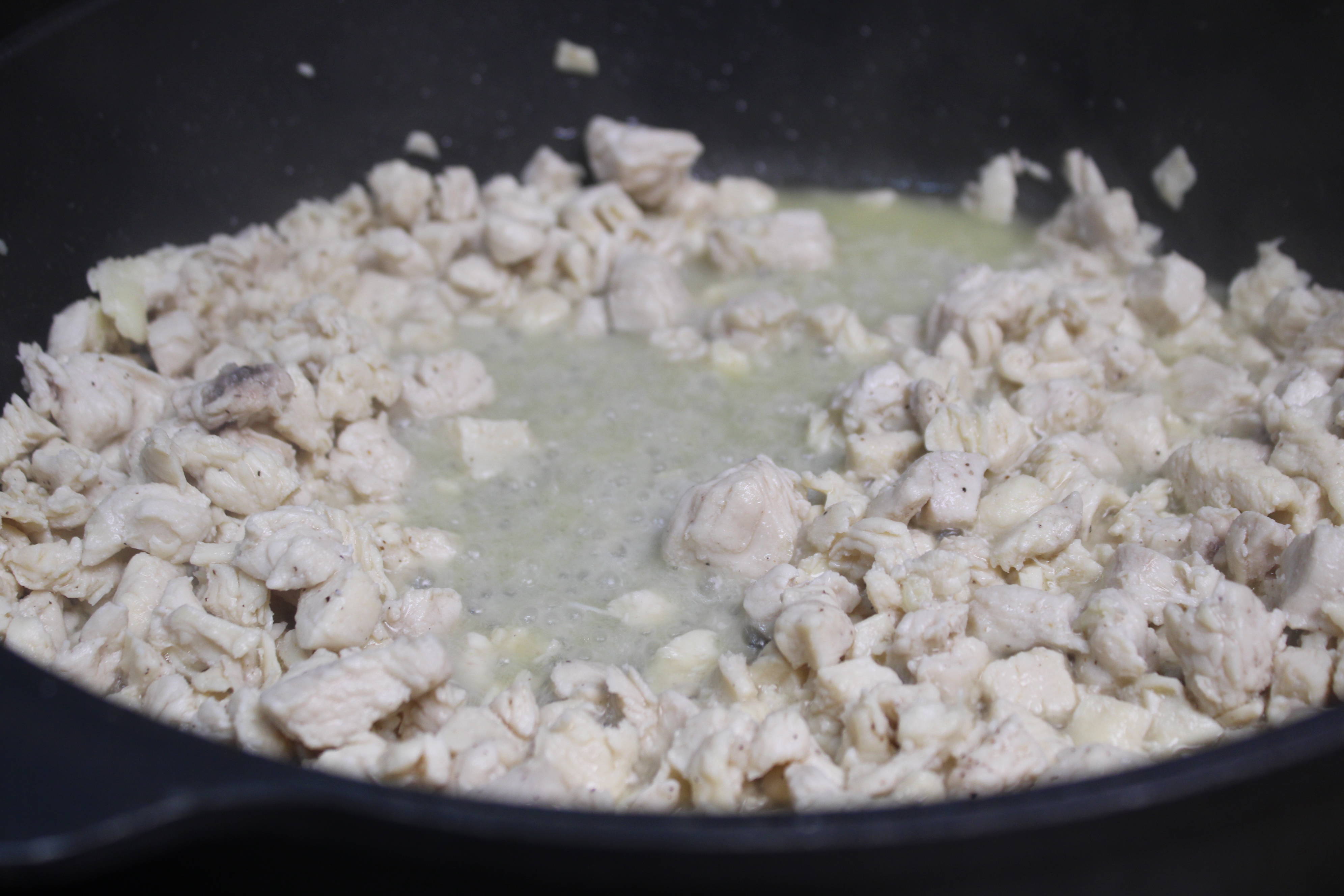 Chop the chicken into small, bite size pieces, set aside. Melt butter in a skillet over medium heat. When ready cook the chicken in the skillet until cooked through, about 7 minutes. While the chicken cooks, clean and thinly slice mushrooms. Add mushroom slices to the pan and cook for 3 to 4 minutes, until mushrooms have released their liquids.