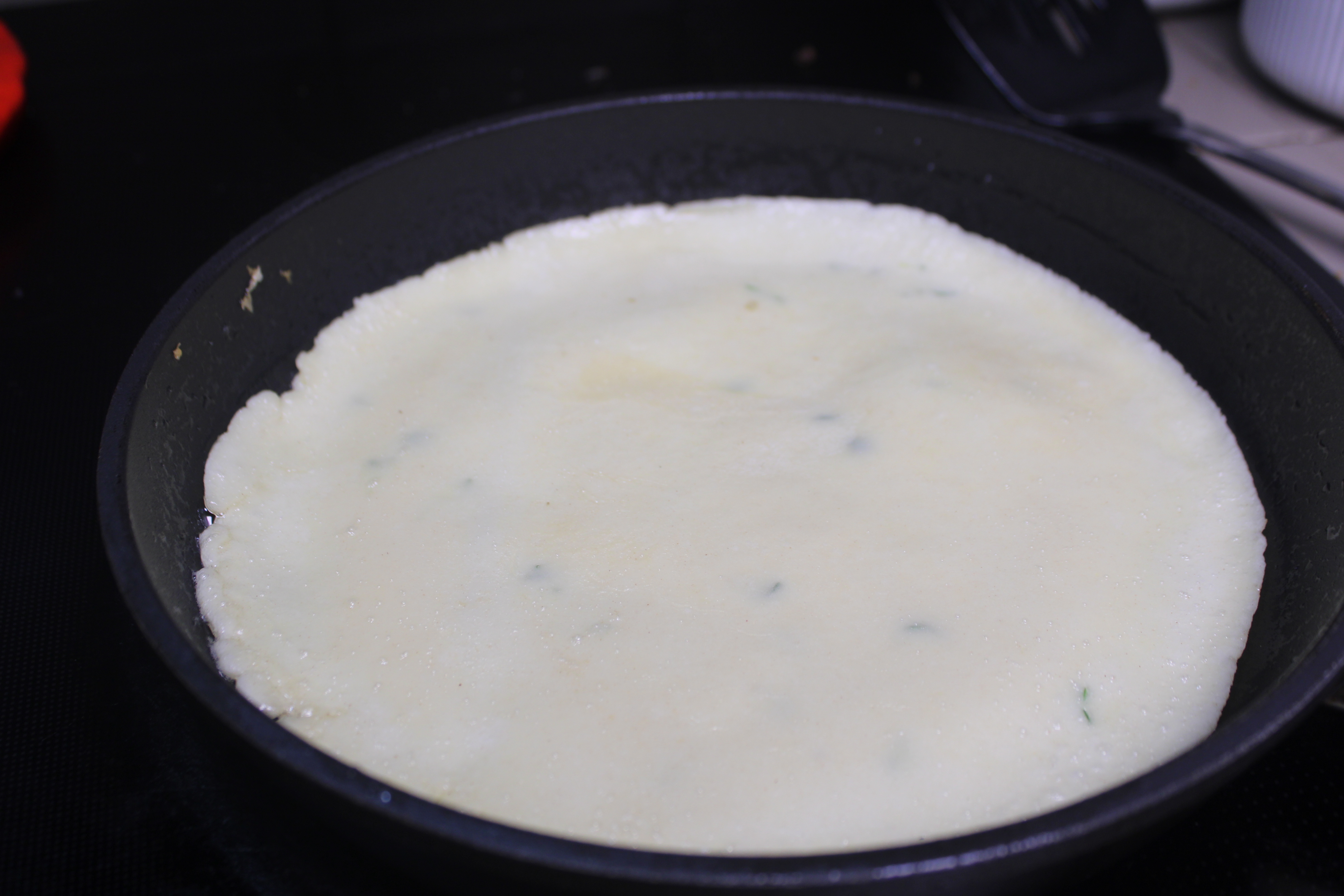 Note: Different pans will heat differently – it may be necessary to make adjustments after the first crêpe is cooked. The pan must be hot enough that the crêpe won’t stick, but not too hot that it burn