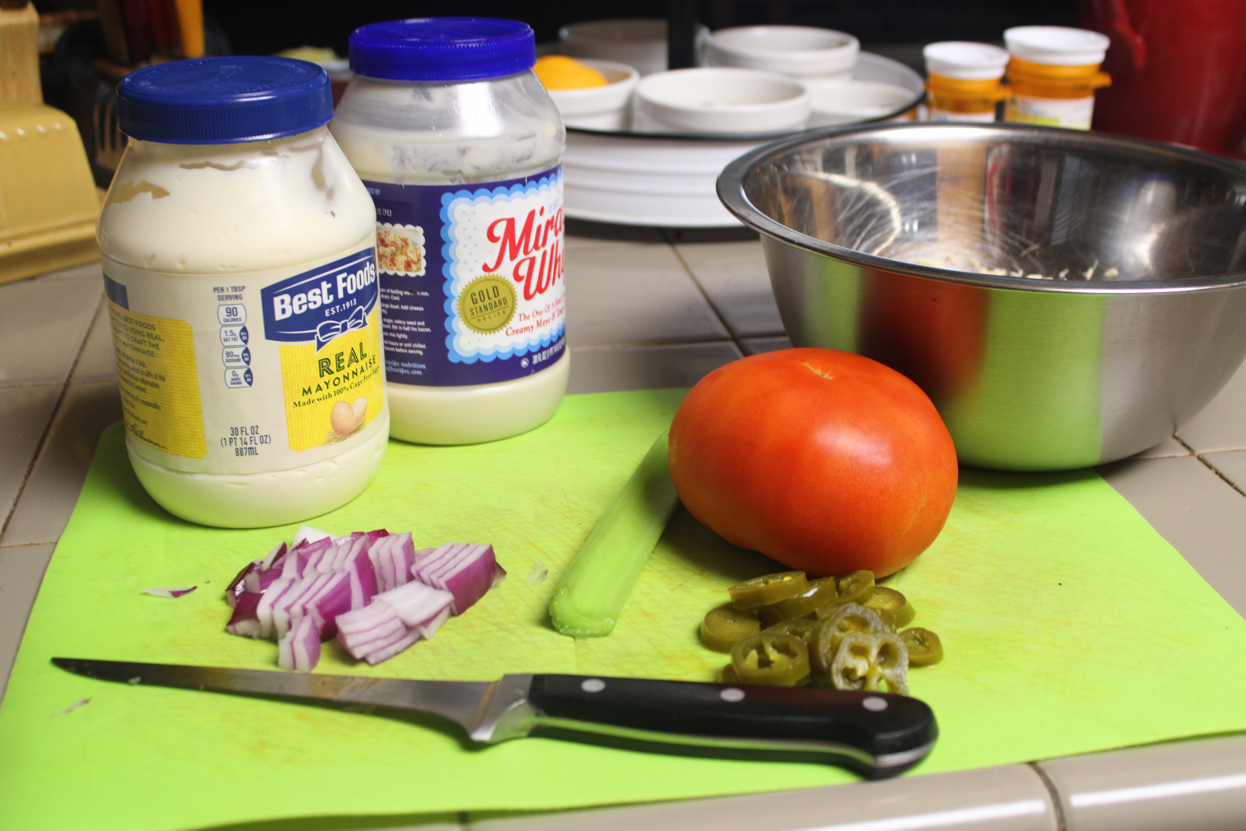 Cut a wedge from the onion, peel and finely chop. Finely chop celery. Drain Jalapeños, finely mince. Drain tuna, add to the bowl. Scatter onion, celery and Jalapeños into a bowl. Stir to blend. Add miracle whip and mayonnaise to create a tuna spread. Set aside.