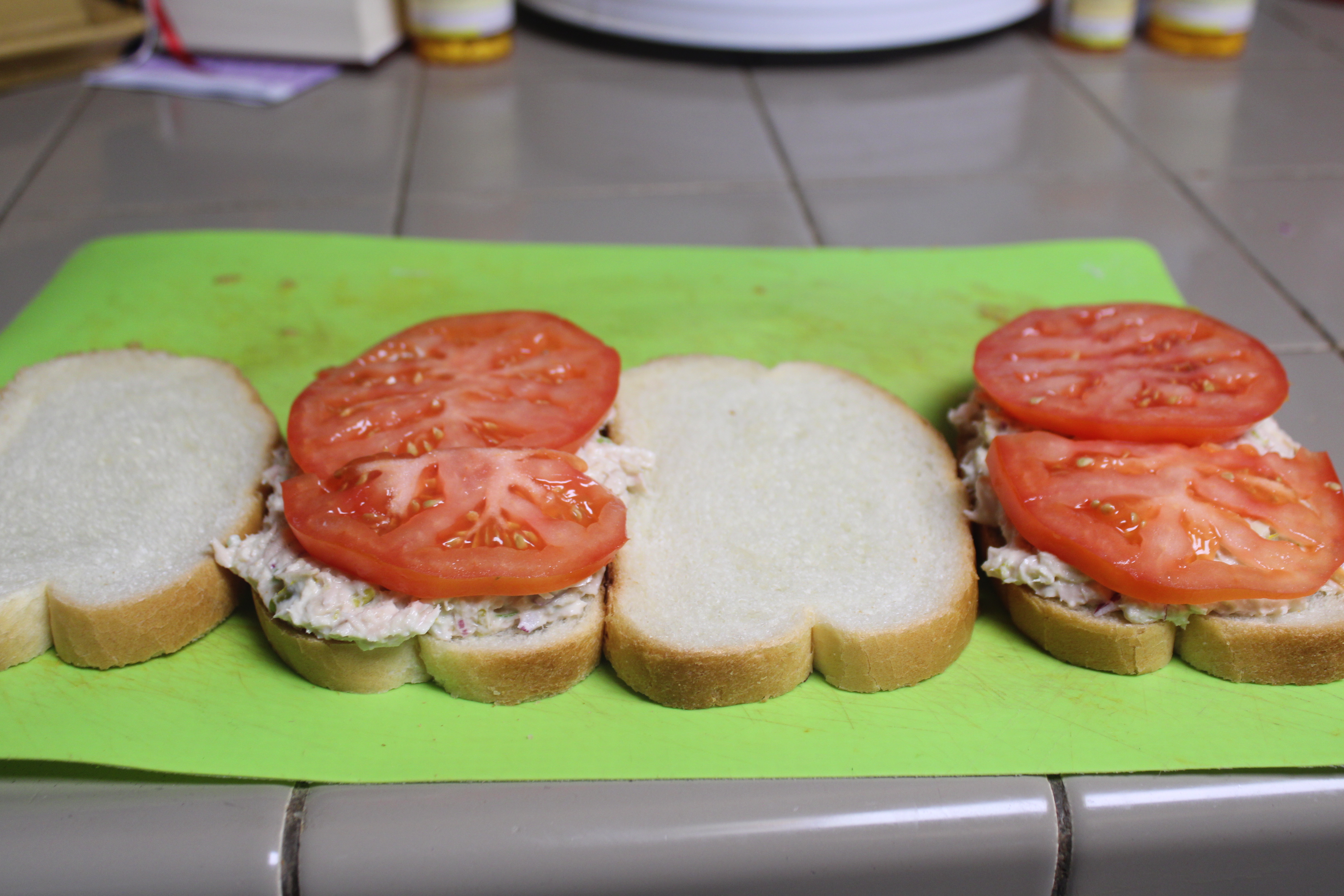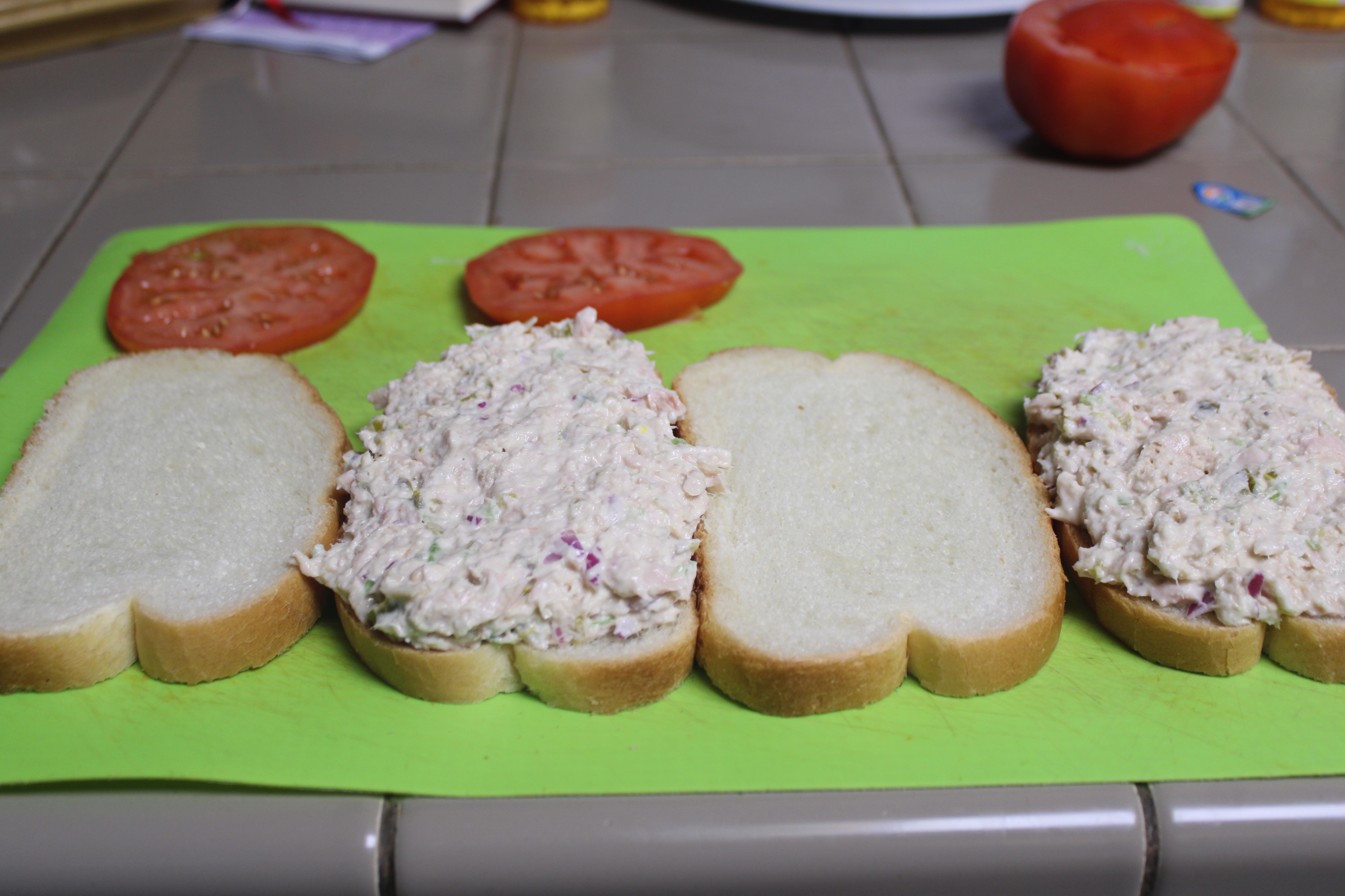 Butter 3 slices of sourdough bread, place butter side down. Spread each bread slice with tuna salad. Place 1 tomato slice on top of tuna salad then a slice of cheese over the tomato. Butter remaining slices of sour dough, place on top, butter side up.