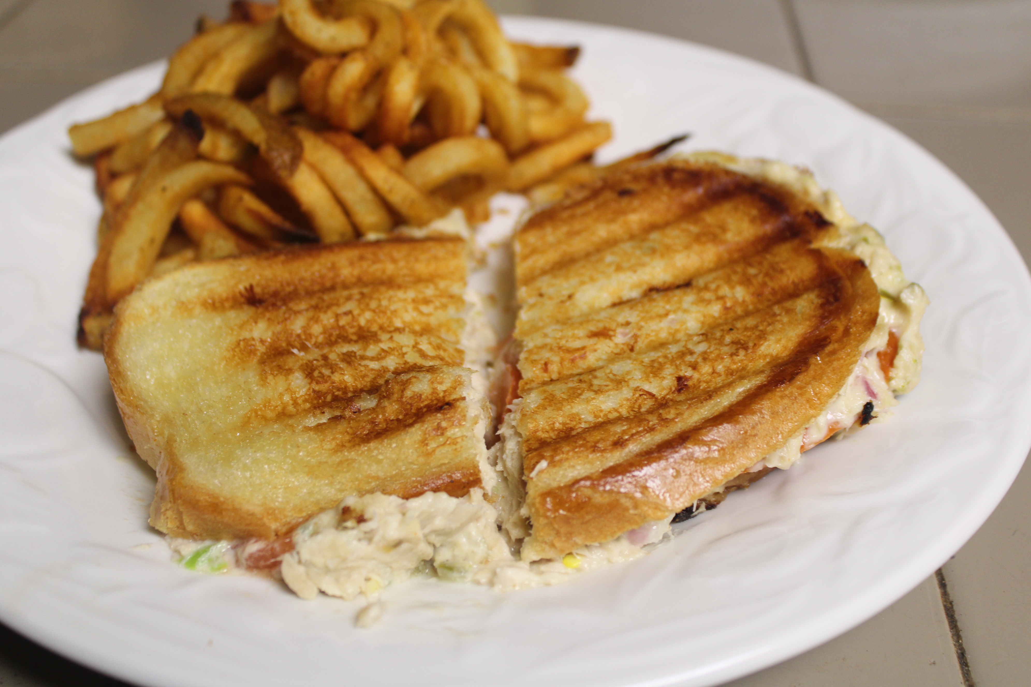 Heat Panini Grill. Once warm, grill Spicy Tuna Melts. Serve with fries.