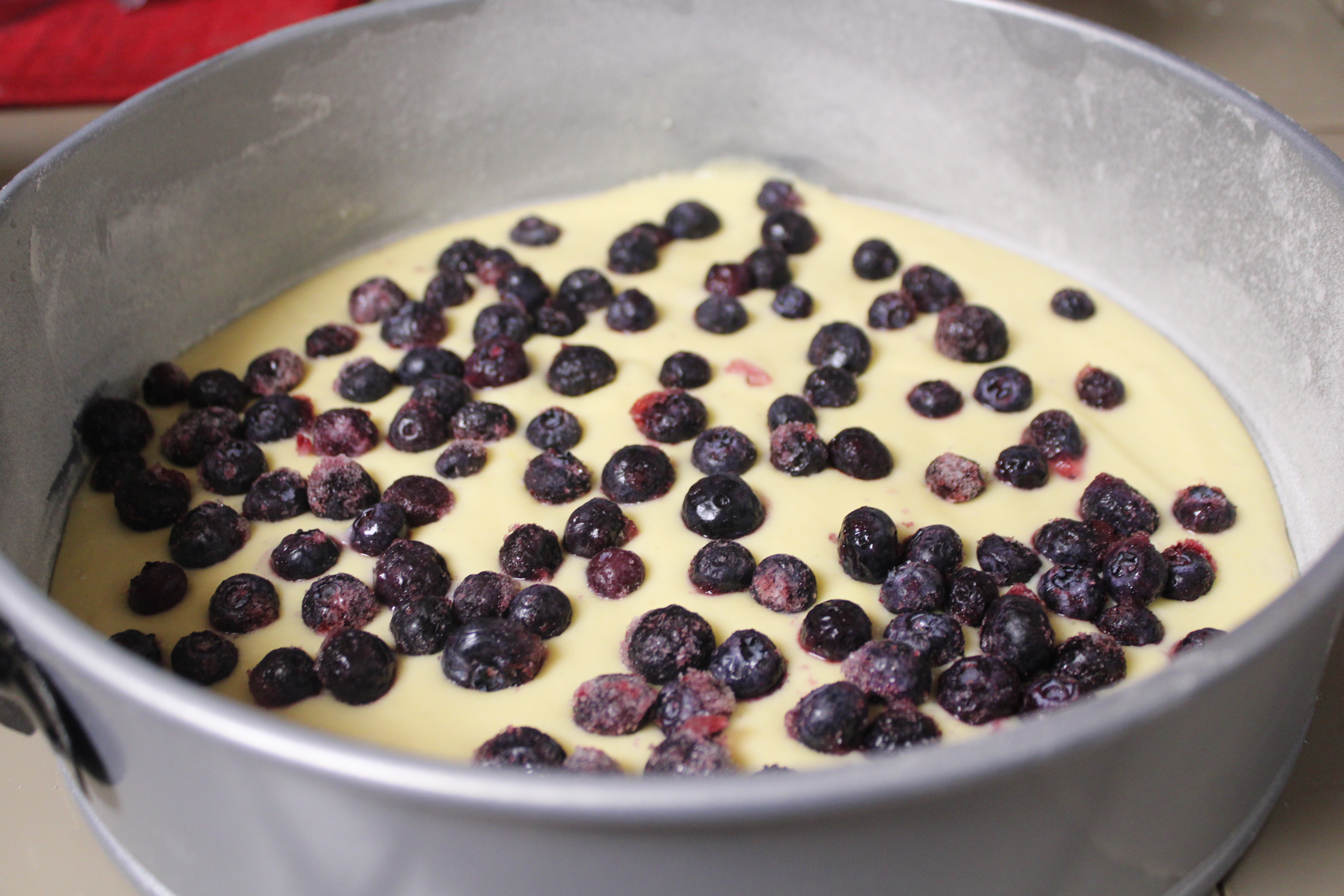 Fold in the sour cream. Spread half of batter into prepared pan. Sprinkle with 1-1/4 cups of blueberries, and top with remaining batter, smoothing top with an offset spatula.