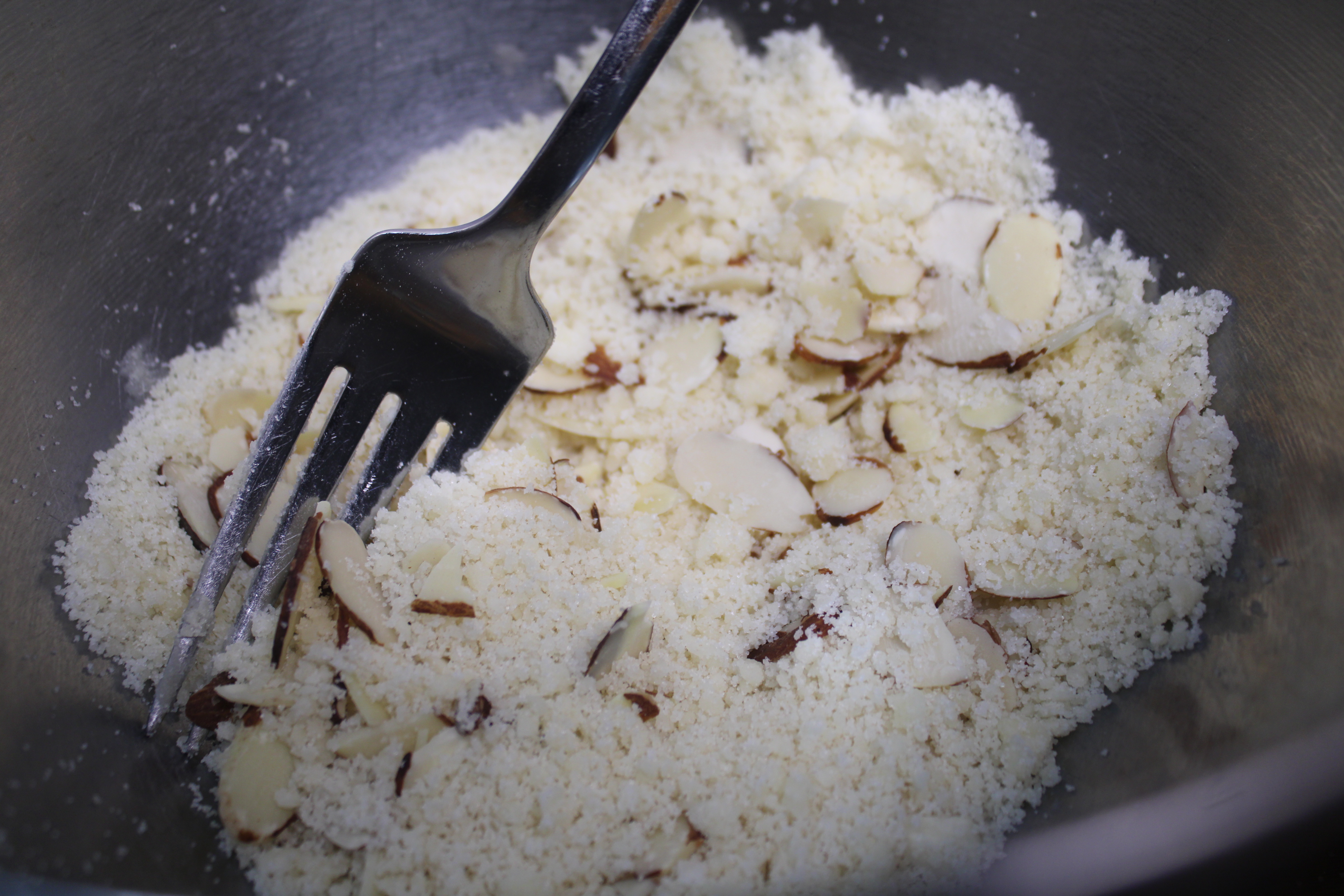 In a medium bowl, whisk together flour, sugar, and salt. Stir in butter until mixture is crumbly. Crumble with your fingertips until desired consistency is reached. Stir in almonds.